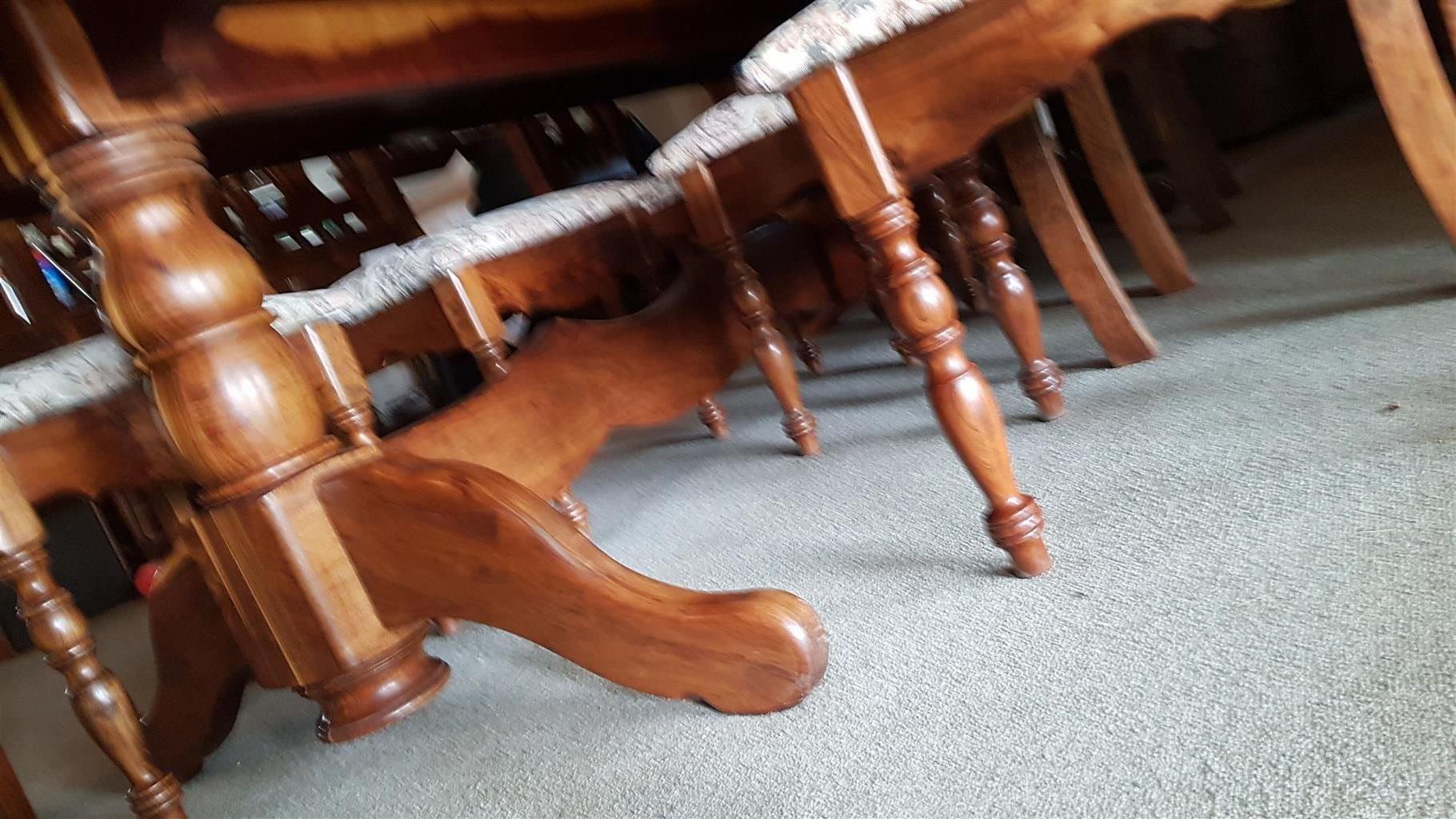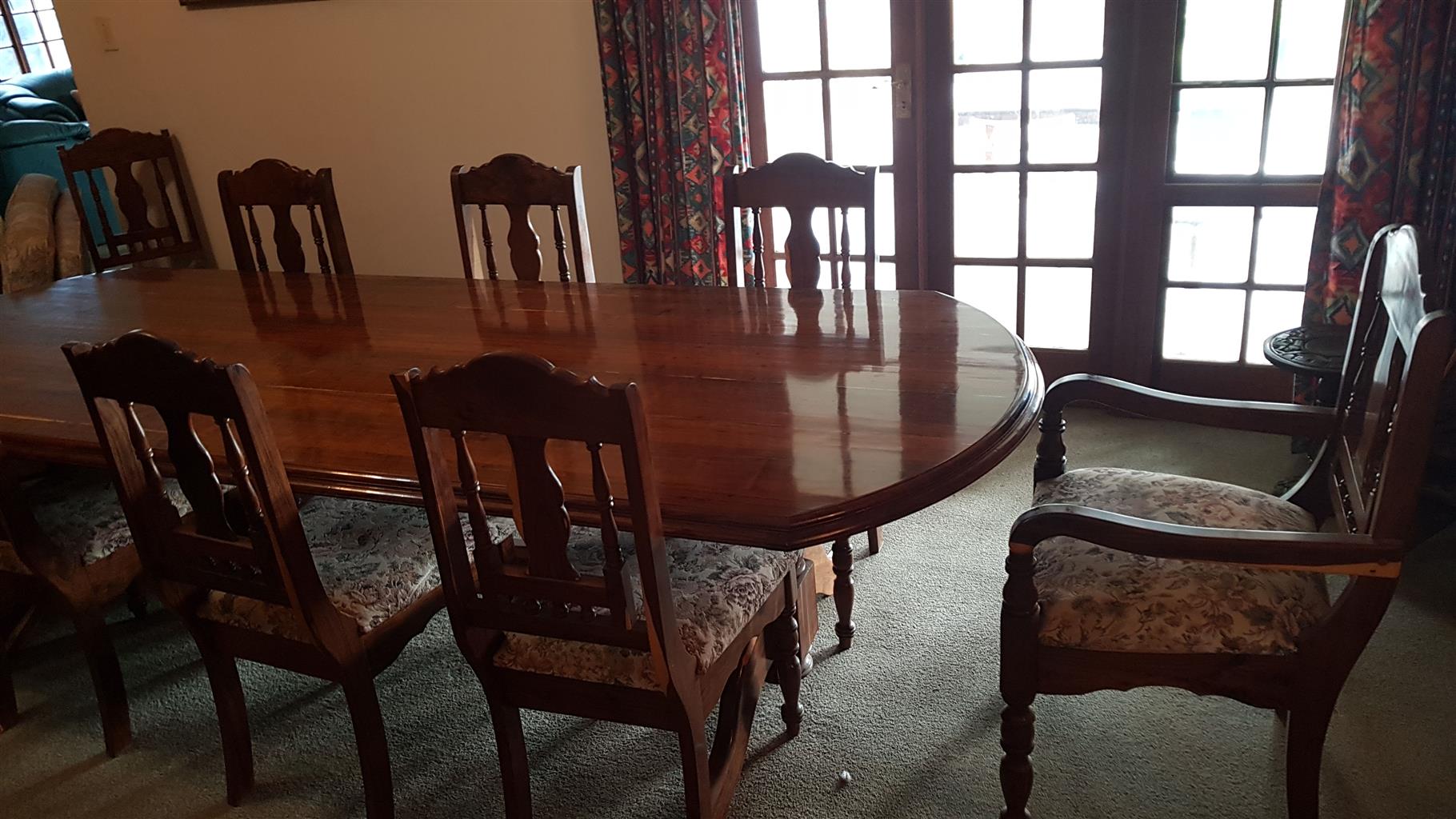 Beautifully made from indigenous Tambotie wood, beautiful grain, to last forever. Two head of table chairs with arms, and eight chairs. (Total 10) Perfect condition. We are downsizing to a much smaller home after 47 years in our home.