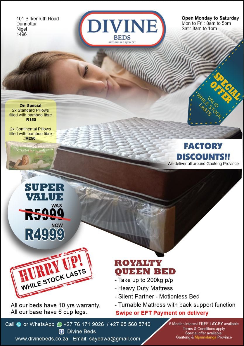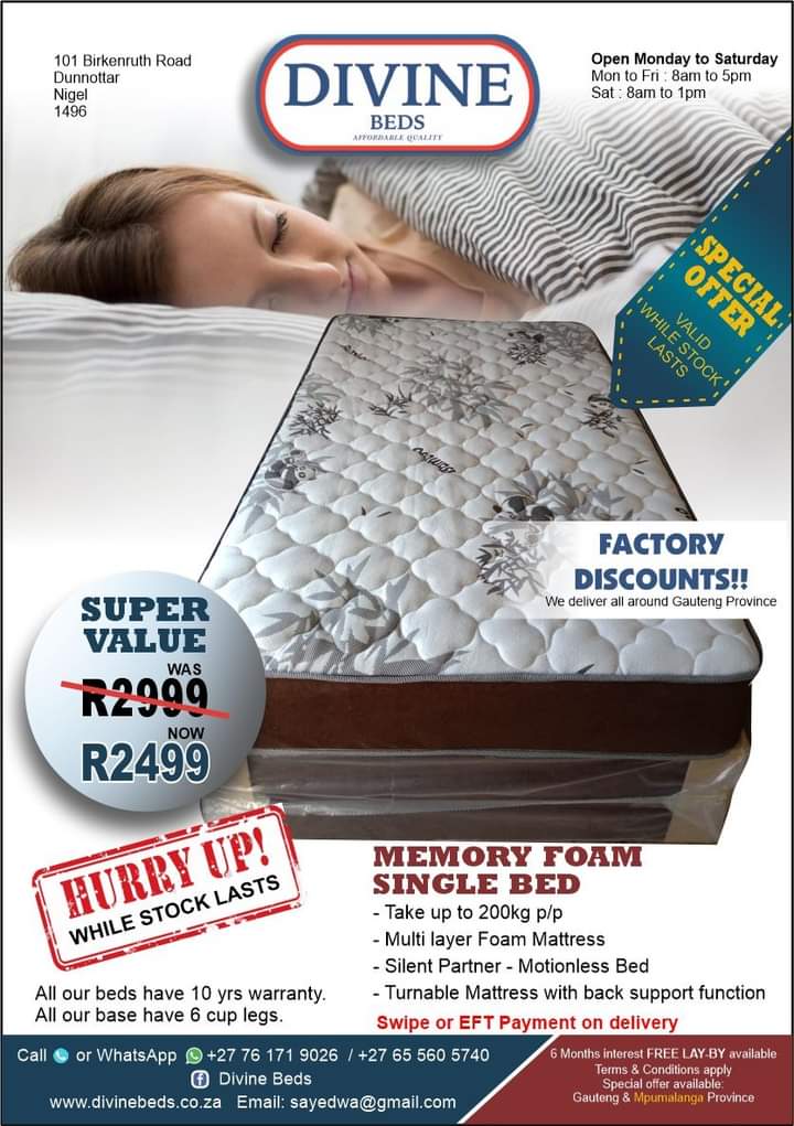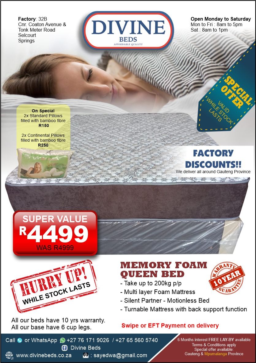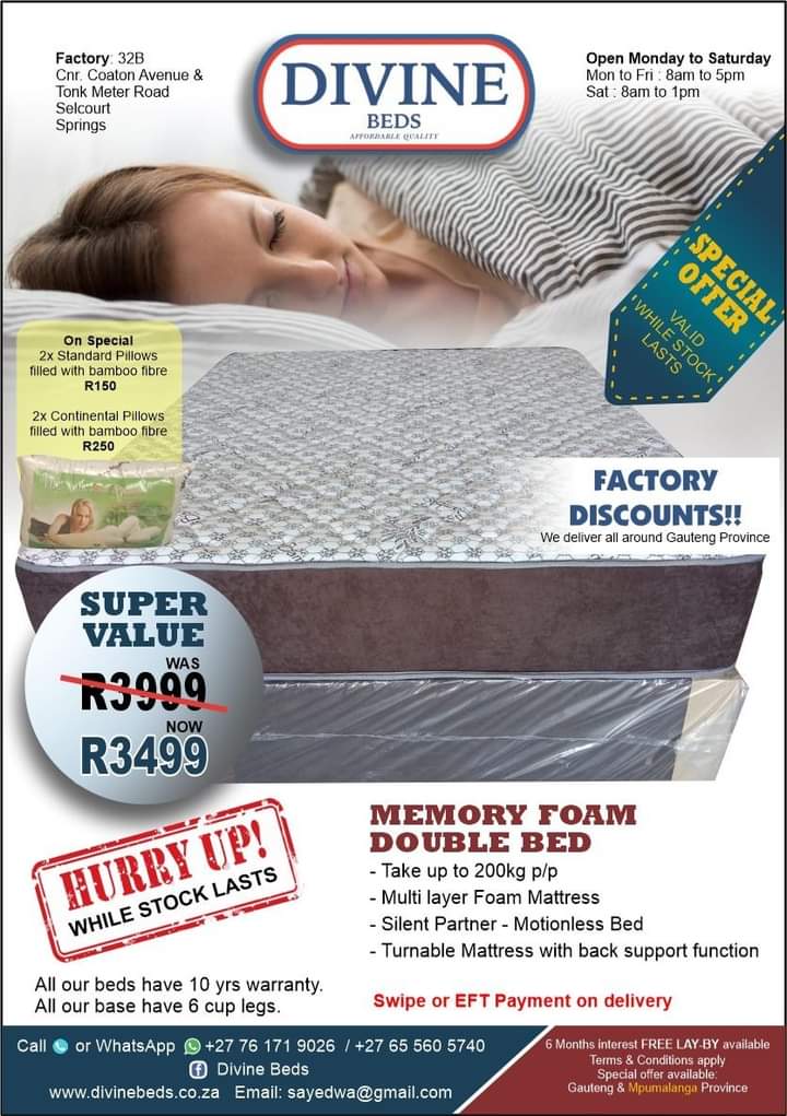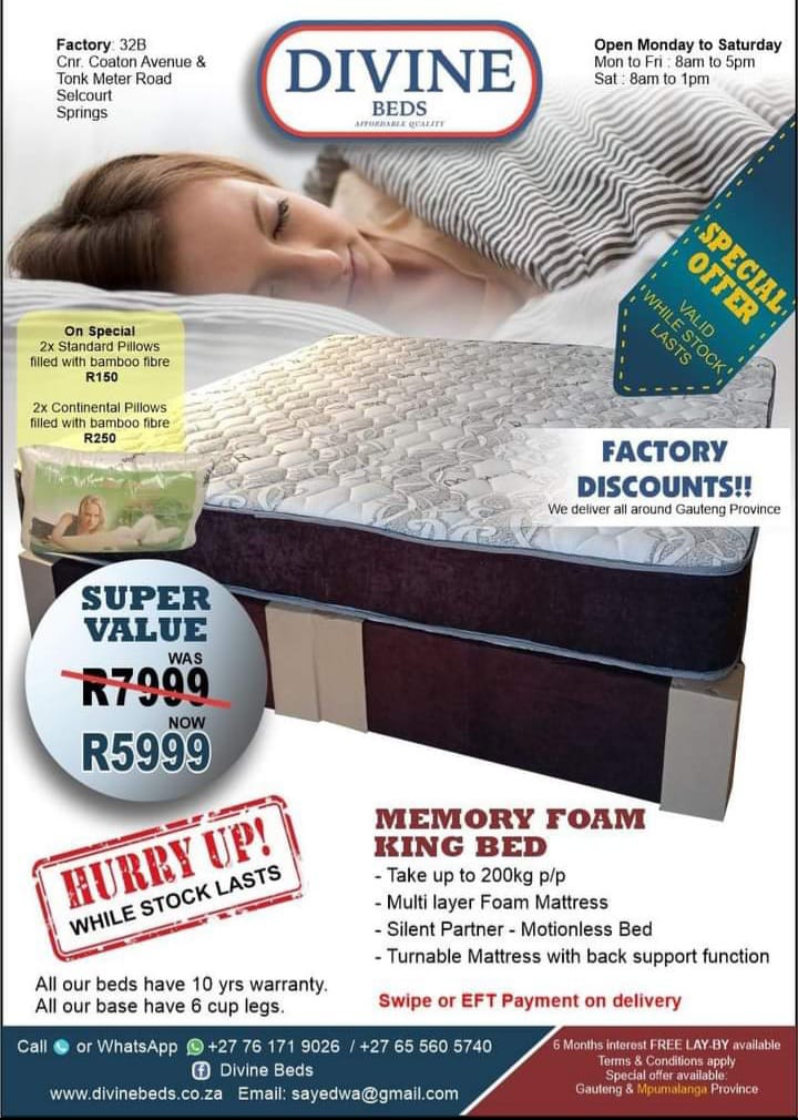 We make and supply Beds, Headboards and Couches at reduced price. We deliver to your home or you collect at factory www.divinebeds.co.za