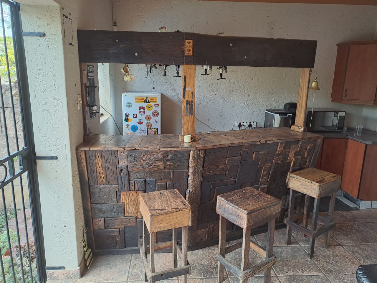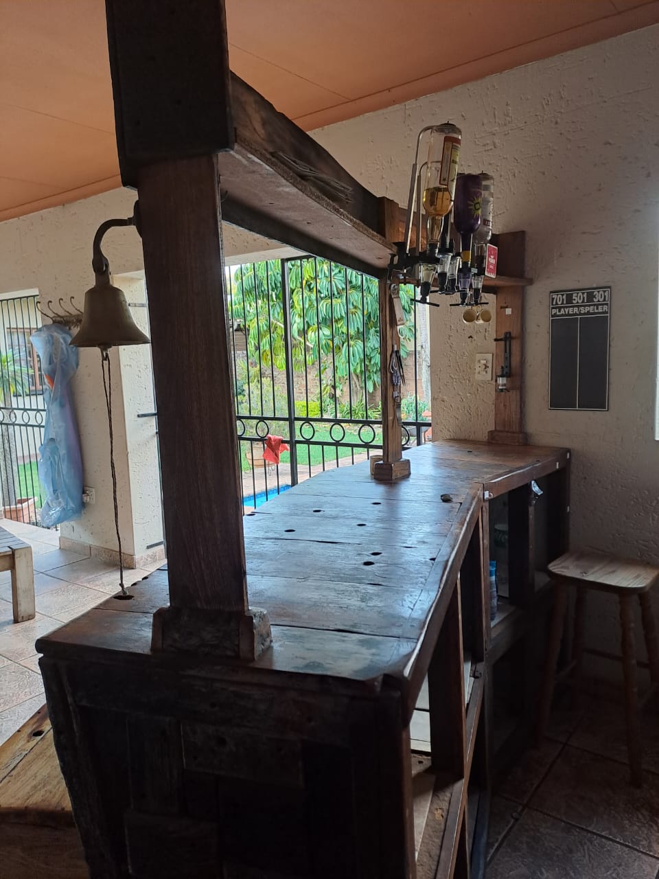 Sleeper wood bar for sale inluding chairs and bottle dispensers.