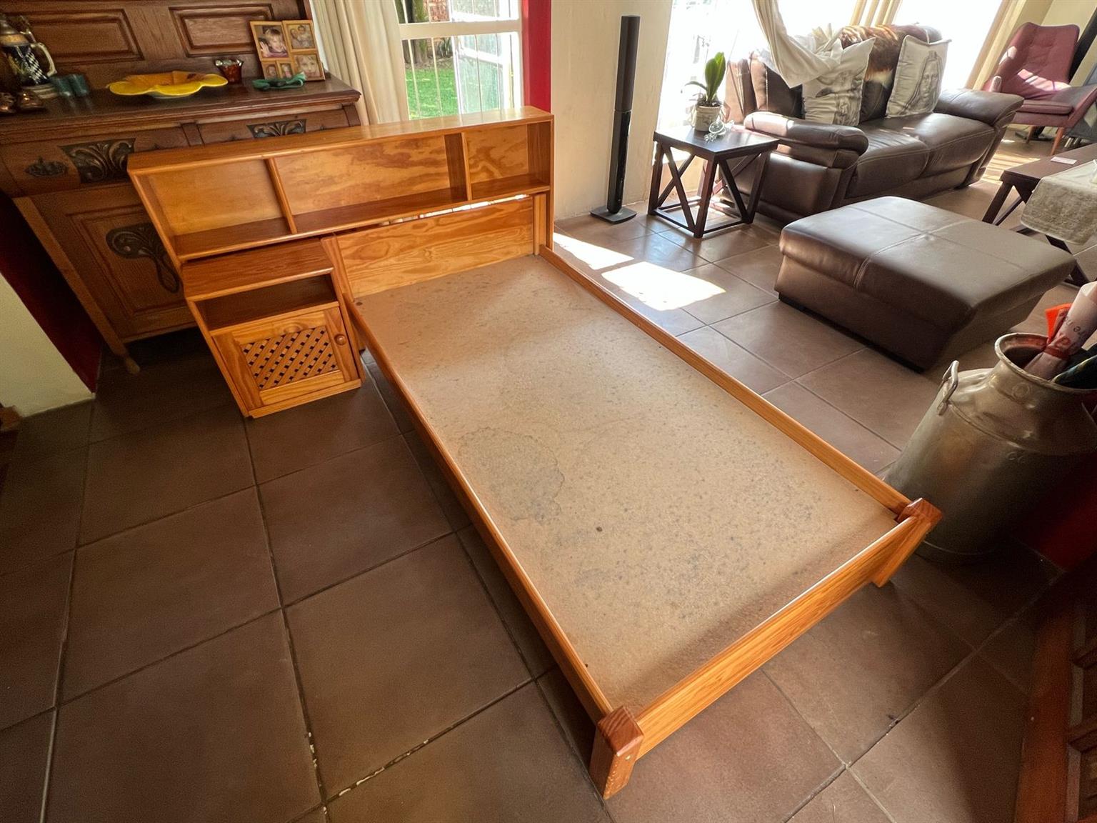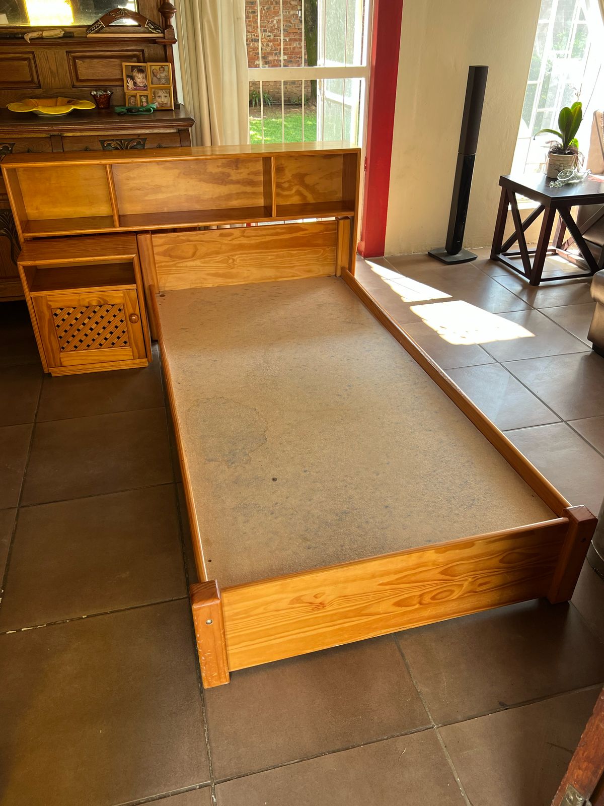 Wood bed set in good condition comprising bed base, head board and pedestal. Pedestal can be used either sides of the bed. Bed is low so it is especially good for kids.