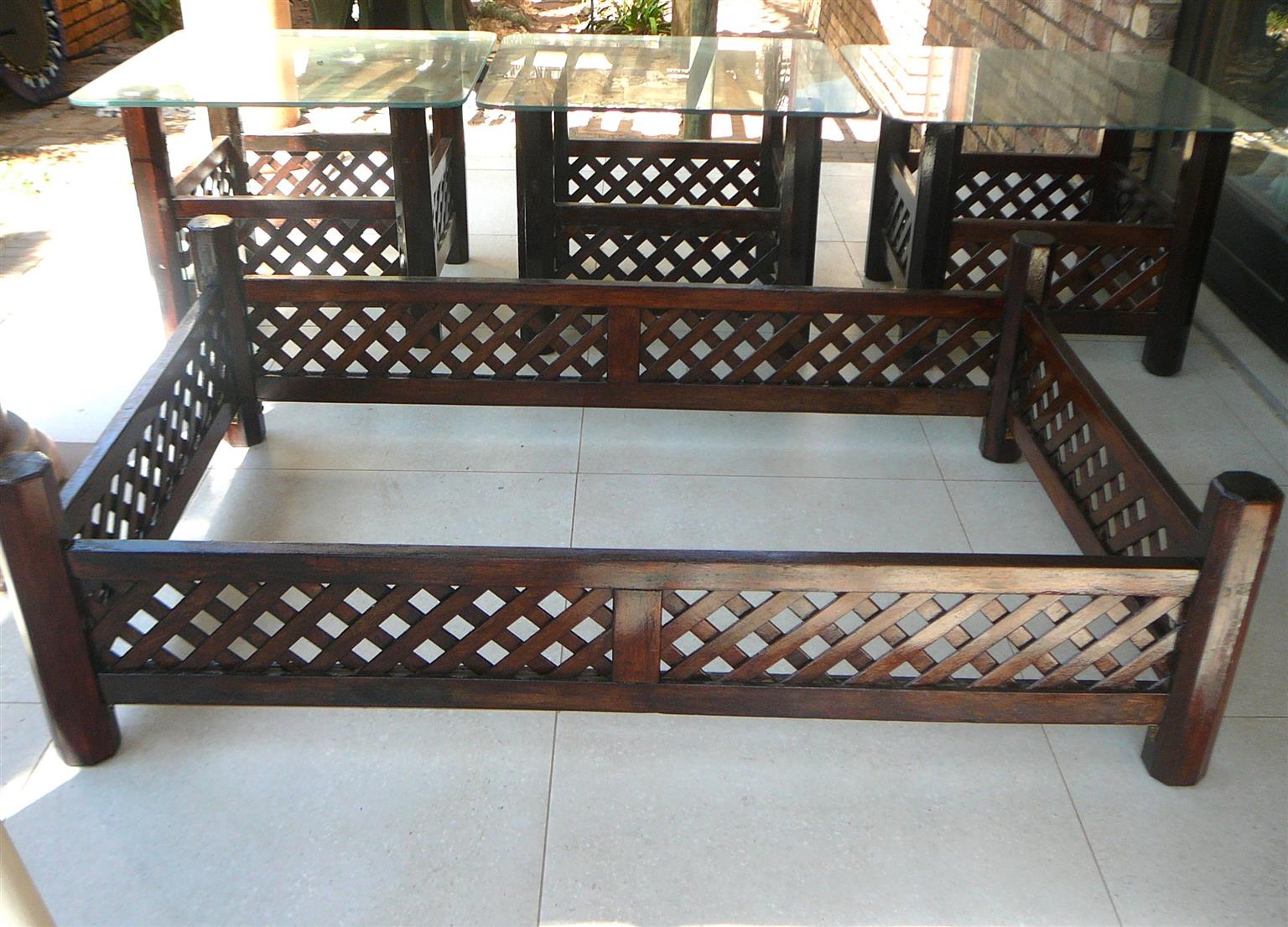 COFFEE TABLE SOLID WOOD AND 3 MATCHING LAMP TABLES INDOOR OR OUTDOOR UV PROTECTED 10MM SOLID GLASS TOPS COFFEE TABLE 1,500MMX1,000 MM LAMP TABLES ,700MMX,700MM SQUARE GLASS FOR TABLE IN STORAGE NOT NOW ON TABLE TOO HEAVY TO PUT ONTO TABLE BUT AVAILABLE