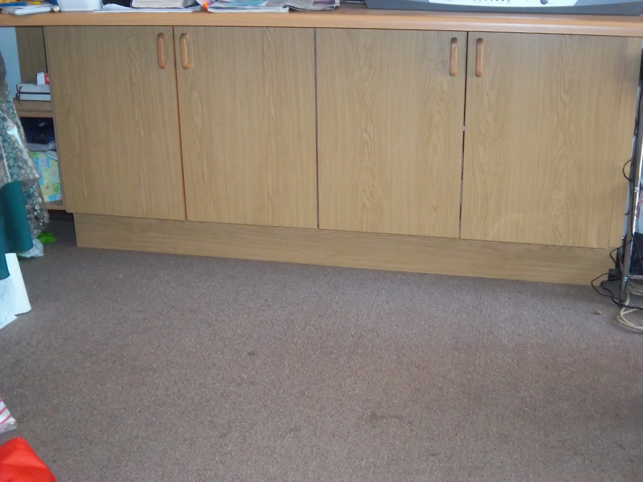 WALL UNIT: 4 Doors & Corner Piece; Cabinets 300 mm deep; Top 2165 x 600 mm; Light Oak coulour; Ideal for needle work/Office work/ General used; As new.
