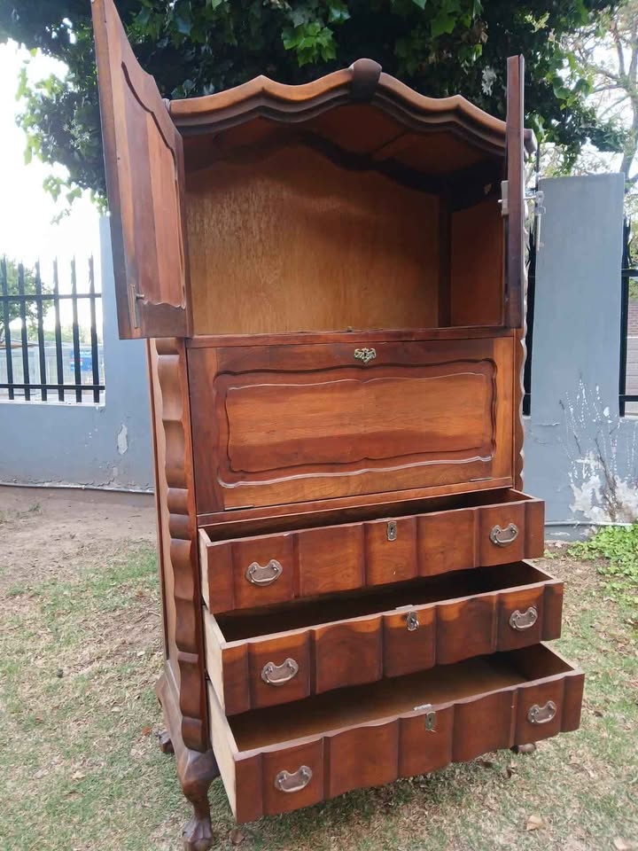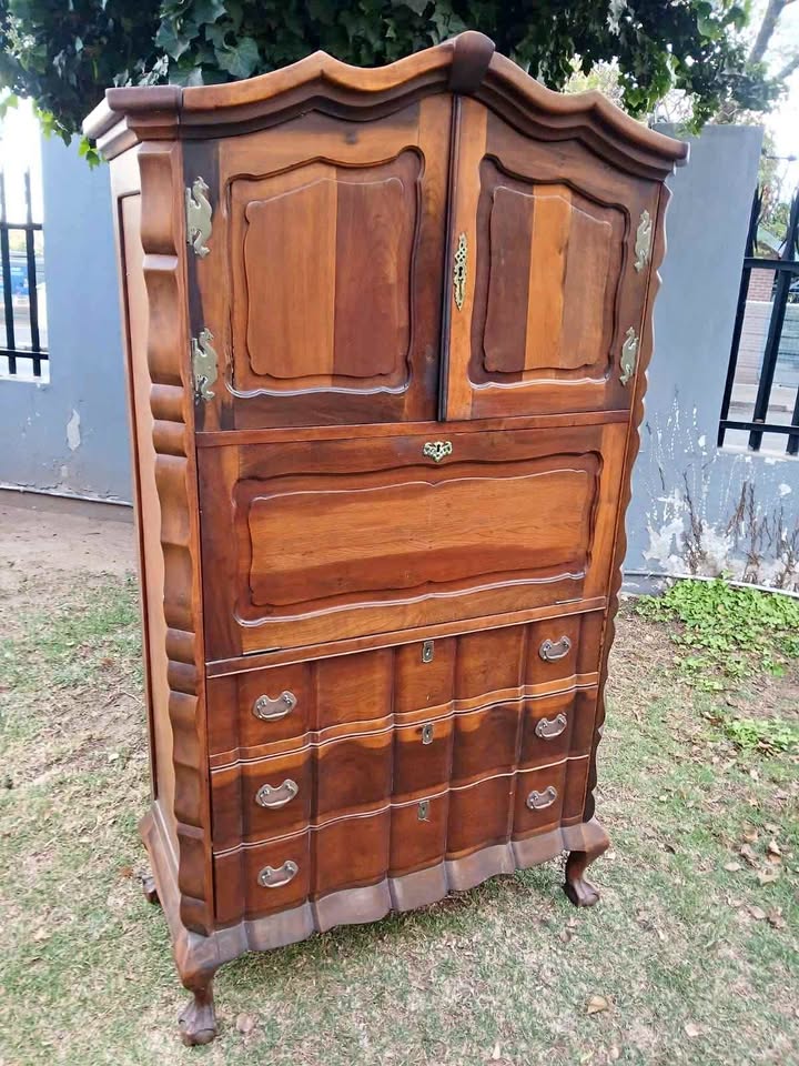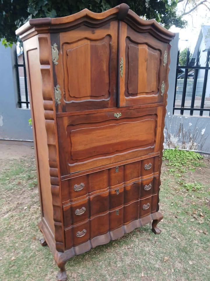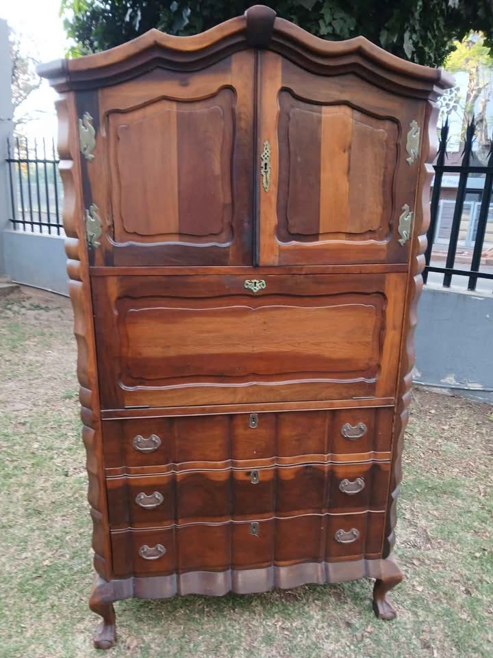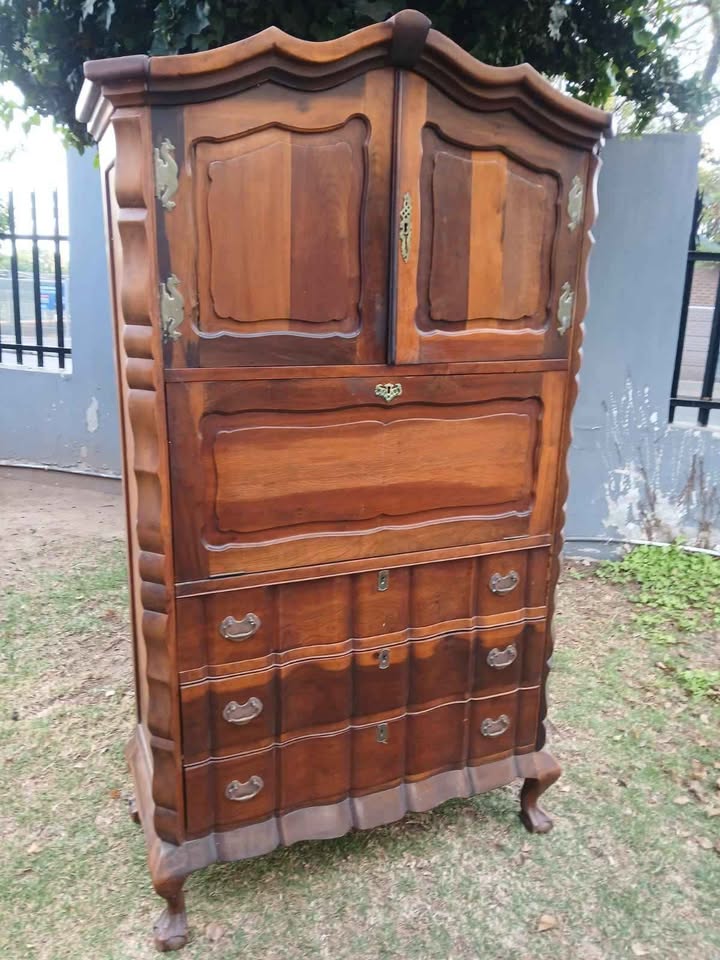 Elegant handcrafted armoire featuring ornate carved details, curved drawers, and brass handles. Offers ample storage with upper cabinet doors and spacious lower drawers — a timeless addition to any classic interior.