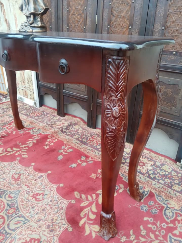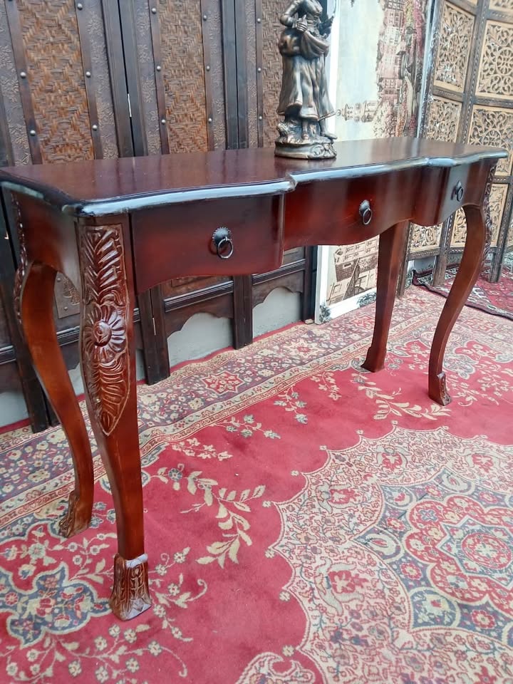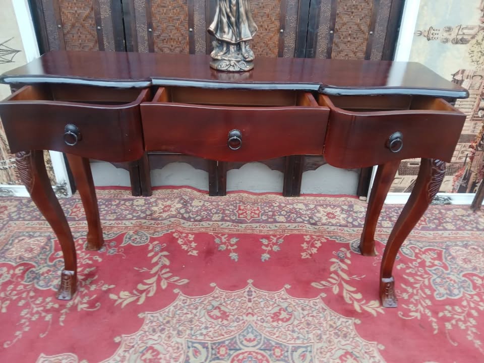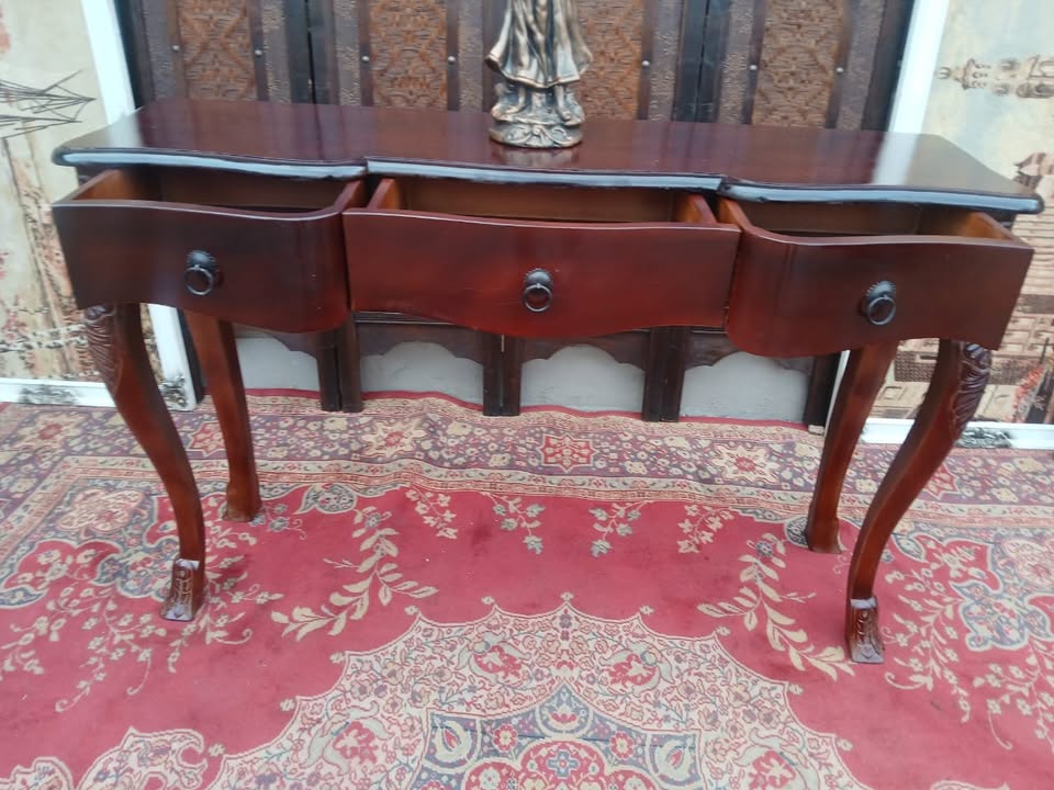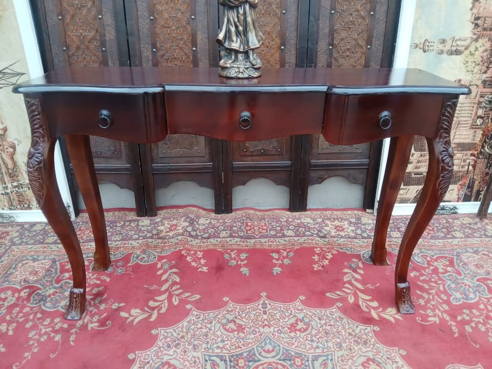 Elegant mahogany console table featuring three drawers with antique-style knobs and beautifully carved cabriole legs. A refined piece ideal for an entryway, hallway, or living space, adding classic charm and functional storage.