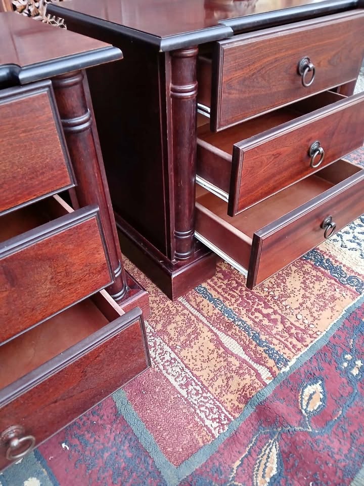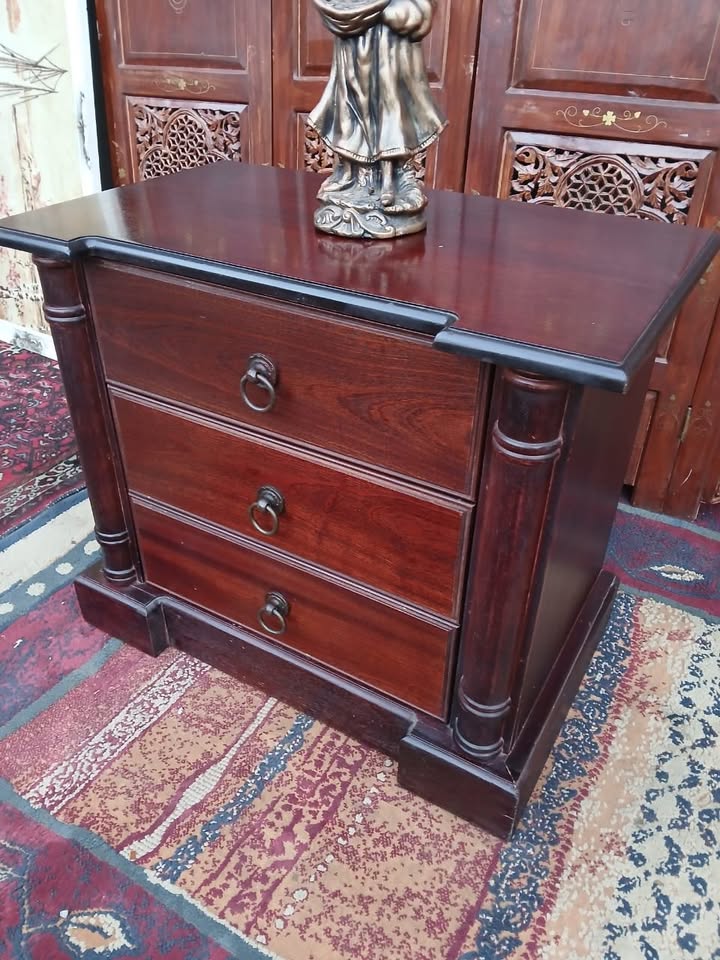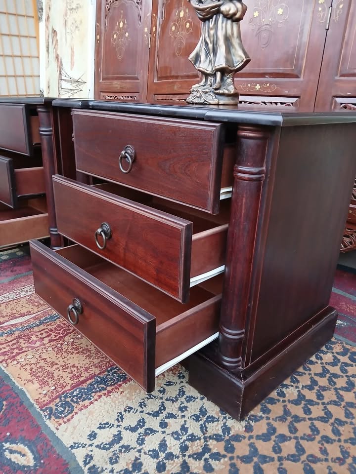 🔸 Deep reddish-brown wood tone 🔸 Unique carved side pillars 🔸 3 drawers with classic metal rings 🔸 Sturdy and elegant piece – full of character 🔸 Great for bedrooms, lounges, or entrances 💰 Price: R3000 (per unit) 📍 Location: Randburg 📞 Contact: Statue not included. Delivery can be arranged at an additional cost.