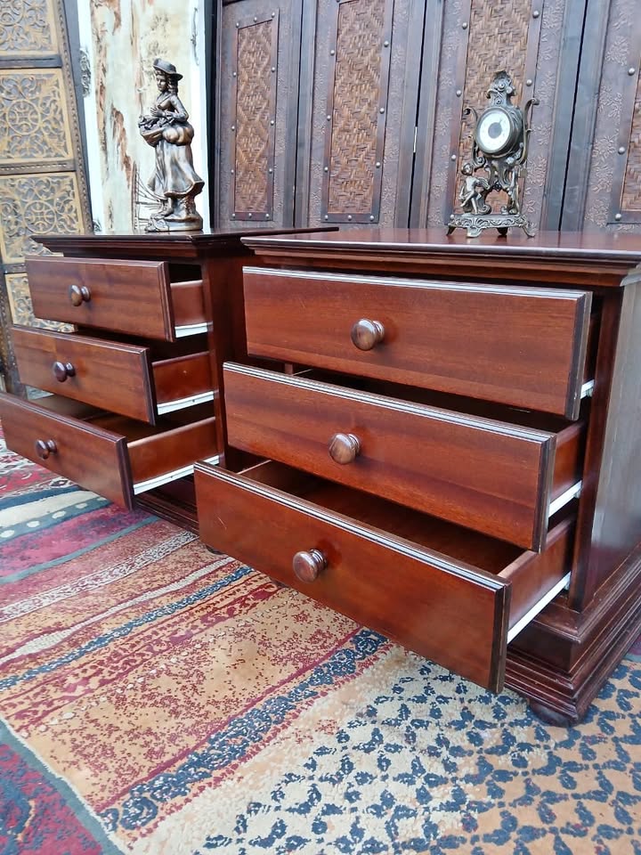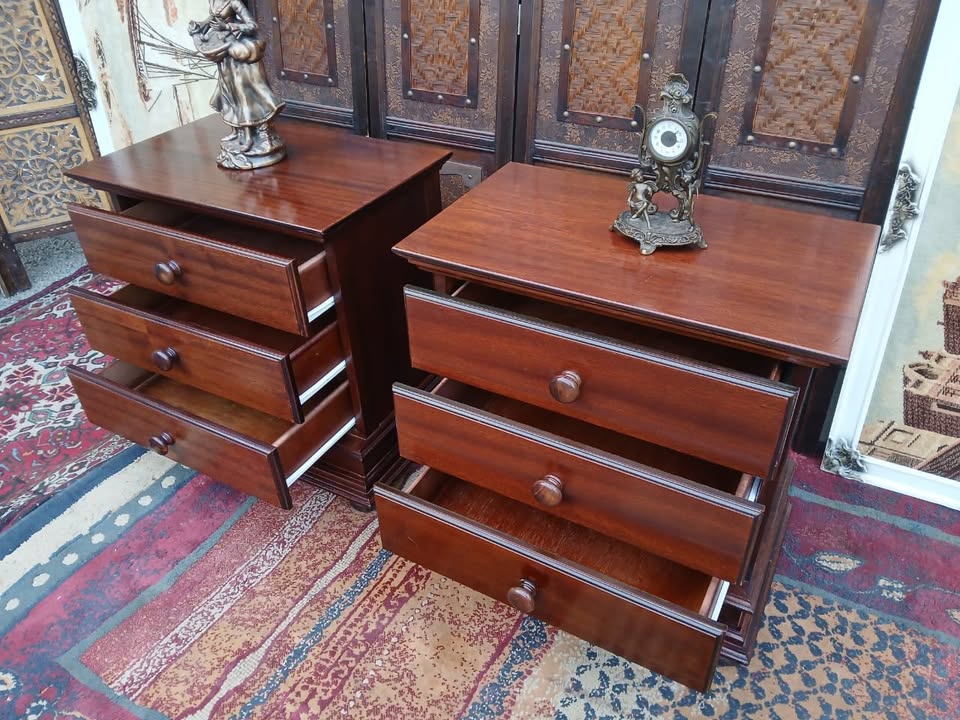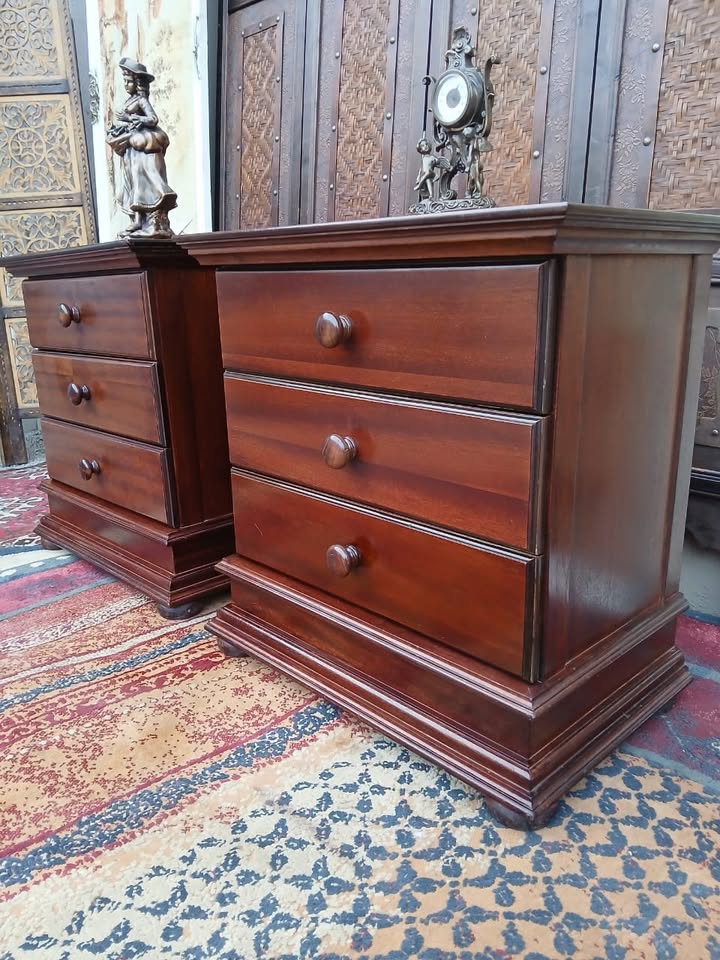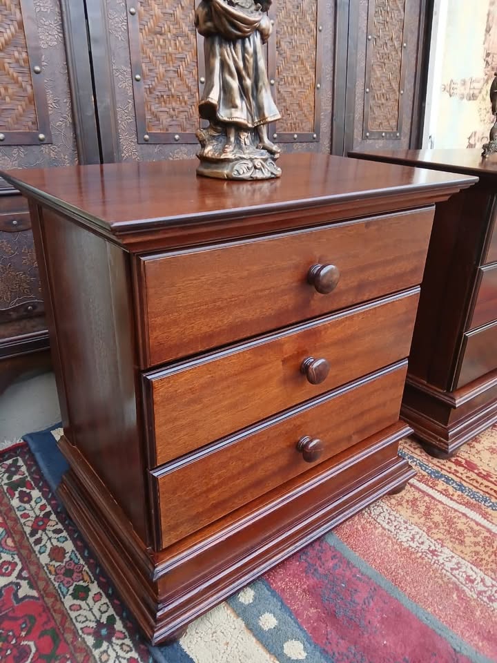 Elegant three-drawer bedside table in rich mahogany finish. Price is for each unit.