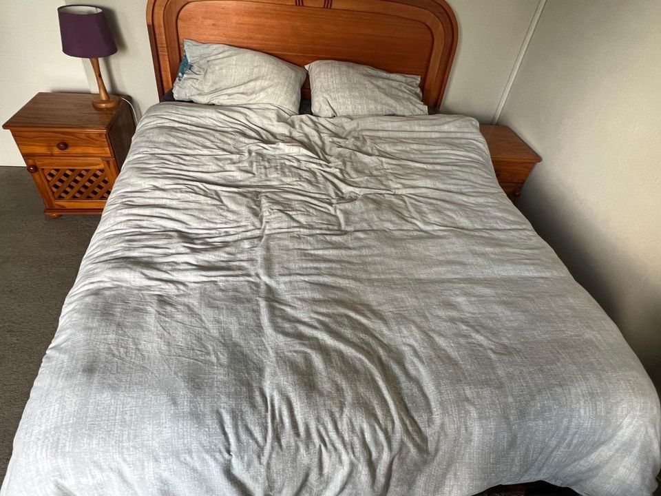 Upgrade your bedroom with this Queen Size Bedroom Set, featuring everything you need for comfort and style. Perfect for a modern or classic aesthetic, this set offers quality, durability, and a great night’s sleep. Included in the Set: 1. Queen Size Mattress: • Comfortable and supportive for a restful sleep. • Clean and well-maintained 2. Queen Size Base: • Sturdy and reliable to provide excellent mattress support. • Neutral design to suit any bedroom decor. 3. 2 Matching Side Tables: • Compact and stylish for bedside essentials. 4. Headboard: • Wood This complete bedroom set is perfect for those looking to furnish their space effortlessly. The cohesive design ensures your room looks stylish and inviting.