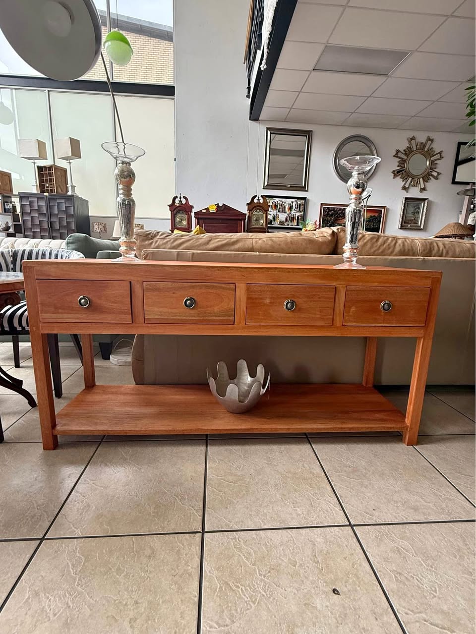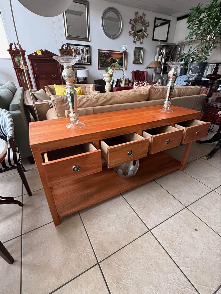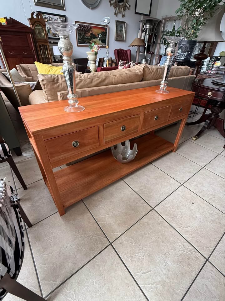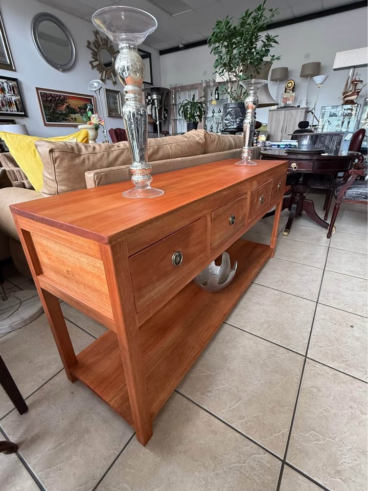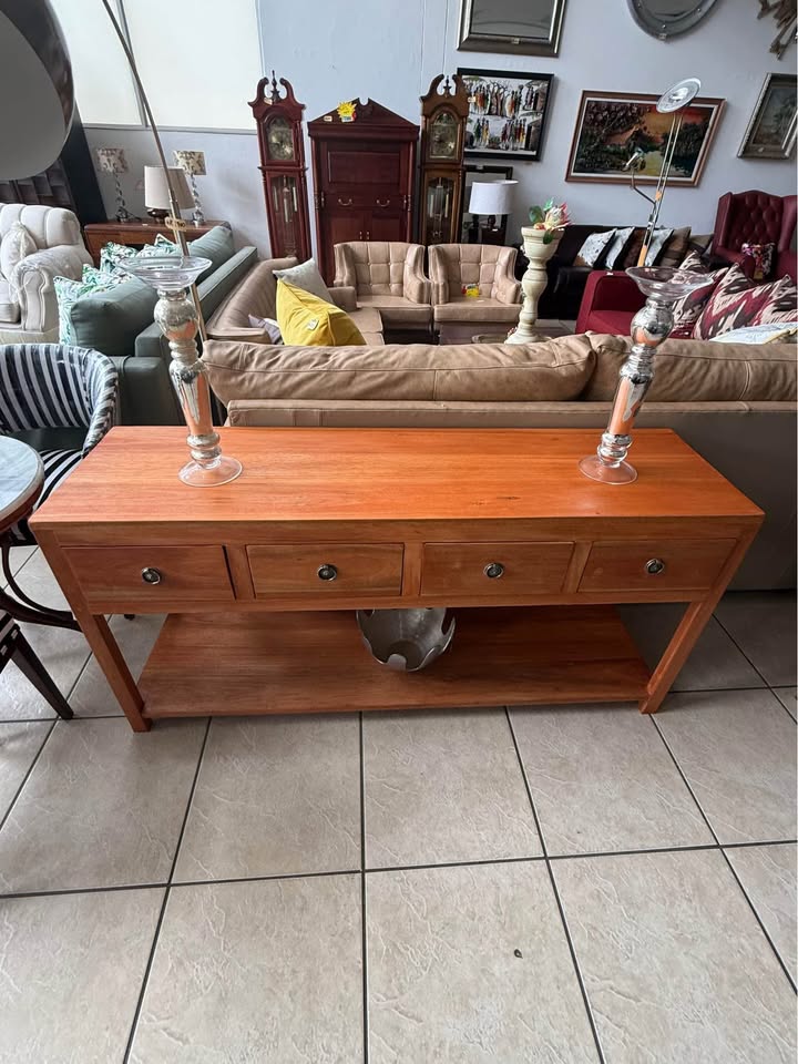 Made from Seligna wood. Features four spacious drawers with classic metal handles and a large bottom shelf for extra storage or display. Measurements: 1600 (L) x 450 (W) x 770 (H). Address is: DKY Elements, Shop # 70, Northlands Deco Park, Nothriding, nearest corner Witkoppen & Newmarket Roads.