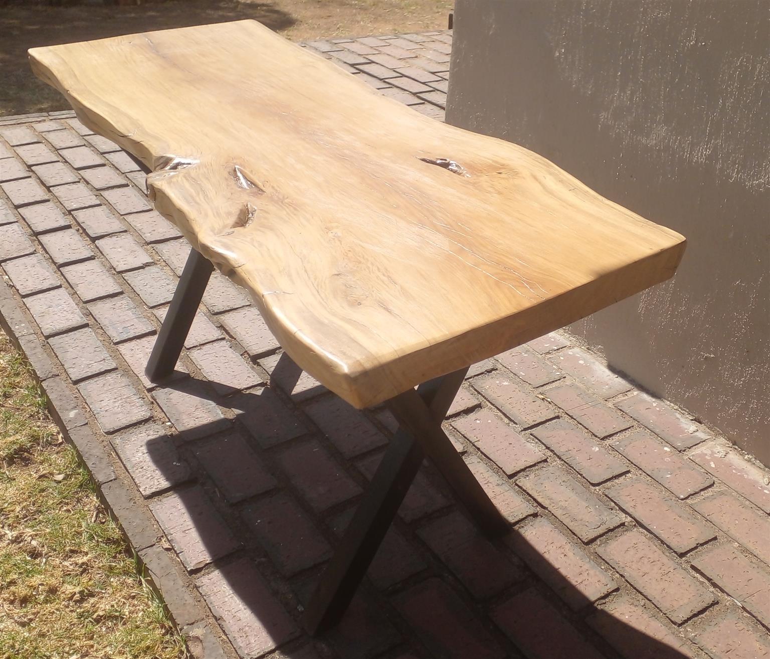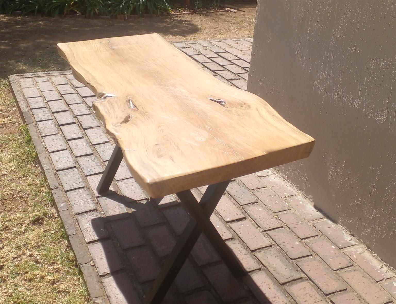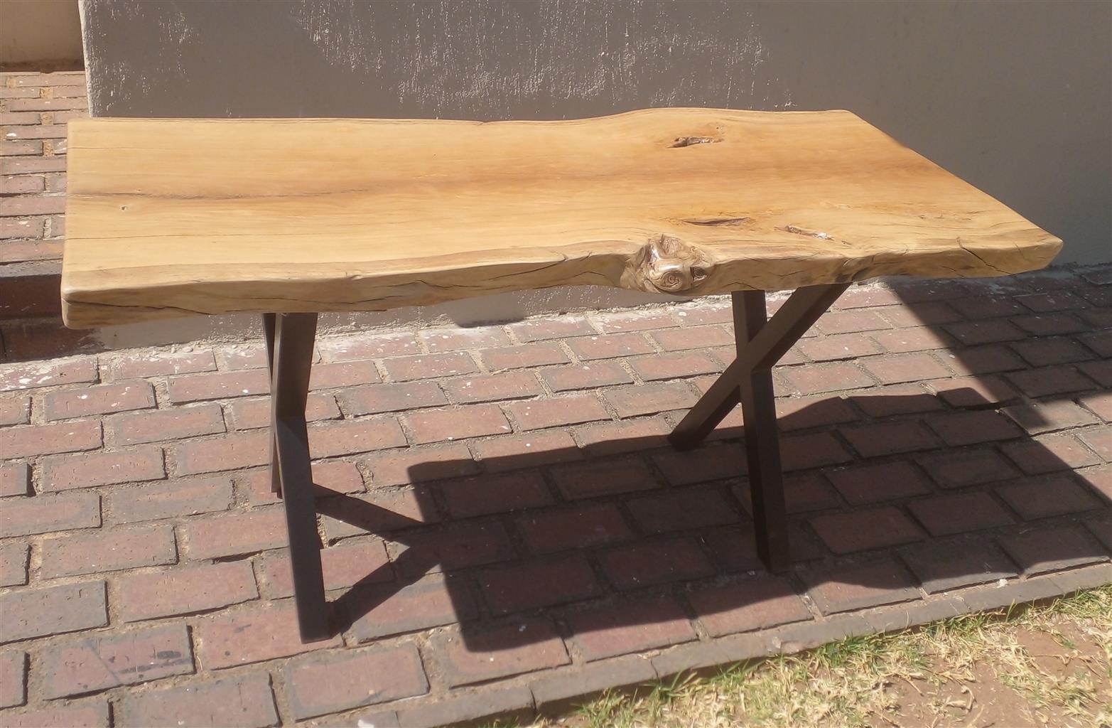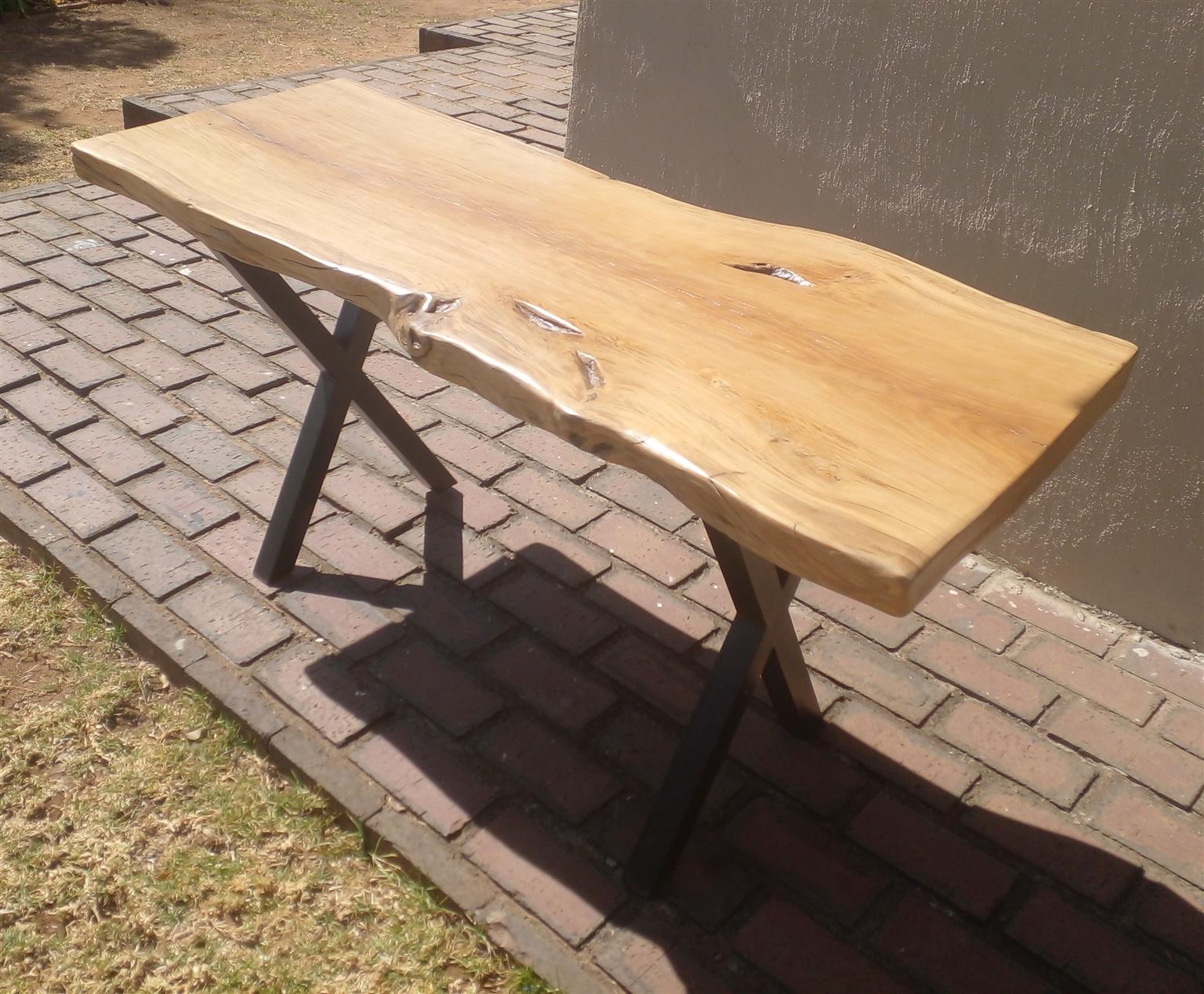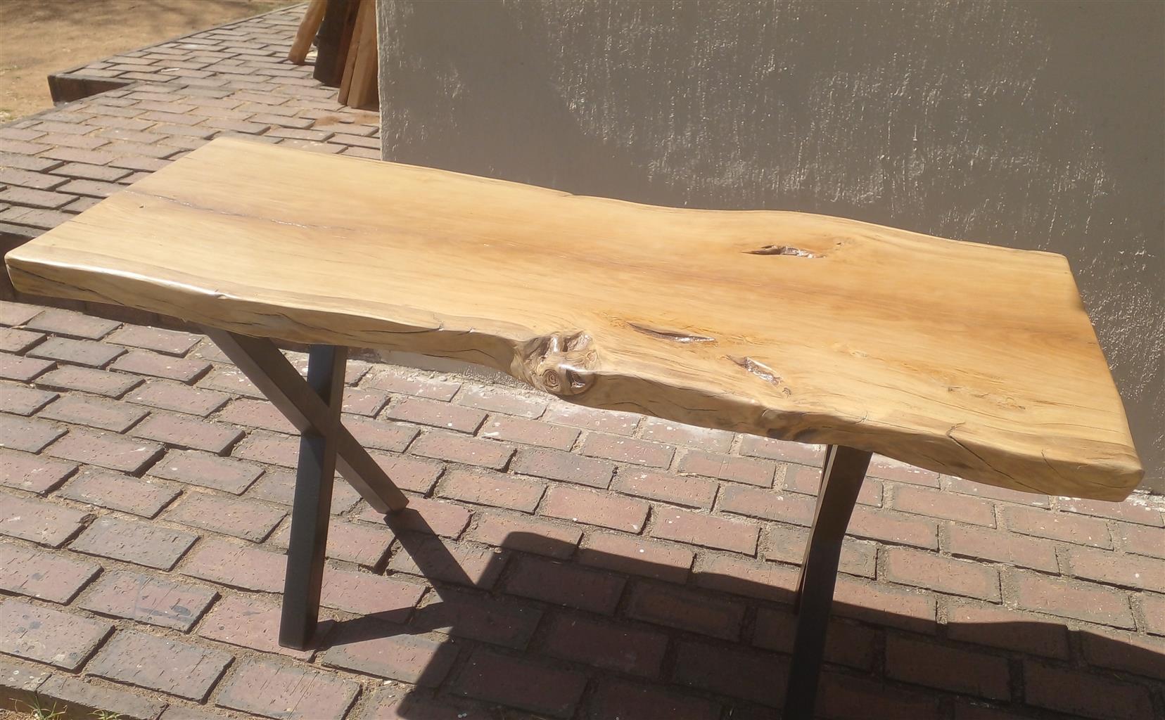 Unique Live Edge Console Table made from Matumi Hardwood. 156 cm long x 64 to 56 cm wide x 77 cm high at R2800. Ready for immediate delivery. Call me or chat to view in Strydom Park. 0607435582view more