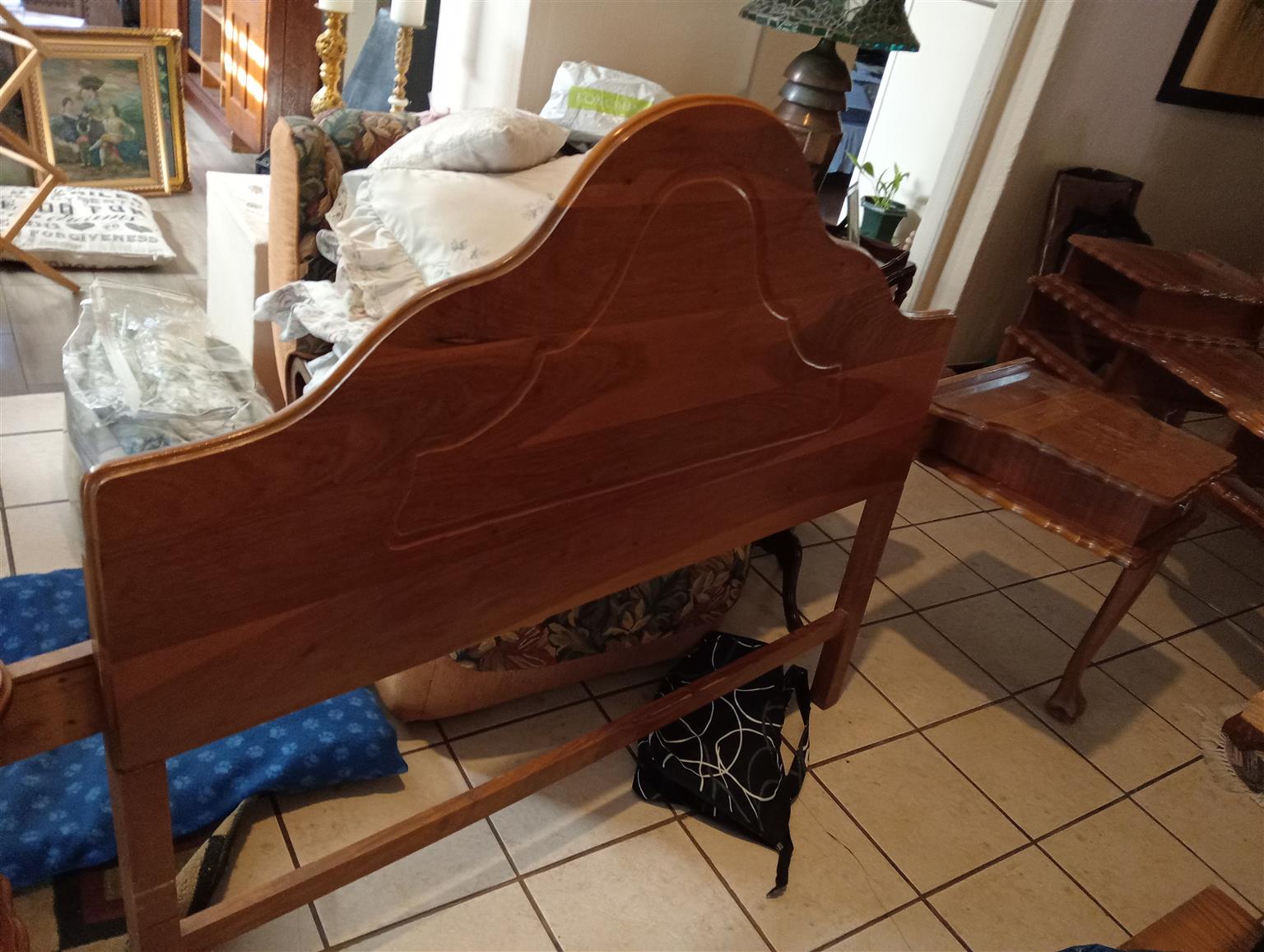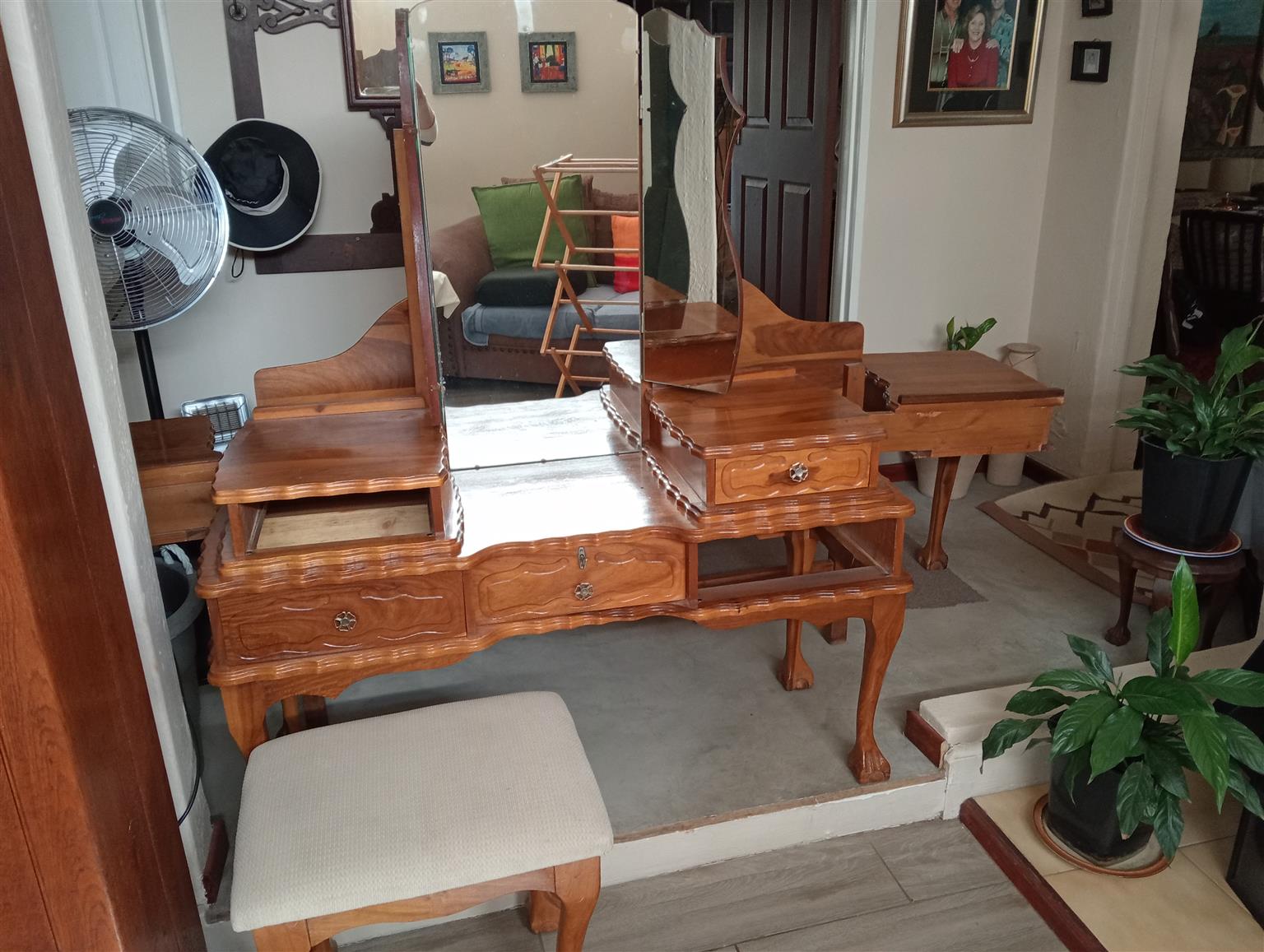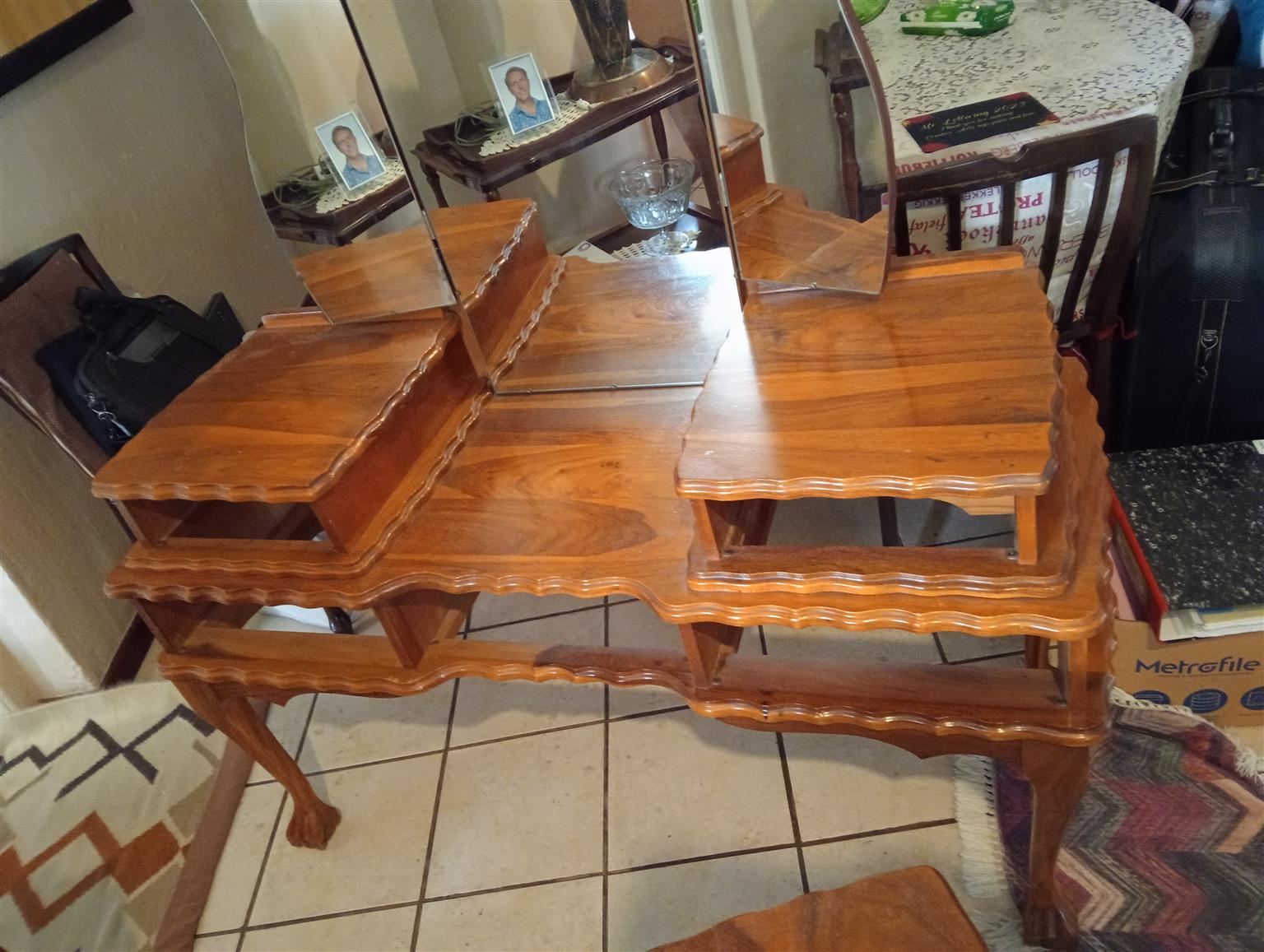 Dressing table and chair with headboard.