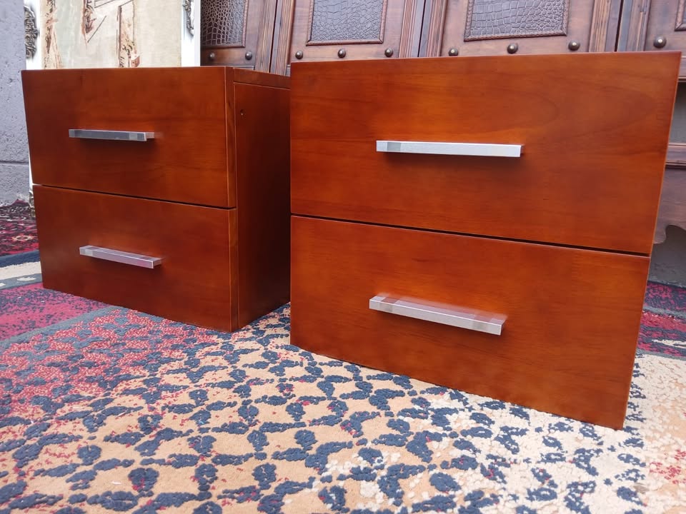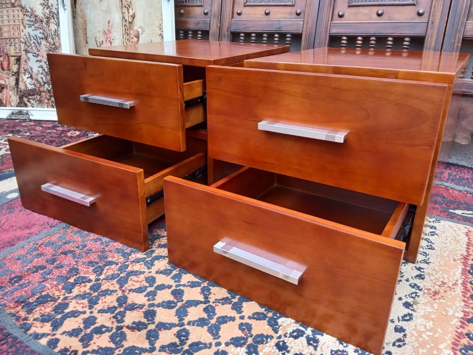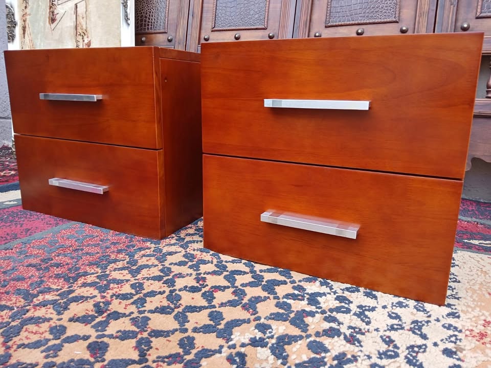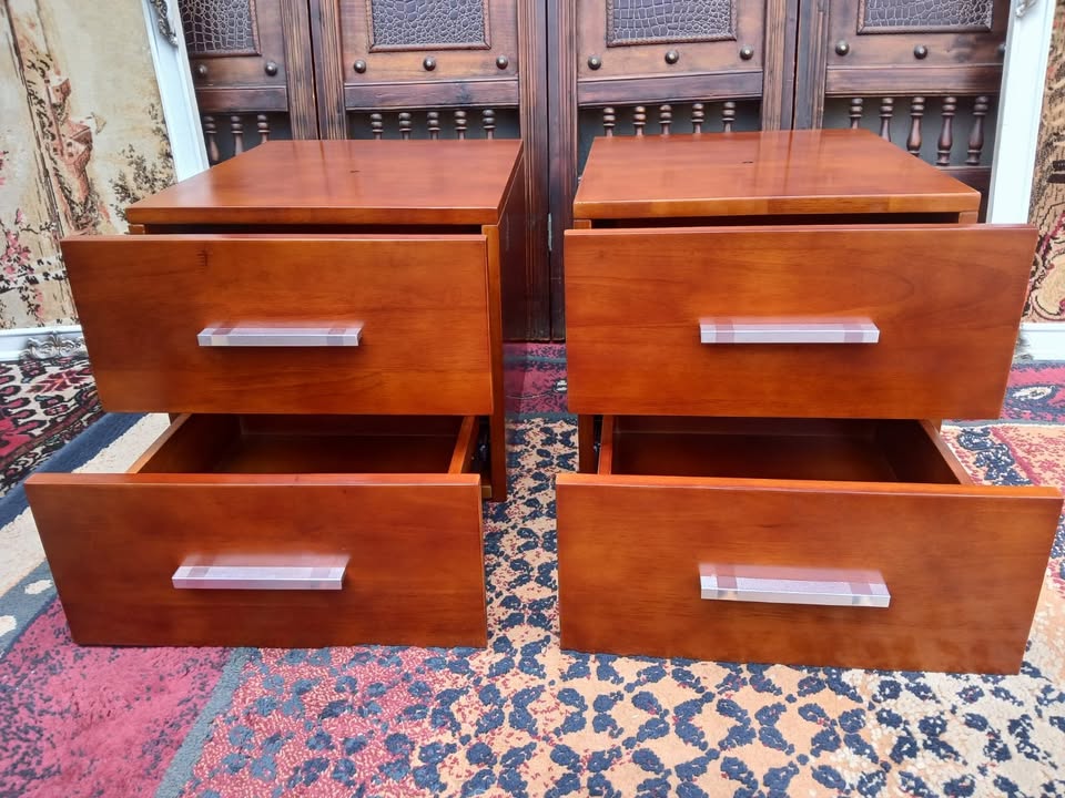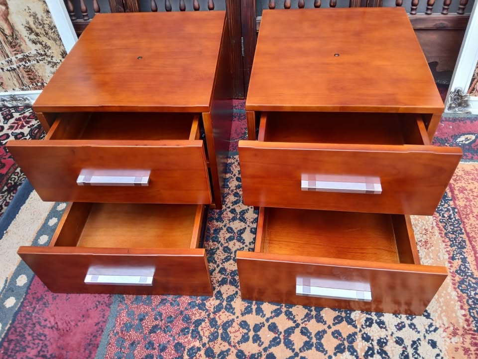 Two matching nightstands with two drawers each, featuring silver handles. Crafted from dark wood. Price: R1,000 each