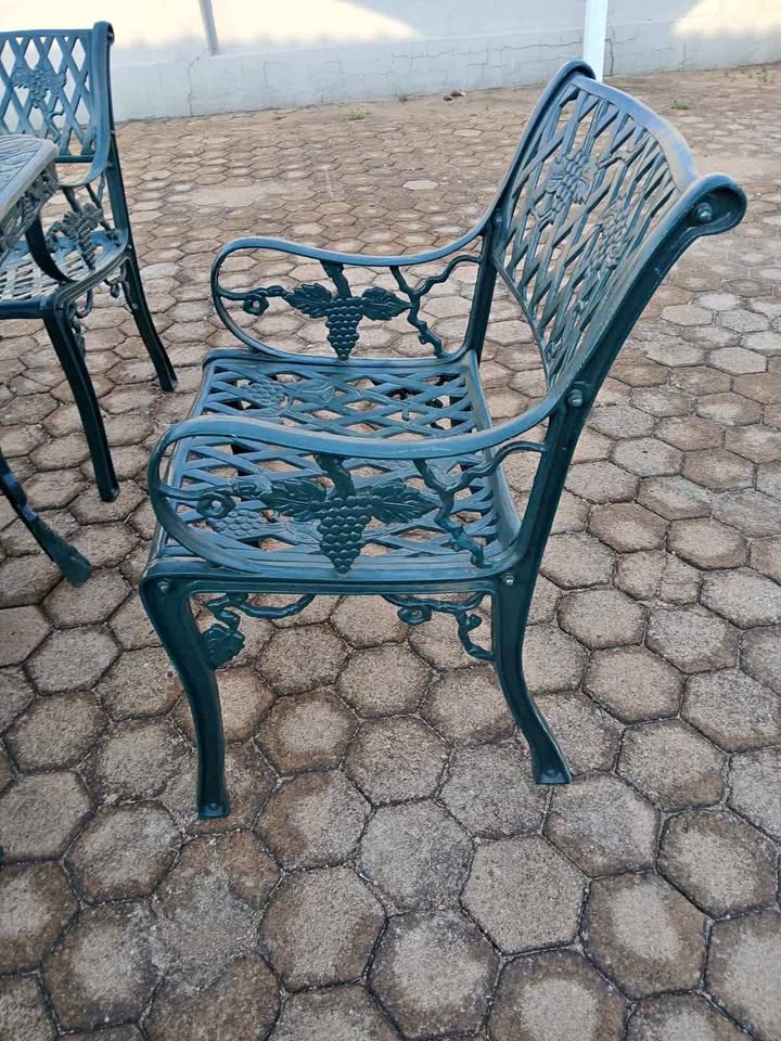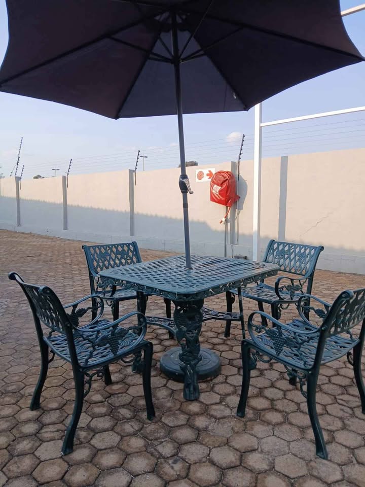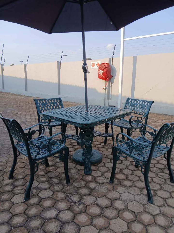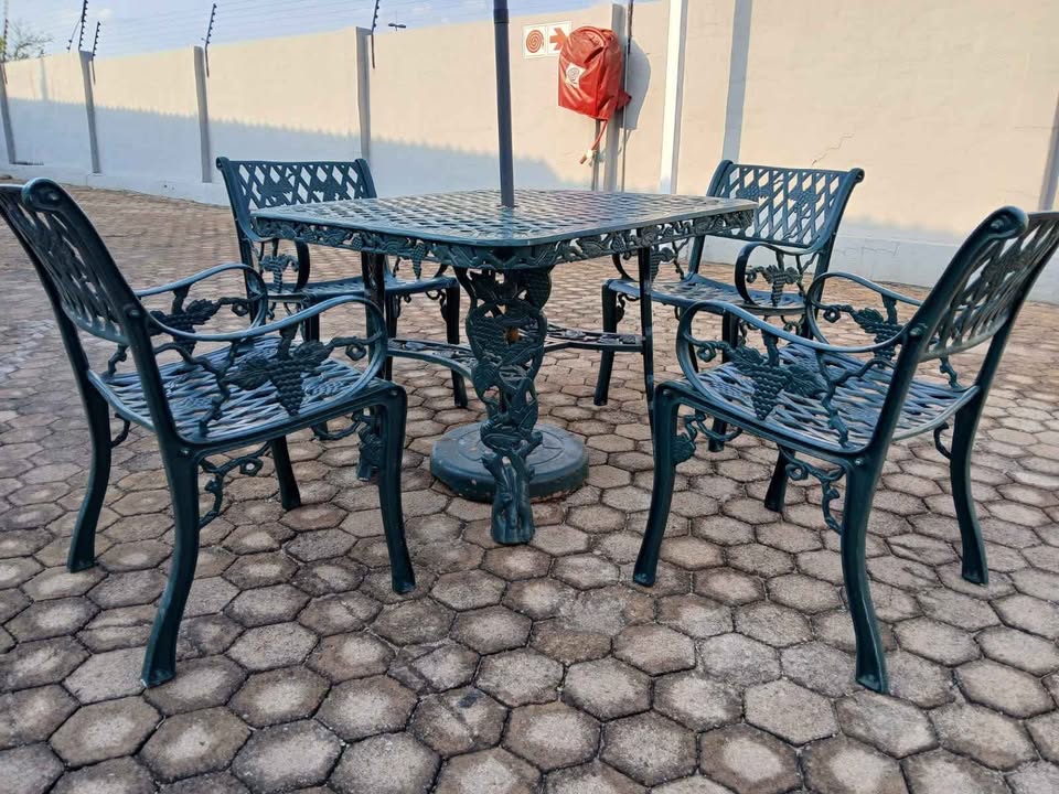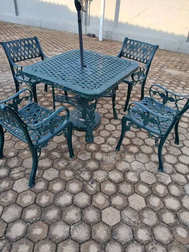 A stylish metal patio table with four matching chairs, complete with a large umbrella for shade, perfect for relaxing or enjoying meals outdoors.