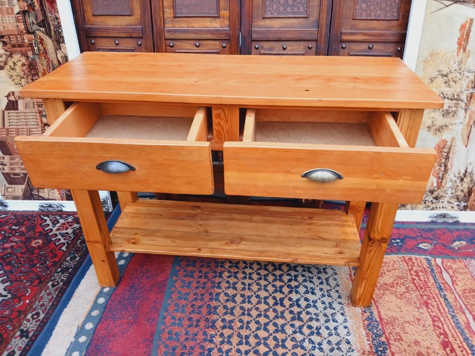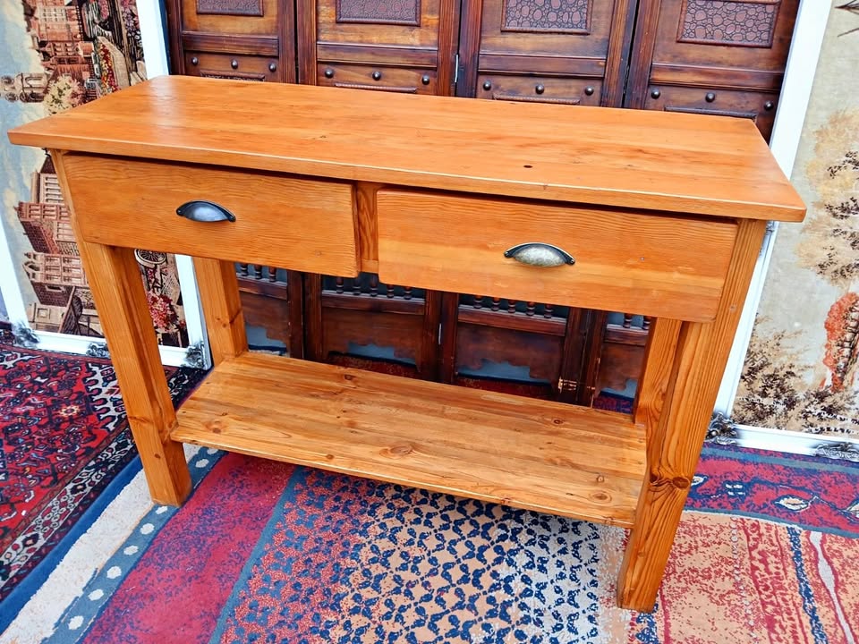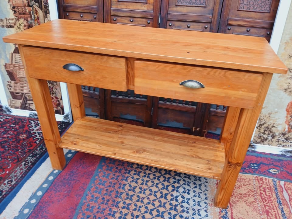 Beautifully crafted solid pine console table featuring two spacious drawers with vintage-style cup handles and a lower shelf for extra storage. Ideal for an entryway, hallway, or lounge space. Clean lines and natural woodgrain add rustic charm.