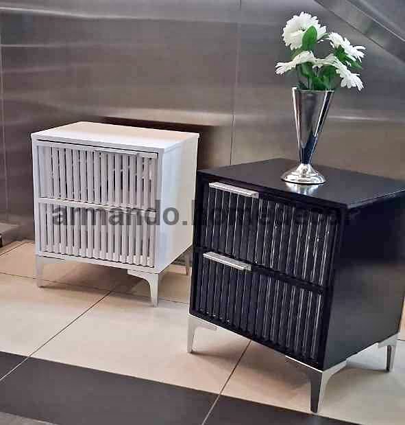 New white and silver bedside pedestals. Each side table has silver mirror strips and silver metal legs and handles. Size approx: 50x40x60cm high R2000 for 2 *Also available in black Collection is from the store in Midrand or delivery available with cash on delivery. Please see my other adverts for more.