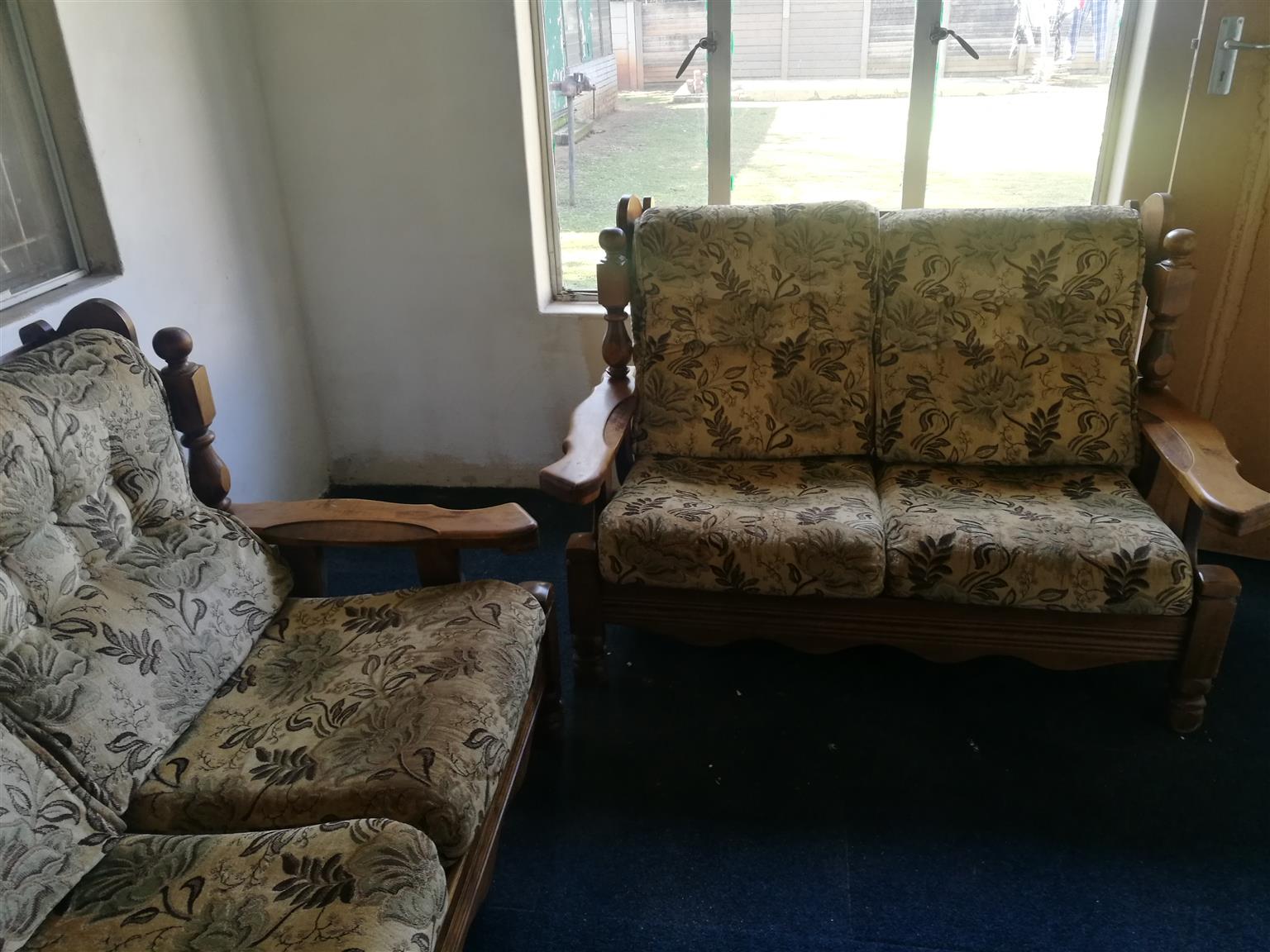 Teak set with loose cussions. 2 benches ,3 seater 2 seater , and 2 chairs one a rocking chair