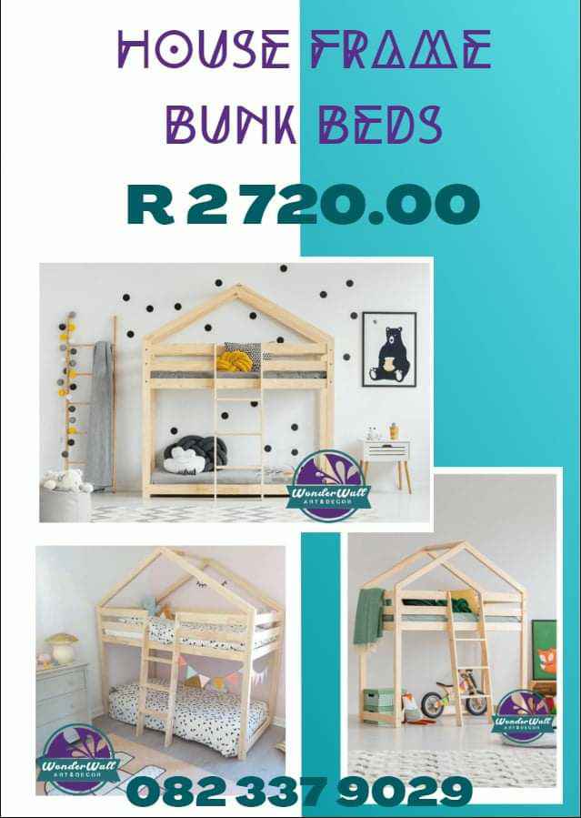 House Frame Bunk Beds @ WonderWall Only R 2 720.00 So much fun, Dress these beds up in your little ones favourite theme and make it so they want to go to bed. Made from Solid SA Kiln Dried pine, to ensure the bed is sturdy and safe and will last you a life time. PLEASE NOTE: All WonderWall Furniture is manufactured on Order, Prices do not include Delivery. To place your orders Contact us: 082 337 9029view more Follow us on Facebook: https://www.facebook.com/Wonderwallfurn #WonderWall #Customdesigns #Ilovemyhome #homedesign #bunkbeds #woodenfurniture #styleyourhome #homedecor #woodworking #homesweethome
