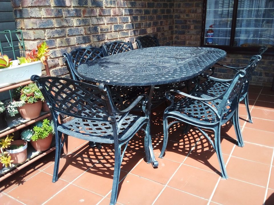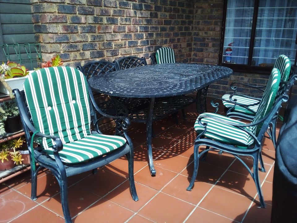 BEAUTIFUL WROUGHT IRON PATIO SET .6 seater table and 6 arm chairs all in excellent condition. Dark green/black colour. Sold with cushions as shown in pictures.