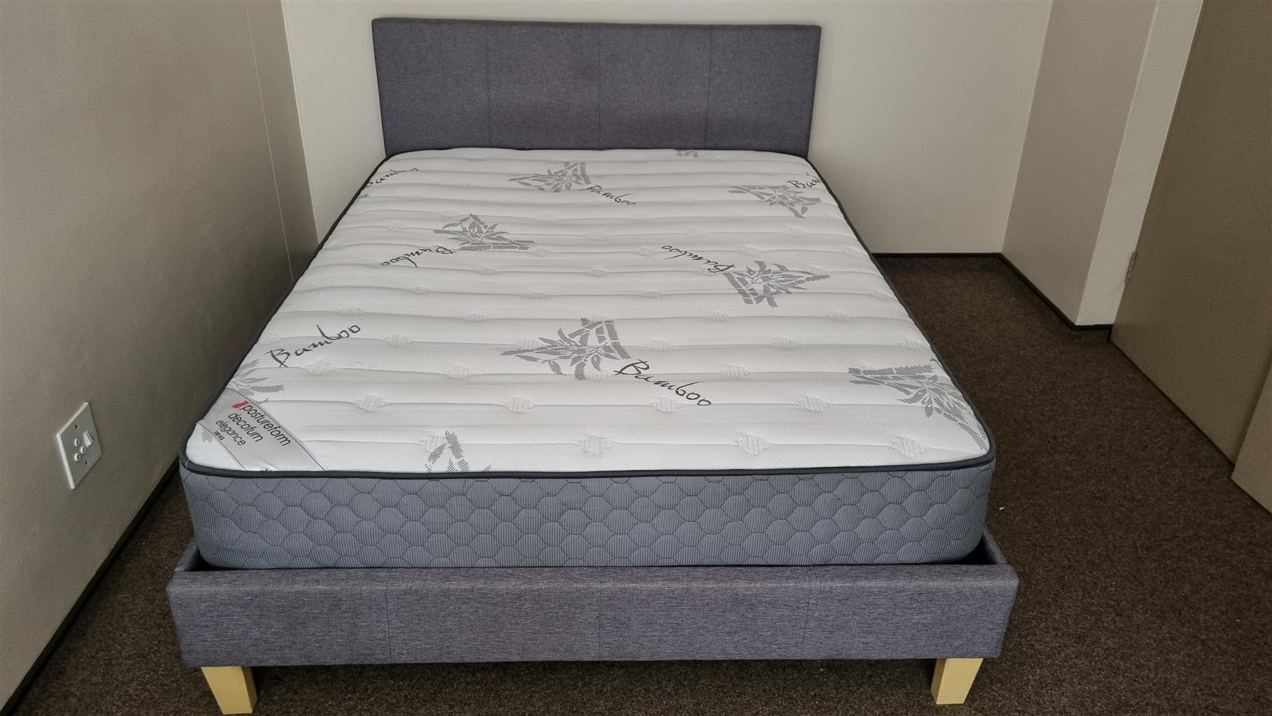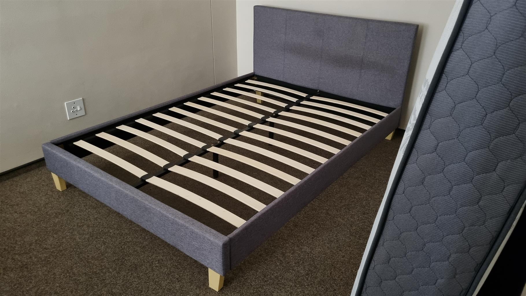 Grey double bed for sale. Comes with a sleigh bed frame and mattress. Own collection must be organised.