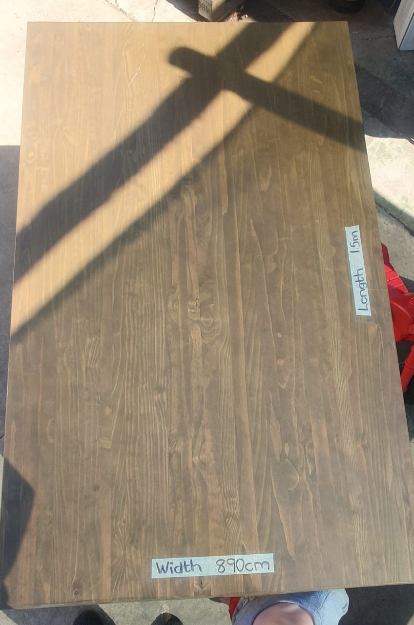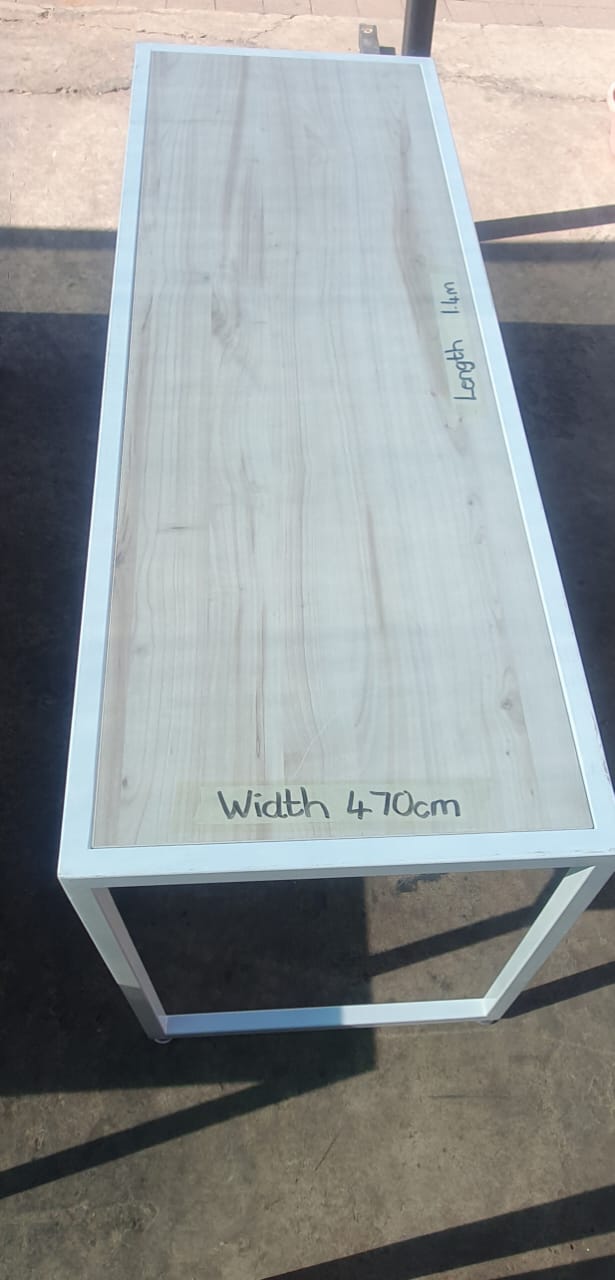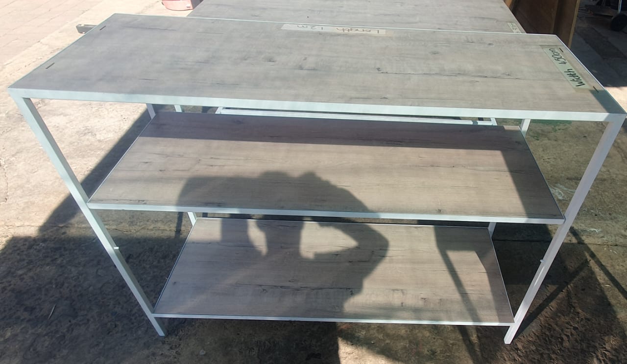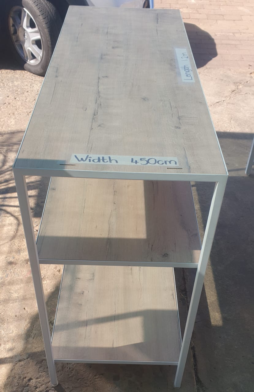 Different size tables. Can be used for displaying or anything else. Metal frames with wooden tops(shelves). 1x solid wood darkish color table.