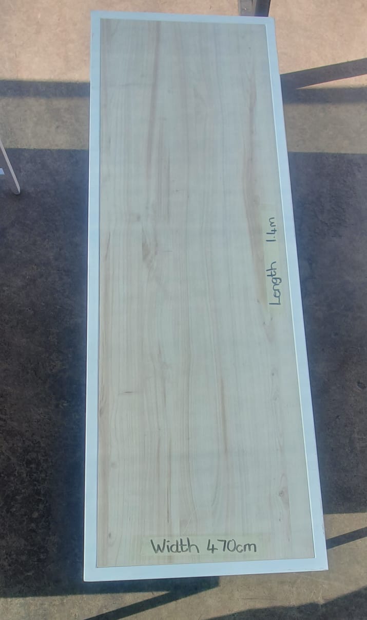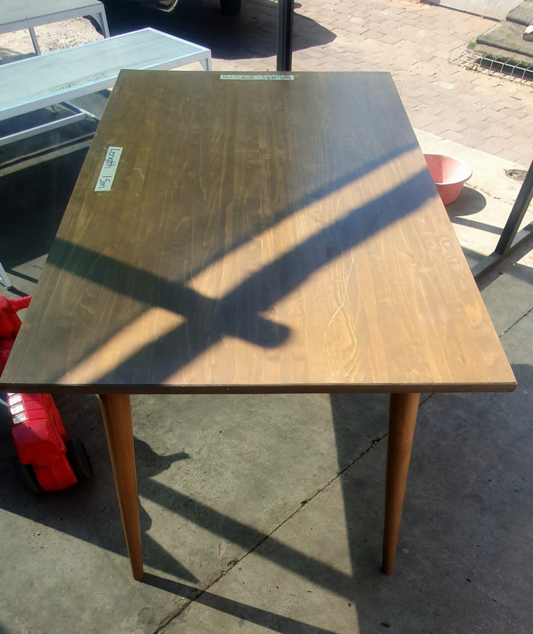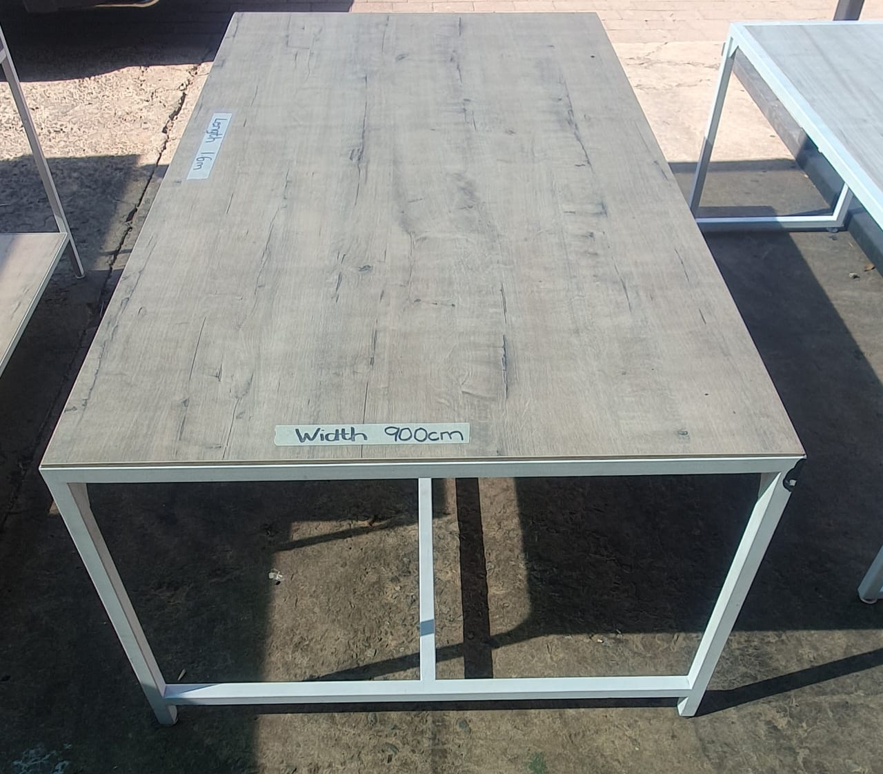 Different size tables. Can be used for displaying or anything else. Metal frames with wooden tops(shelves). 1x solid wood darkish color table.