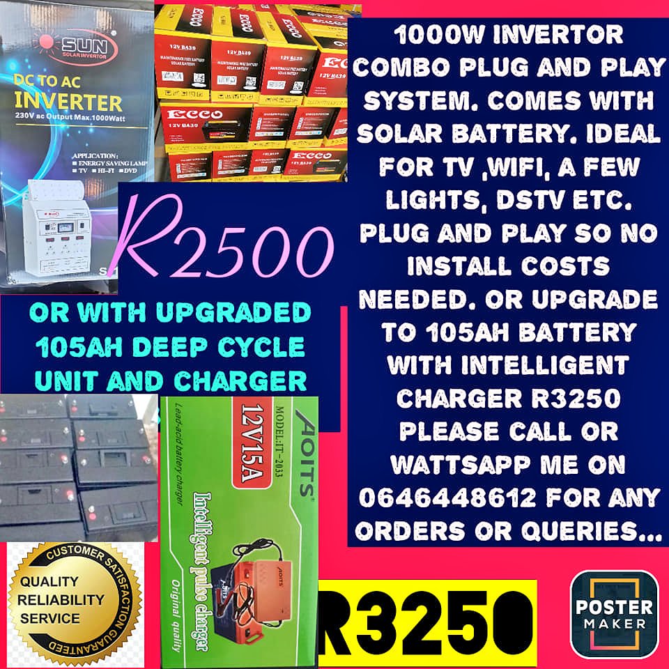 1000w Invertor combo plug and play system. Comes with solar battery. Ideal for tv ,wifi, a few lights, dstv etc. Plug and play so no install costs needed. Or upgrade to 105Ah battery with Intelligent charger R3250 Please call or wattsapp me on for any orders or queries...