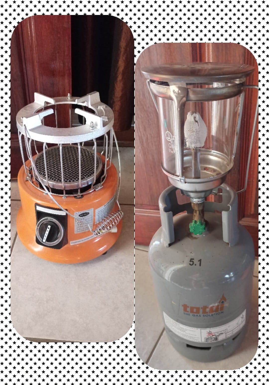 Gas bottle with lamp and gas heater. More details: