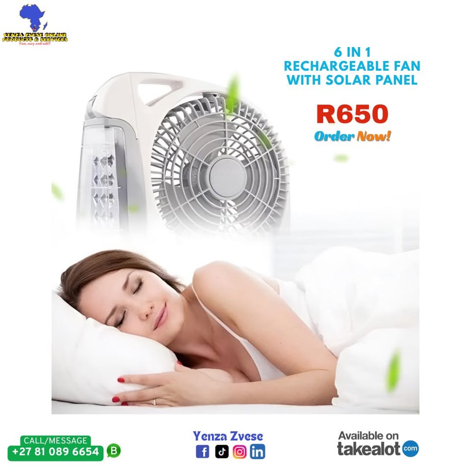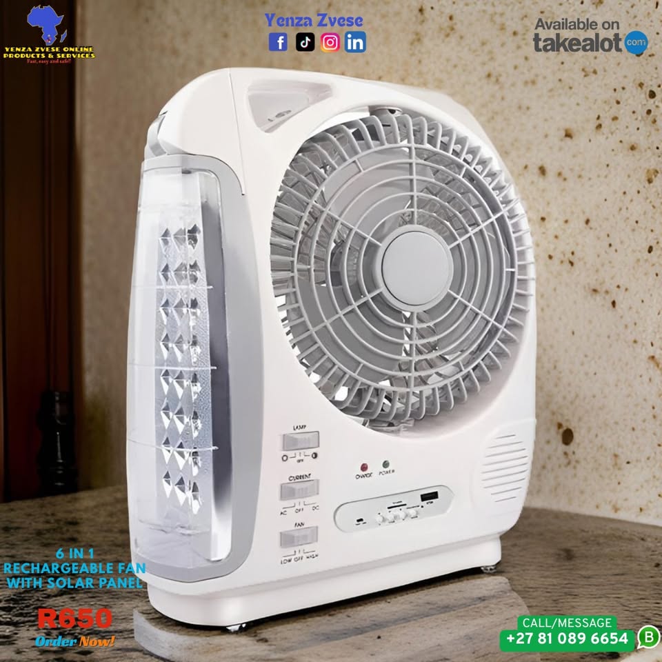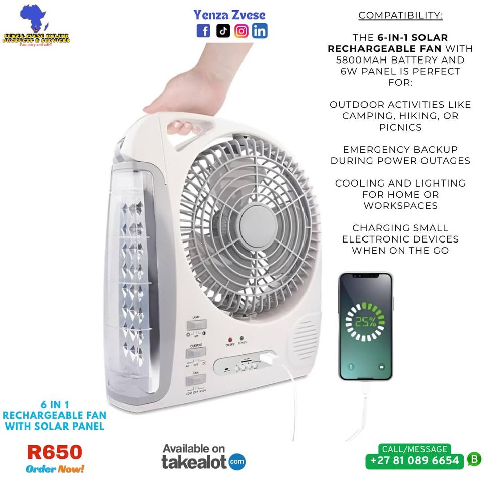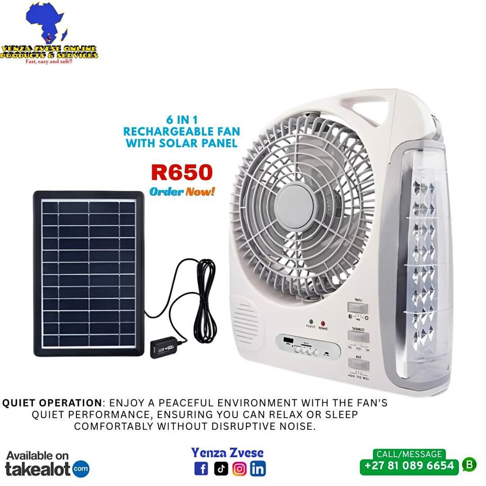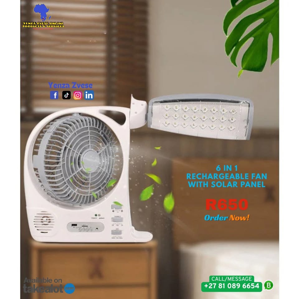 Solar power fan ensures that you can keep cool, even when there is load shedding. Can be used outdoors without the need to connect to a power supply. Features -Rechargeable battery -High-efficiency solar panel for rapid charging -Smart music player -3-speed fan with quiet operation -Bright LED light -Water-resistant design -Compact and lightweight Specifications -Type: Air Cooling Fan -Control Type: Mechanical -Rotary Vane Quantity: 3 -Power Source: Battery, Electric, Solar -Voltage (V): AC110 - 240 V 50/60Hz -Material: Plastic -Installation: Table -Wind Speed: Two -Battery: 5800mAh Lithium Battery -Built-in lights: 24SMD light -Solar panel: 8W
