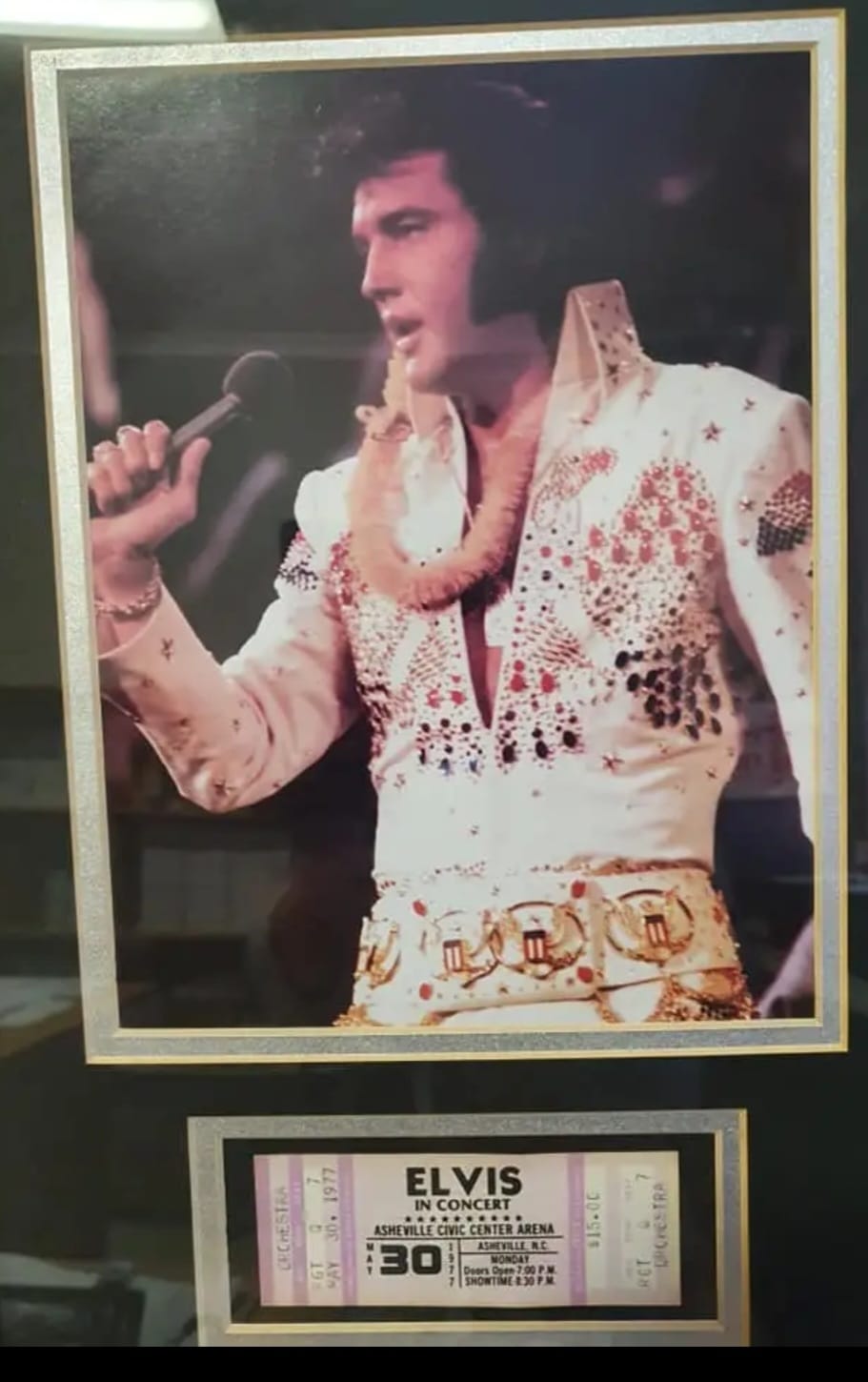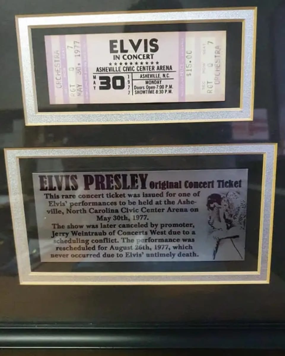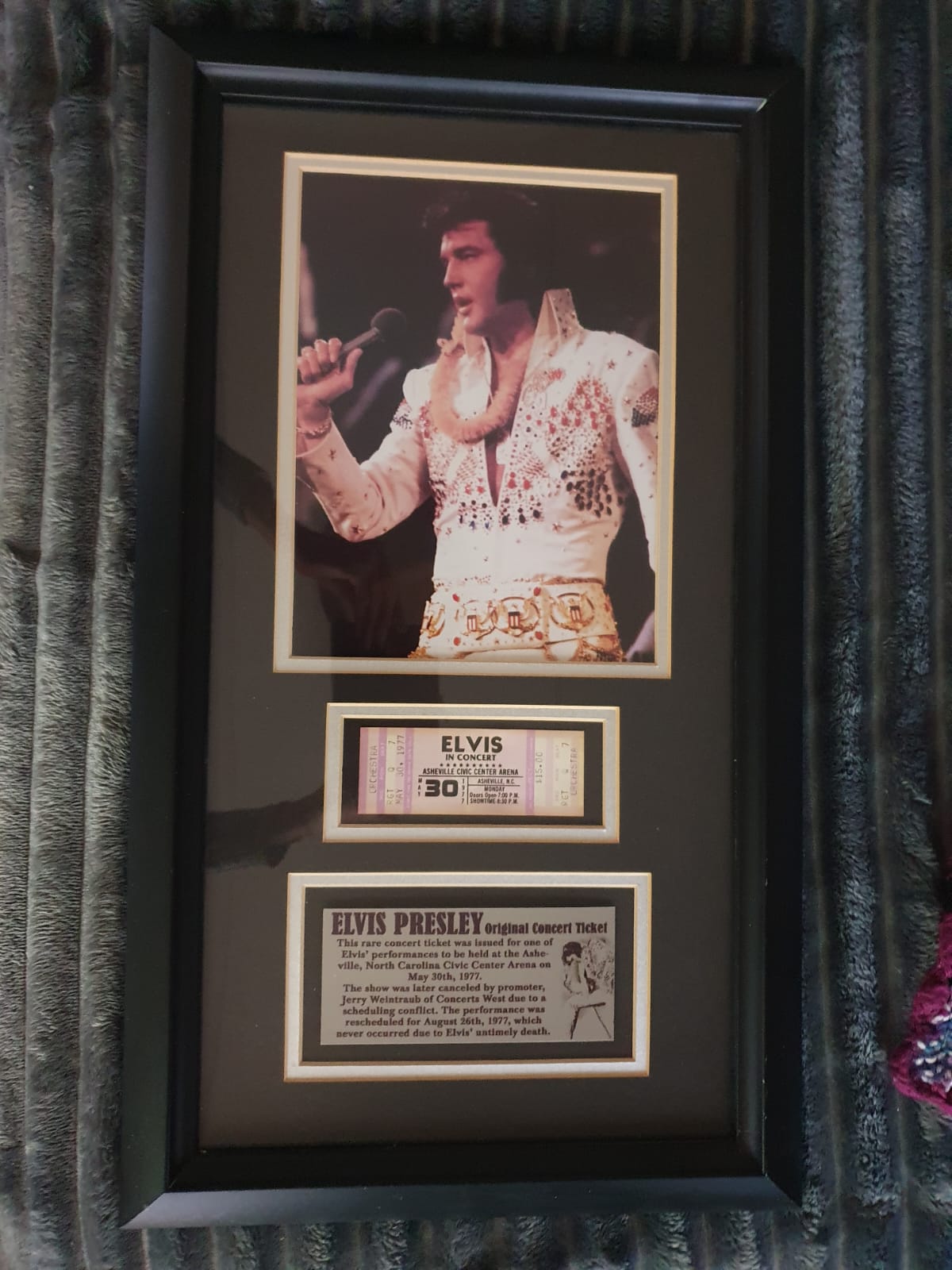 * Framed collectible of Elvis Presley (photo, unused ticket and ticket description).
