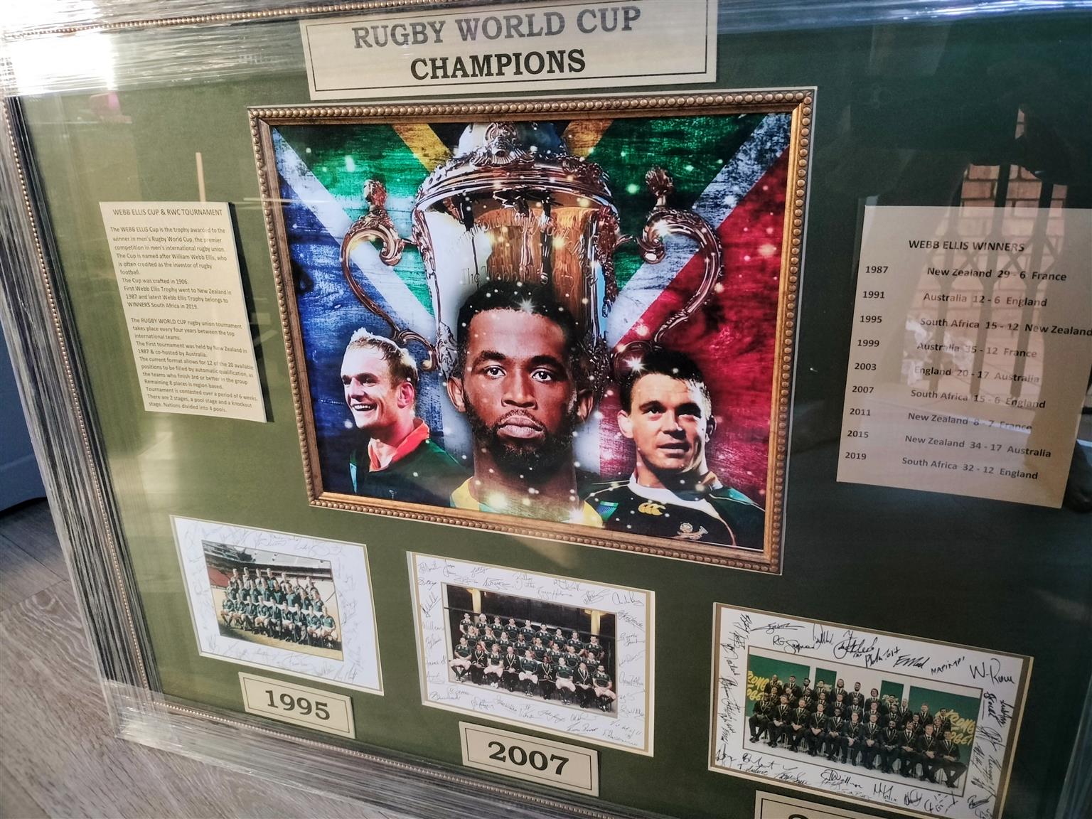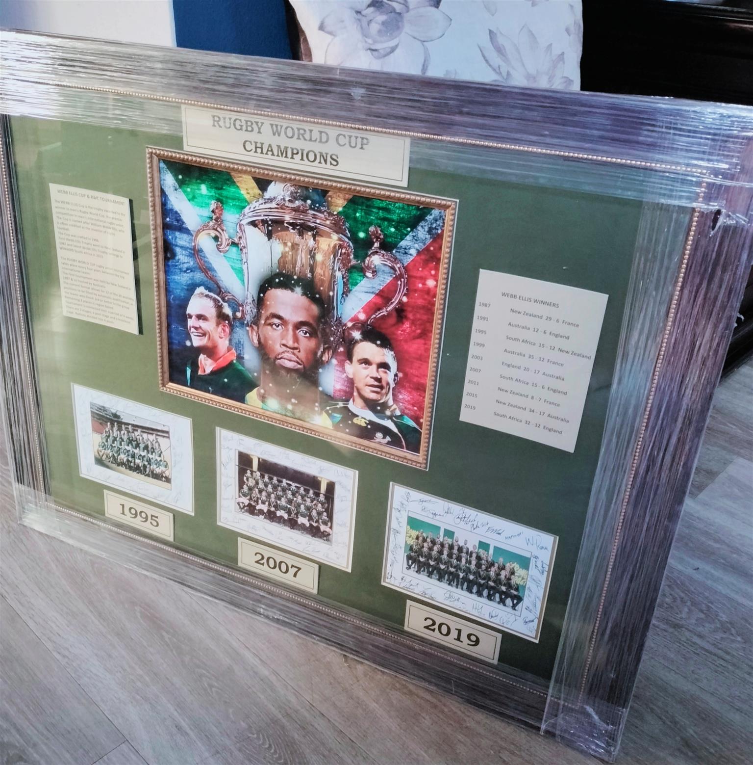 NEW Springbok Frame with memorabelia of World Cup Captains/Champions 1995, 2007 & 2019