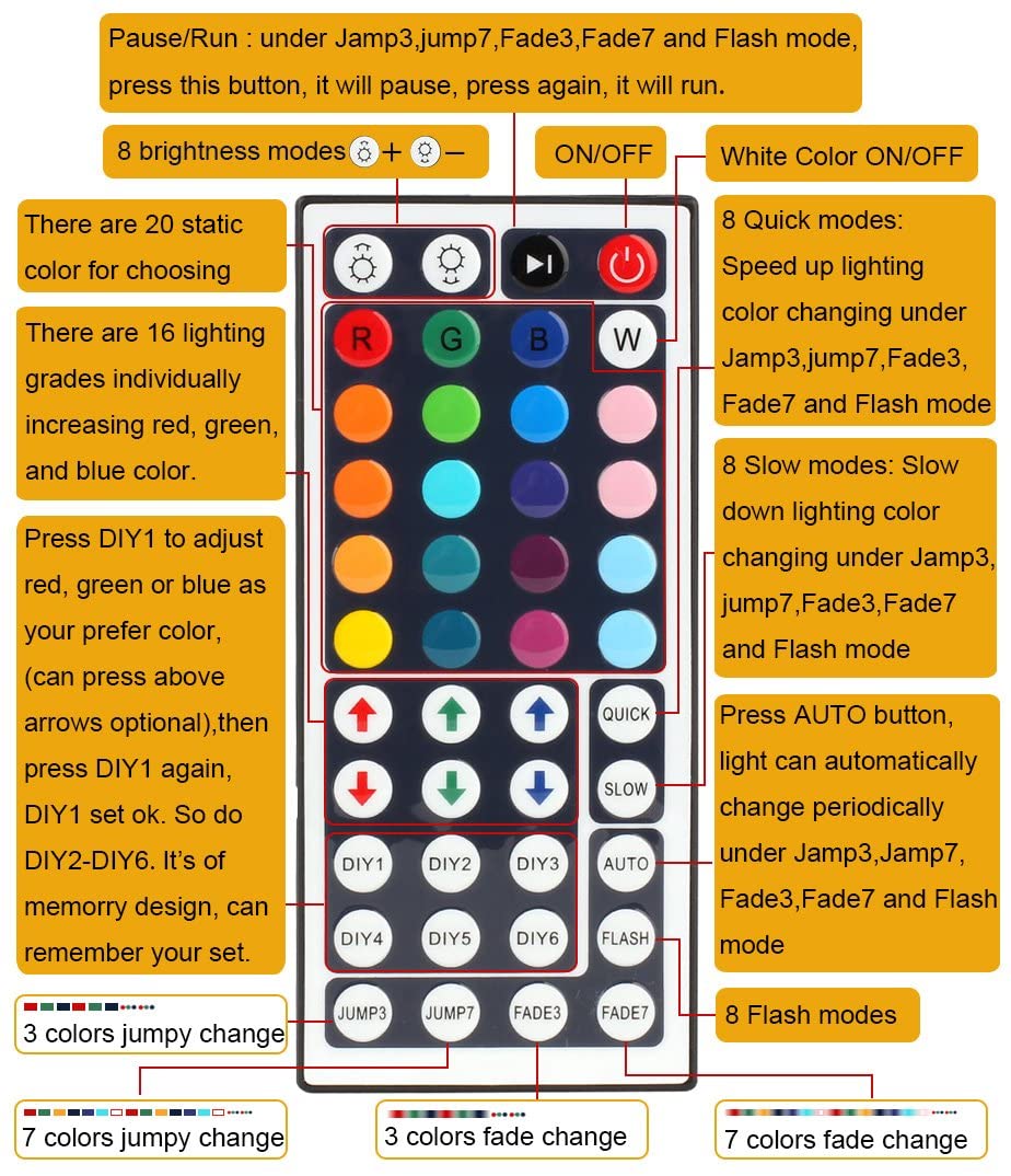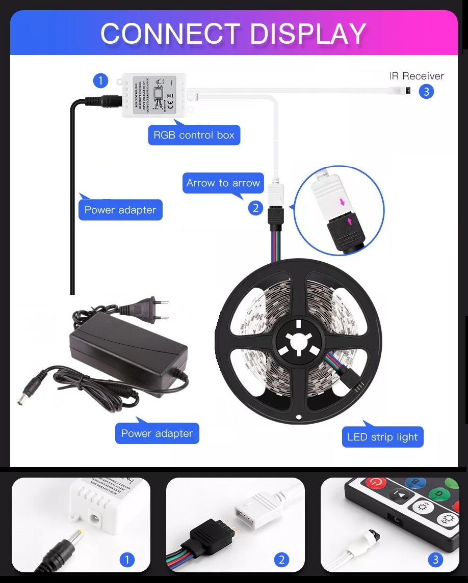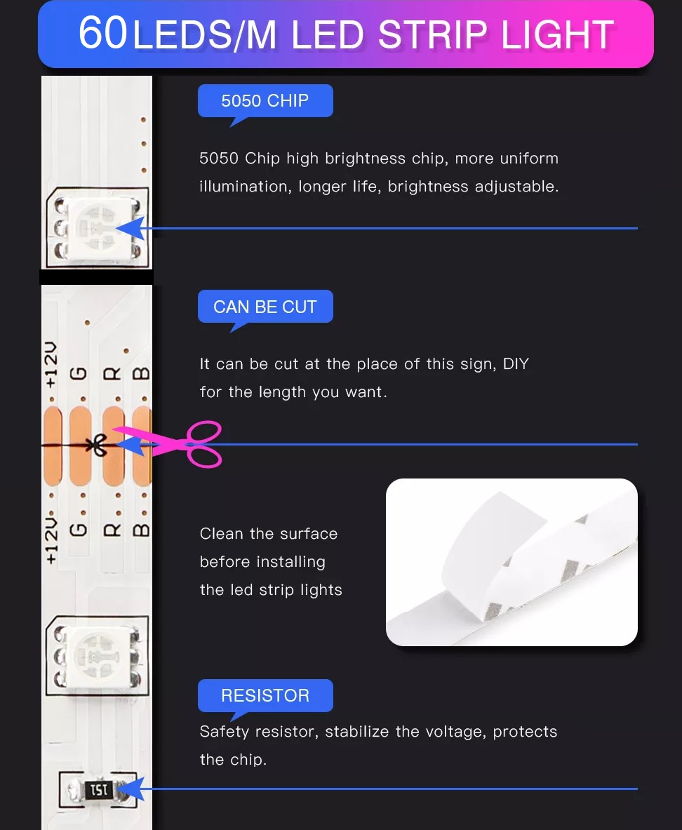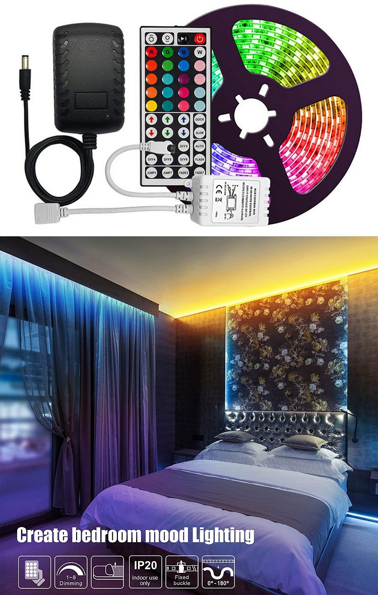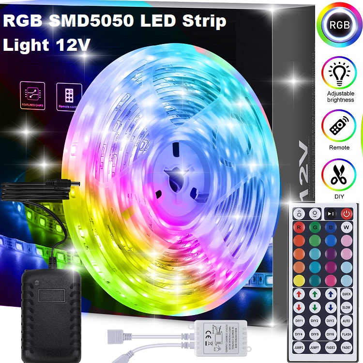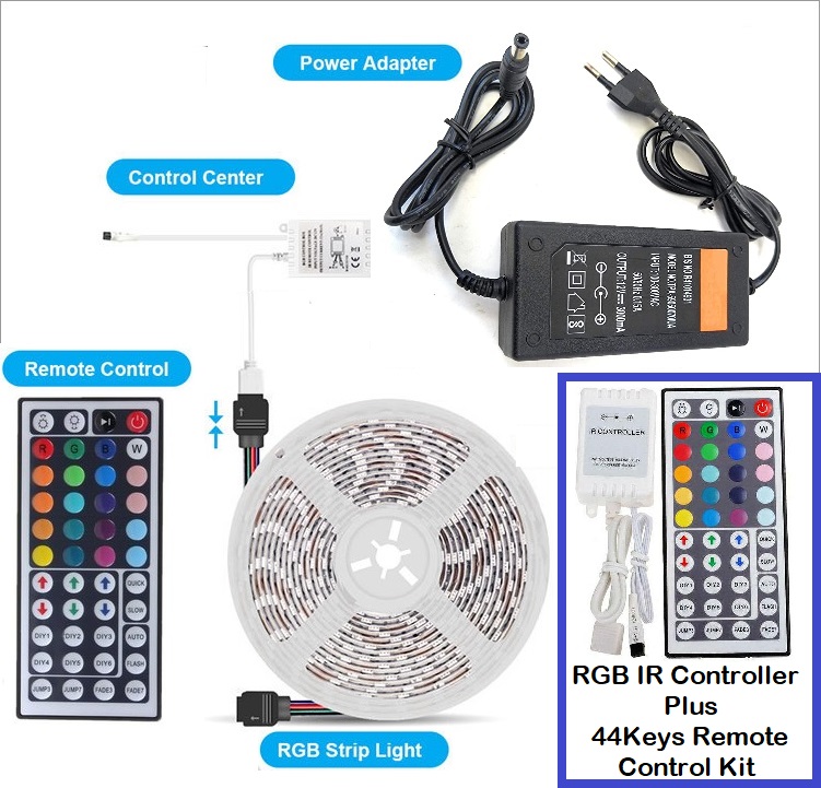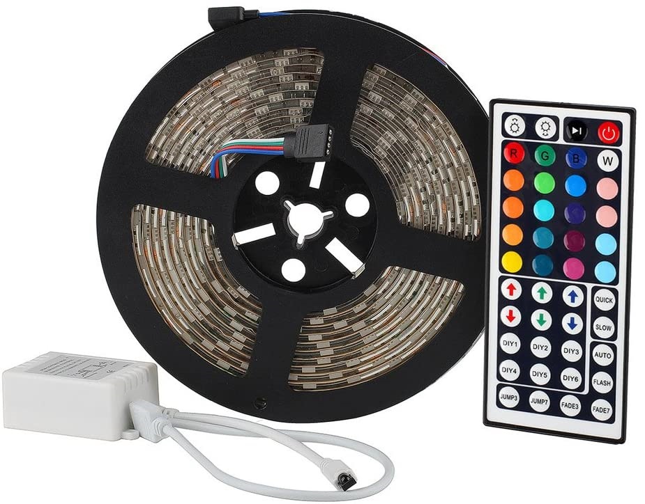 12V DC SMD5050 60 diodes/metre RGBLED Strip Light R550.00 for 5 metres. Includes Adapter/PSU + Control Box + 44Keys IR Remote Control.
