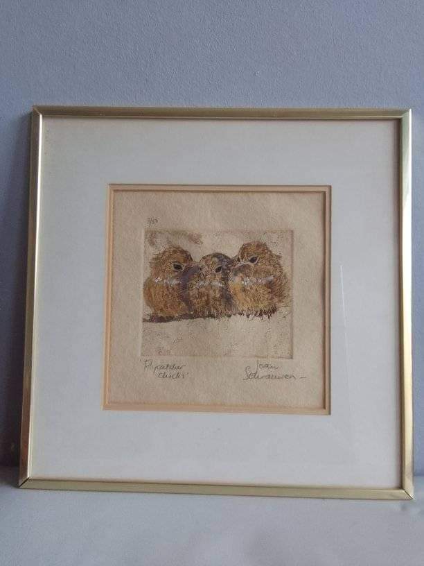 An original etching titled the Fly Catcher Chicks copy number 3of 50by Joan Schrauwen in mint condition. Dimensions = 22cm×22cm.