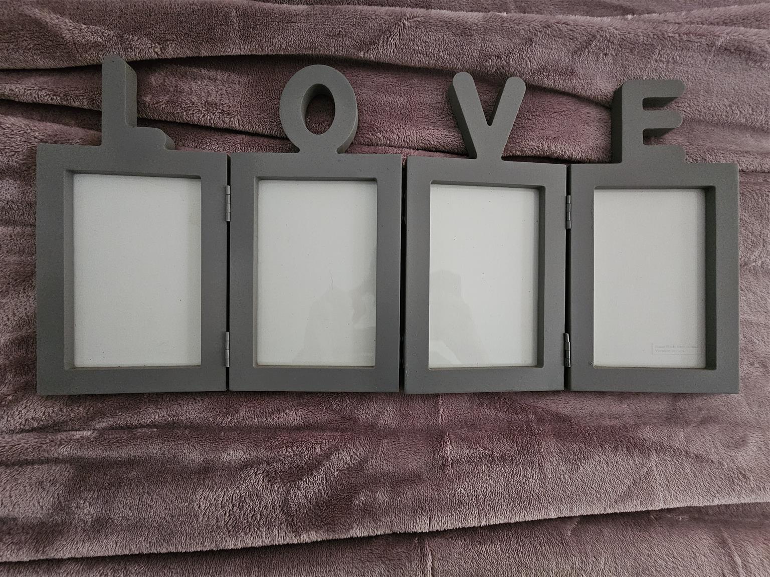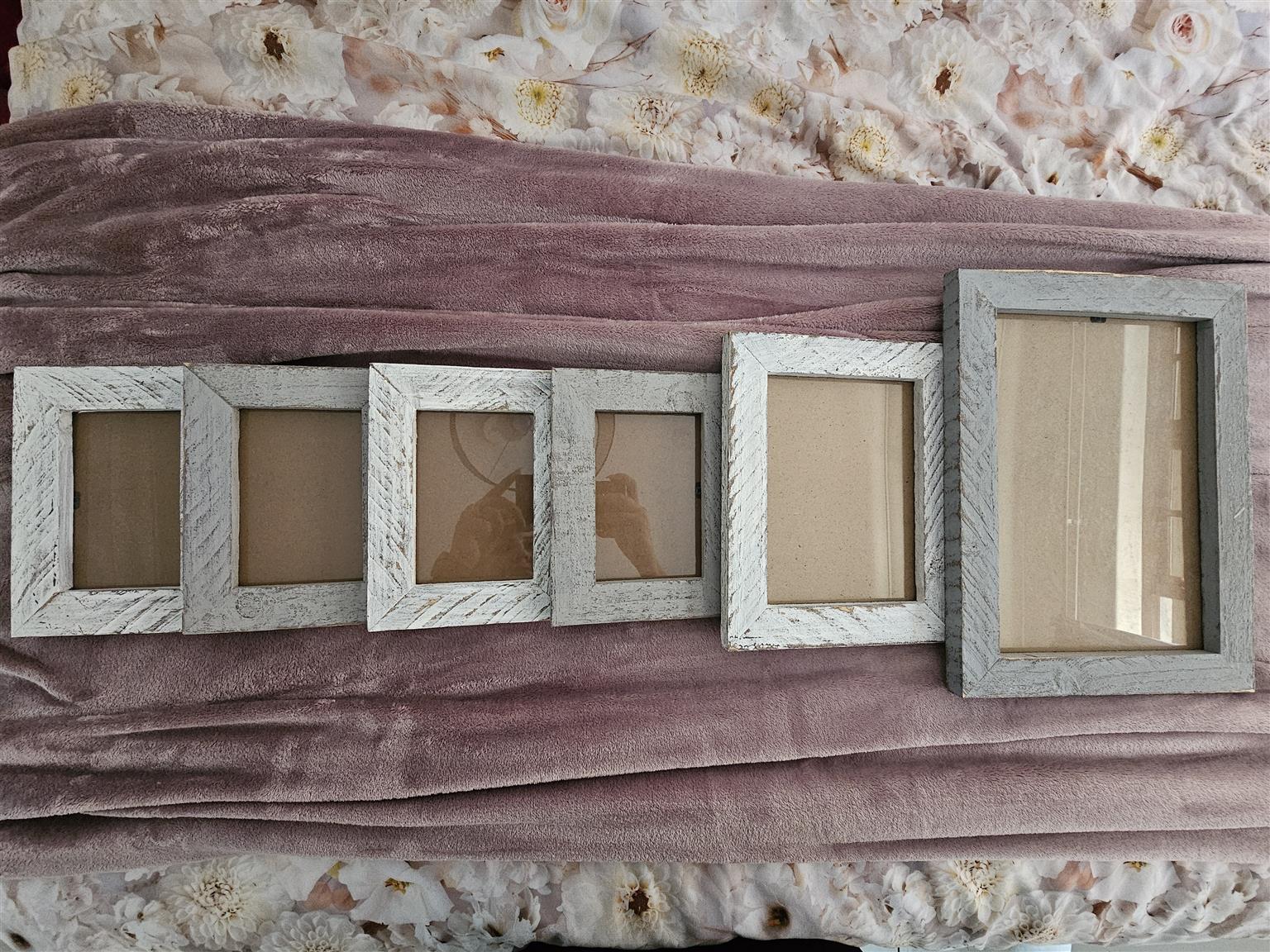 6 x Beautiful white washed wood photo frames. 1 x Grey wood "LOVE' standing photo frame.