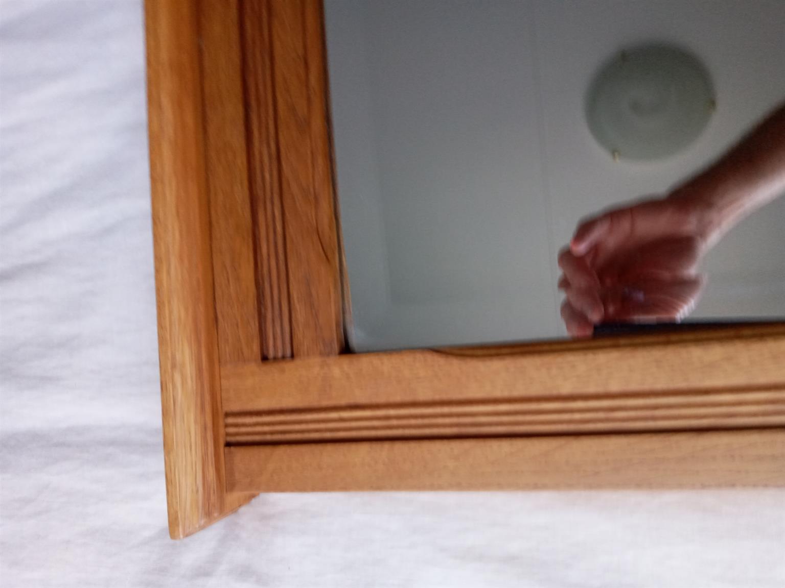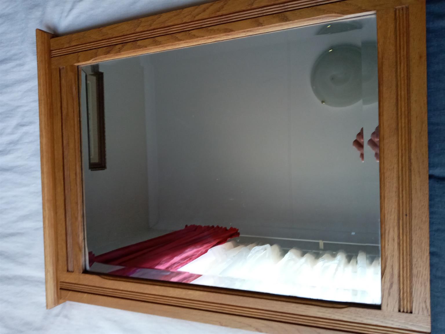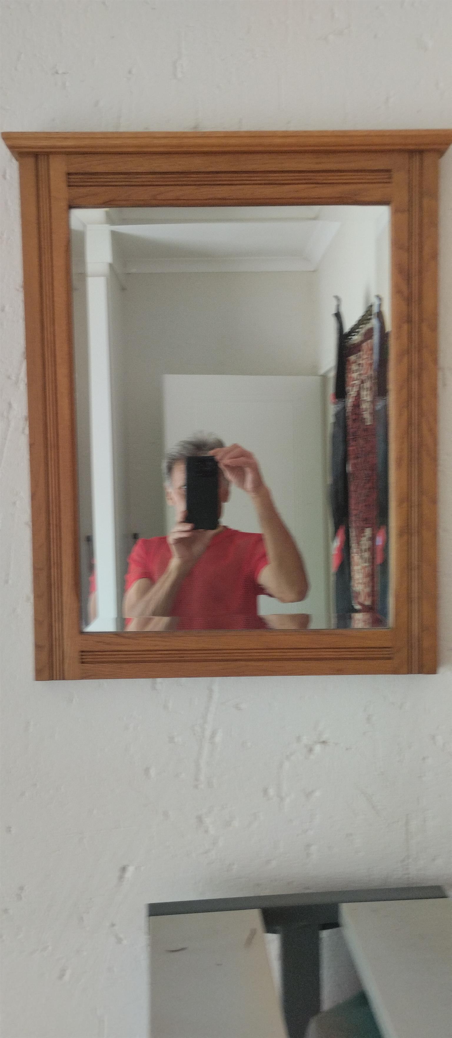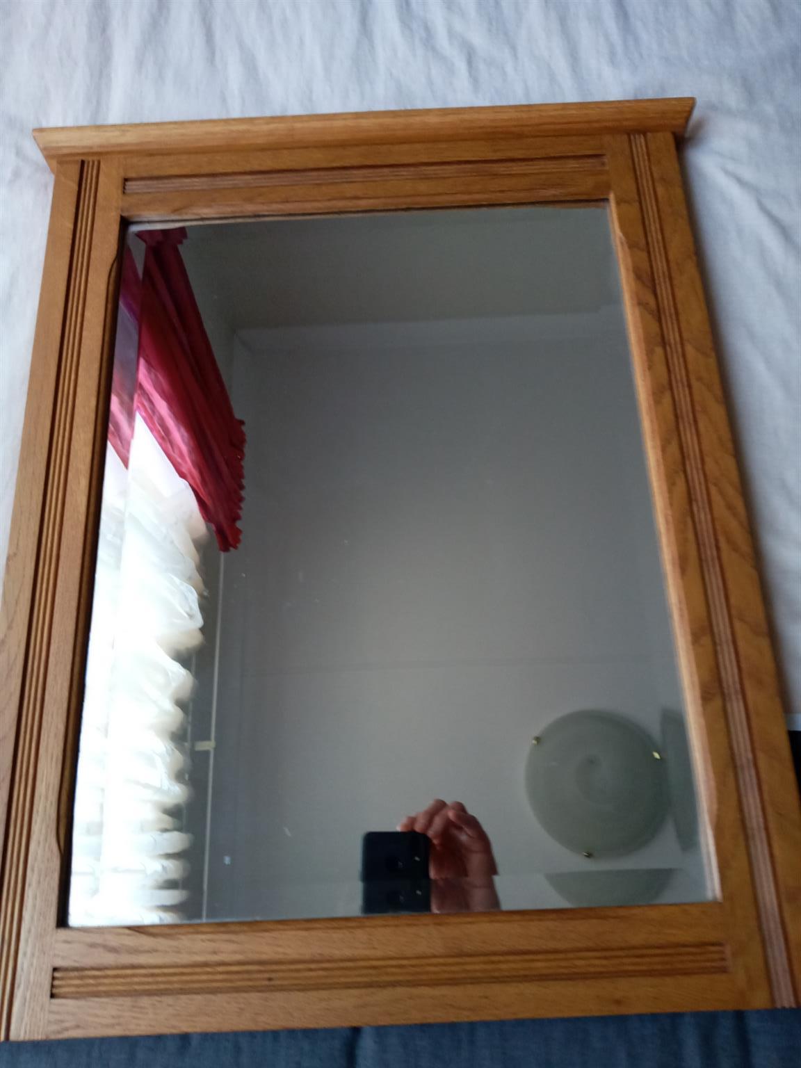Made to order, beveled rectangular mirror, in a detailed solid Oak frame, made by Johnsons Bros.