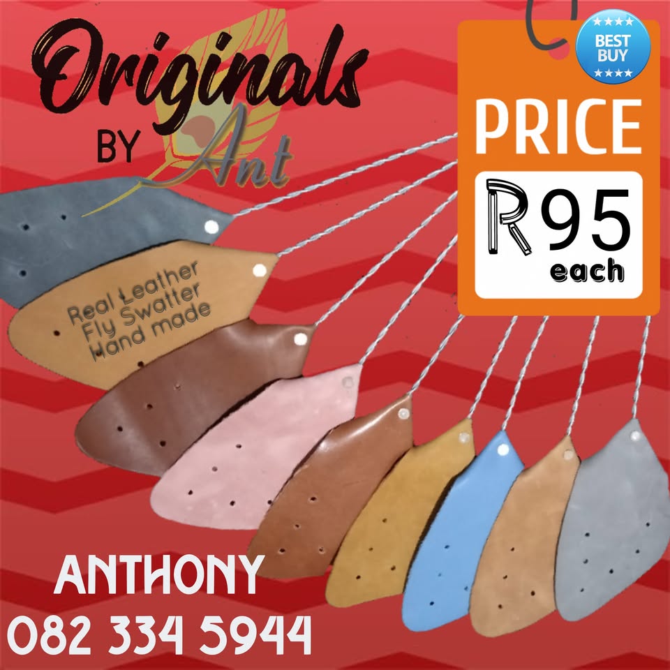 Genuine Leather Fly Swatters in various colour range. Durable and long lasting. Original full size Fly Swatters @ R49 each Wholesale prices available on request. Contact me for Branding and wholesale prices.