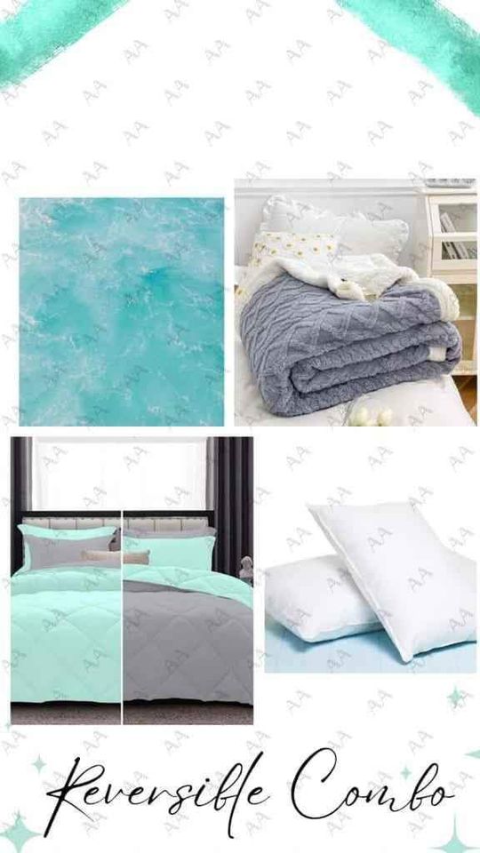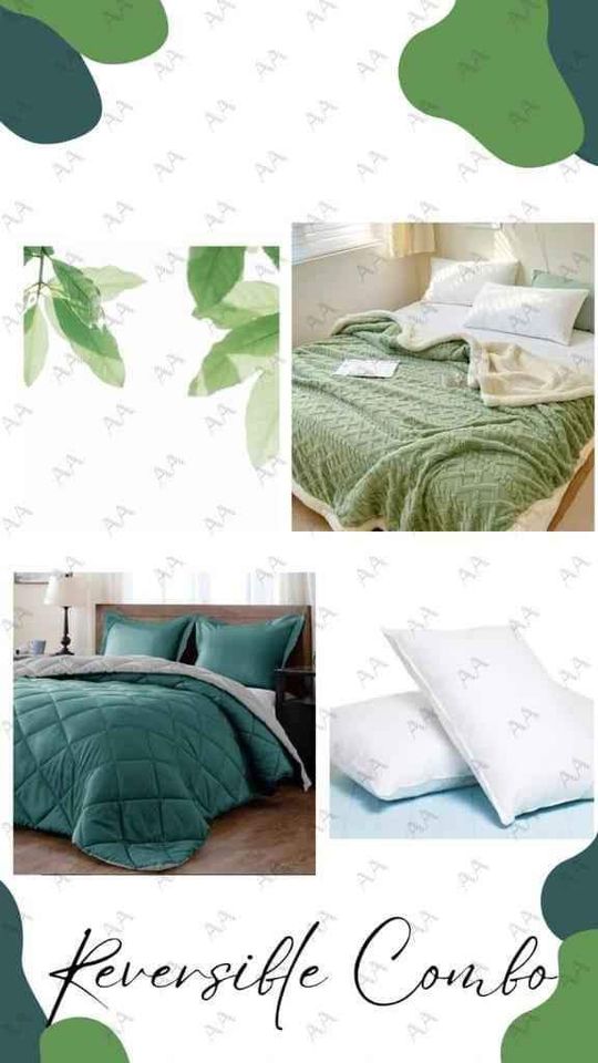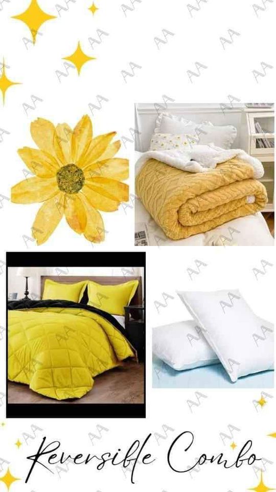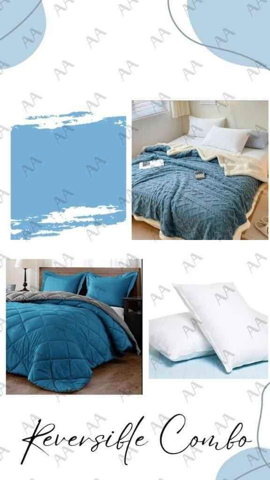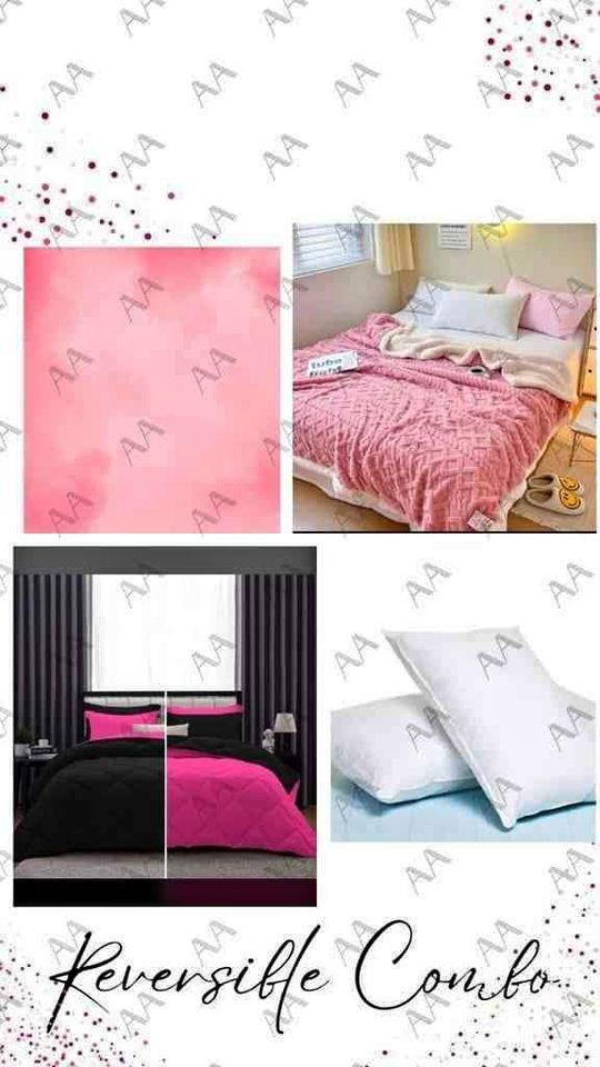 *Reversible & Geometric Sharpa Combo* *5 Piece Reversible Comforter* X2 Standard Pillowcases X2 Continental Pillowcases X1 Comforter ( Queen ) ———————————————— _X1 Geometric Sharpa 200cm by 230cm_ ———————————————— _X2 Standard Pillows_ *R600