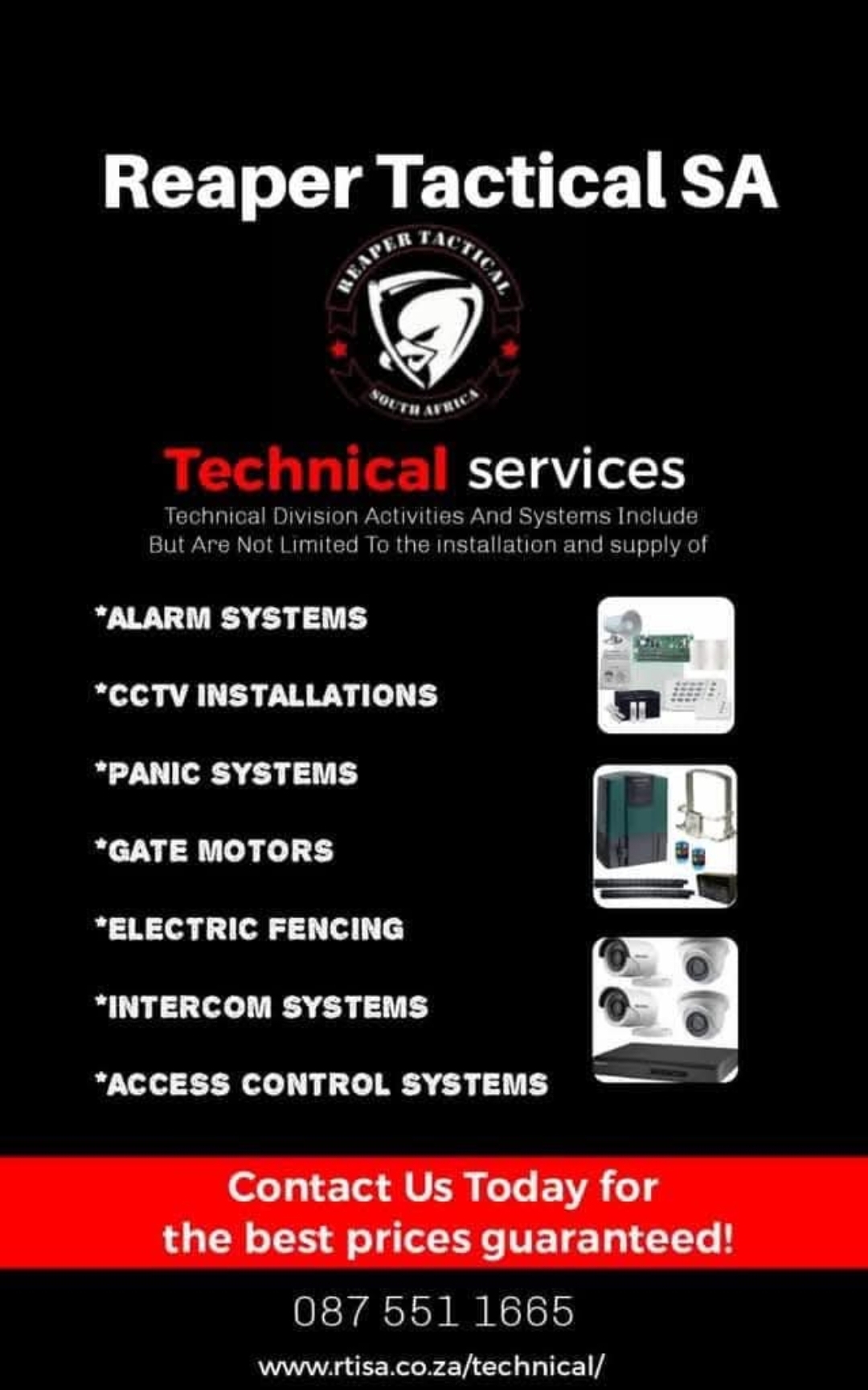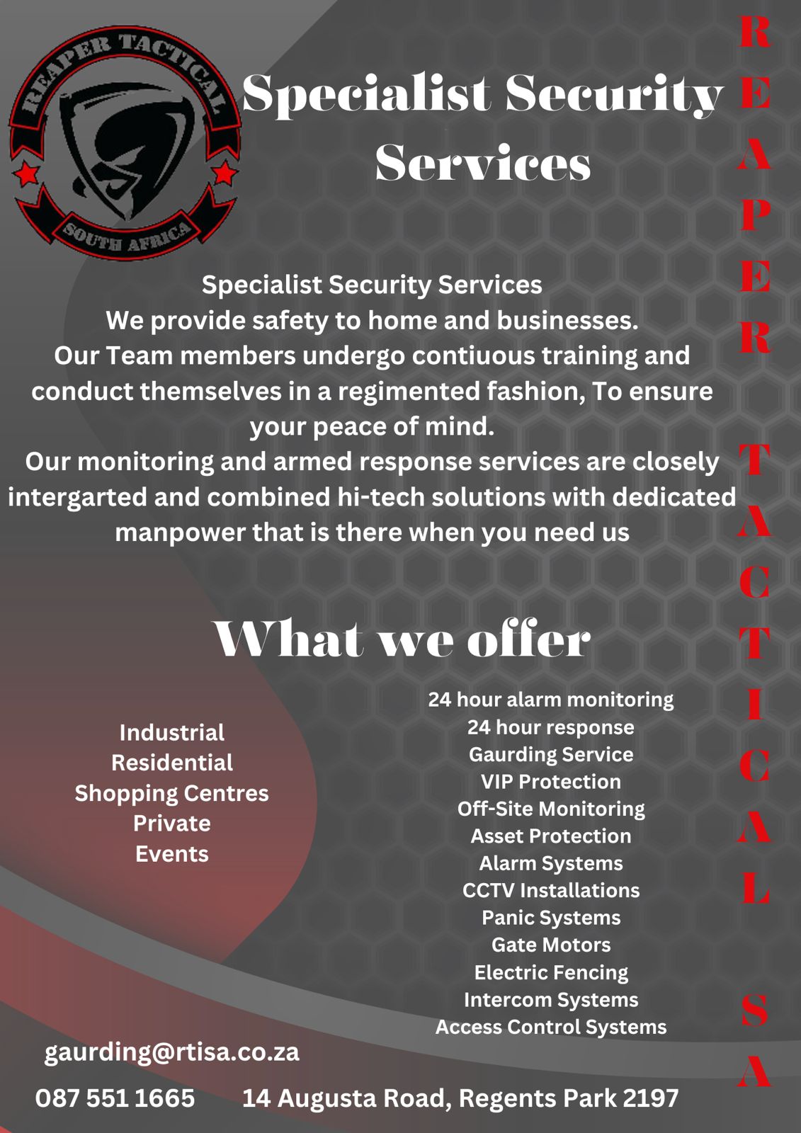 Armed reaponse. alarm systems, panic packs, off site camera monitoring, camera installations, electric fencing. Site Gaurding , armed and unarmed.