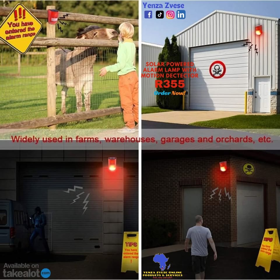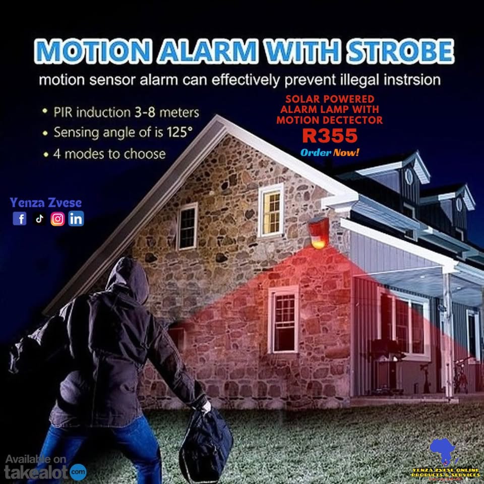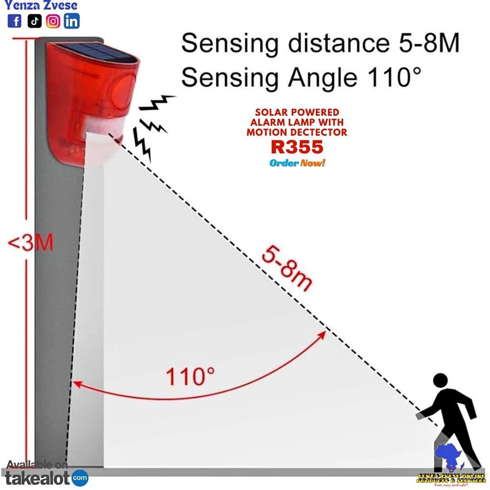 Features? Solar Sound & Light Alarm Motion Sensor • The product is table for outdoor use; IP65 waterproof, energy saving environmental protection/ safety. • Applicable for home, farm, orchard, construction sites and other places where requiring security alarm. • 5-8 meters sensing distance, sensing angle125; 129db sound alarm and warning flash light • Full day 24 Hrs lighting mode and night 12 Hrs mode are selection • 50 days standby time, an average daily sun changing 1 Hrs can keep working stat • Easy installation lithium battery ensures the product can be recycled for a long time -Solar energy rechargeable lithium battery ensures the product can be recycled for a long time