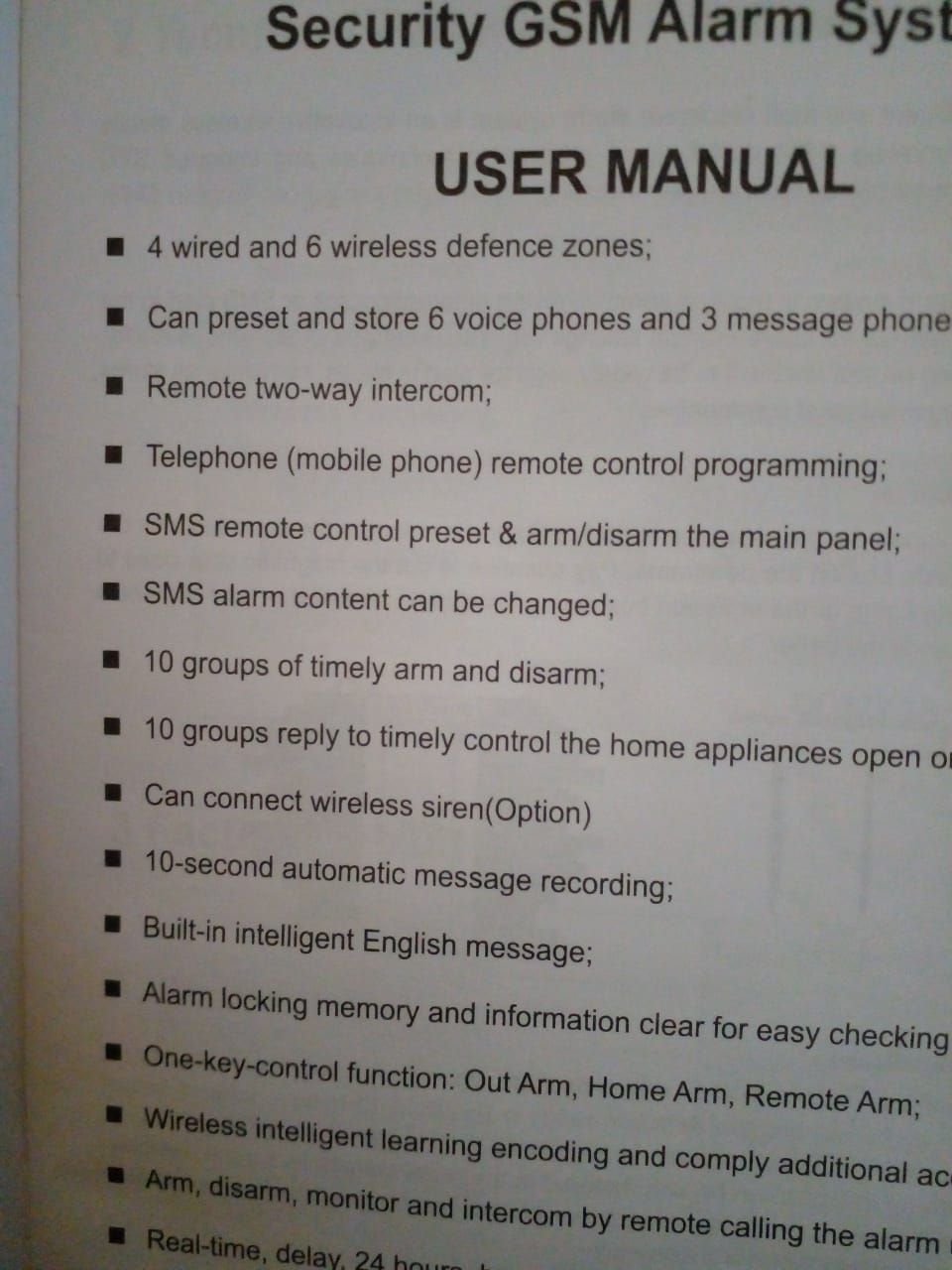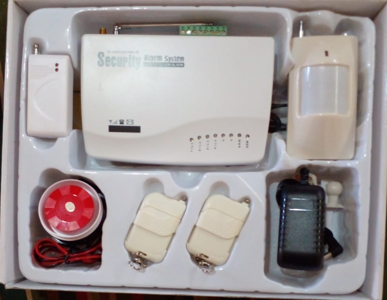 Includes 2 moving sensors, 2 remotes, 1 siren, 1 Power supply, 1 Control unit. It uses a sim card which can be programmed to contact you in the event when the alarm is triggered. I can send the alarm via Postnet country wide for R110 extra