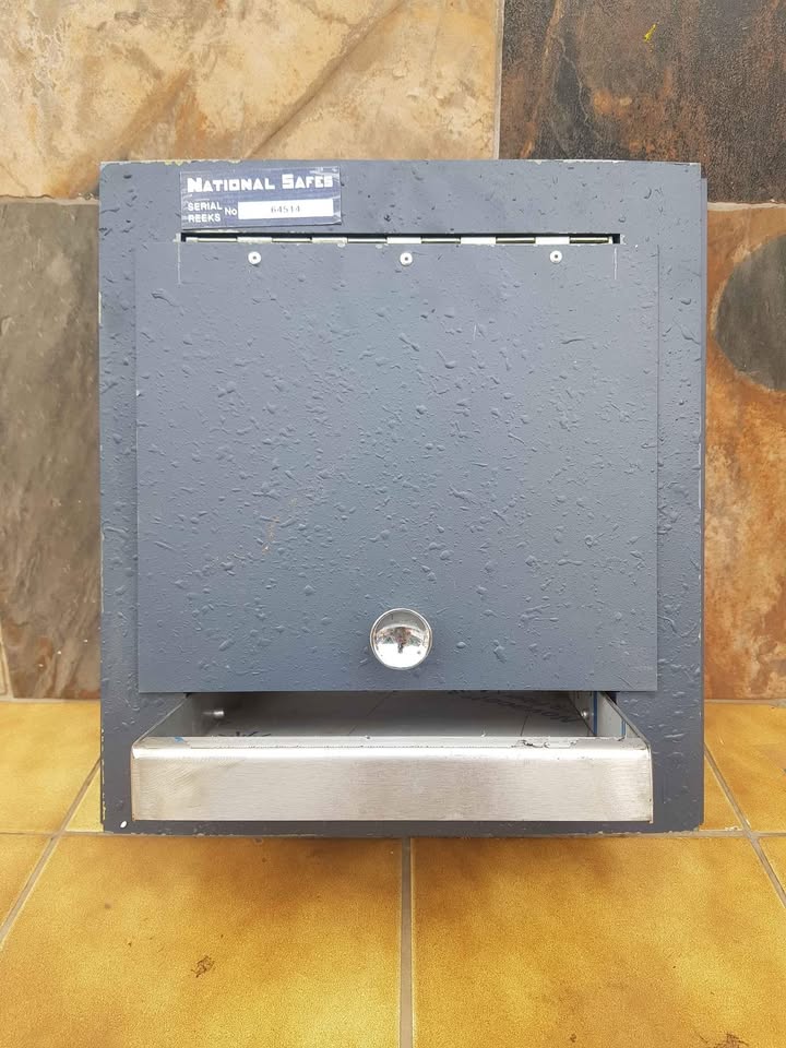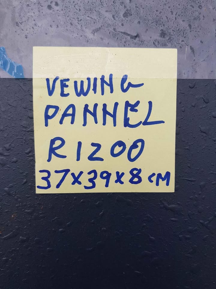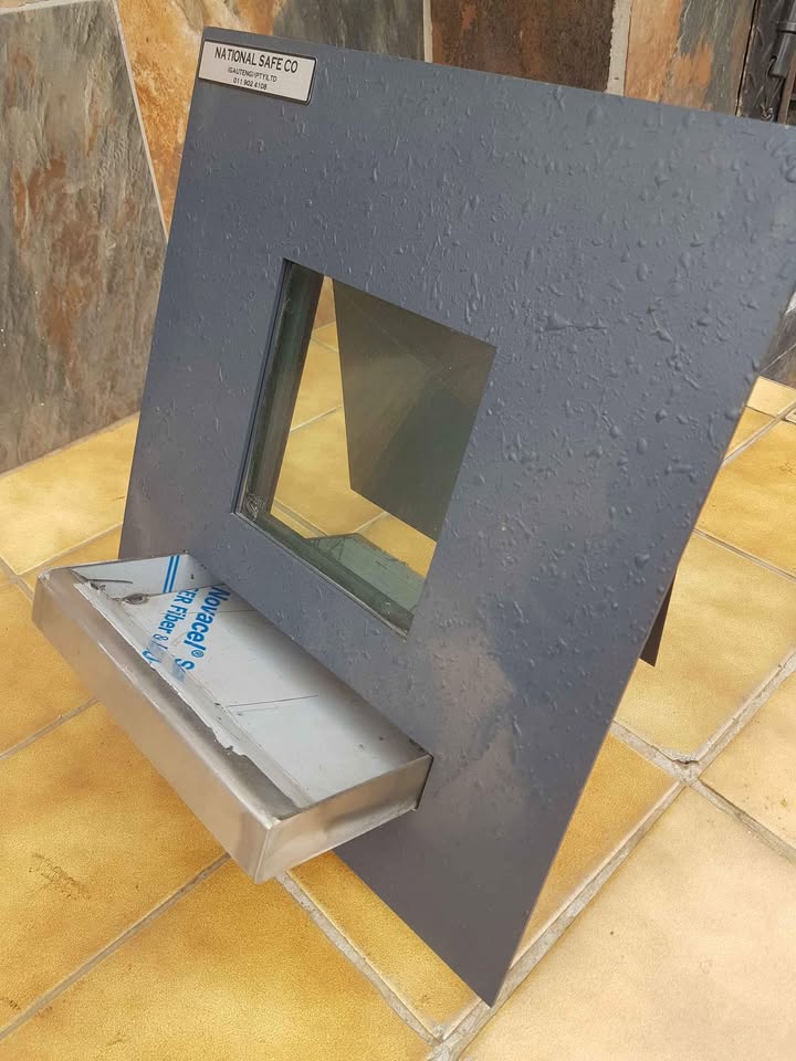 Viewing panel for security at small shops. The sizes is as follow 37x39x8 cm. It's also fitted with a bulletproof glass. It ways 14 kg..