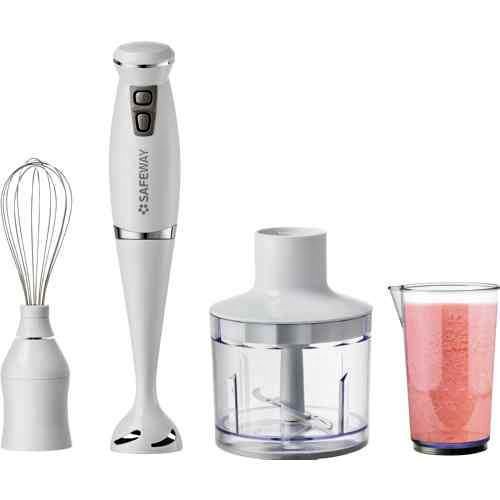 New Safeway 200W 3 In 1 Stick Blender Set. Safeway Stick Blender Set includes a sturdy blender, a balloon whisk, a chopper bowl with lid, and a 500 ml plastic beaker. 2 Settings. 1.2m Chord.