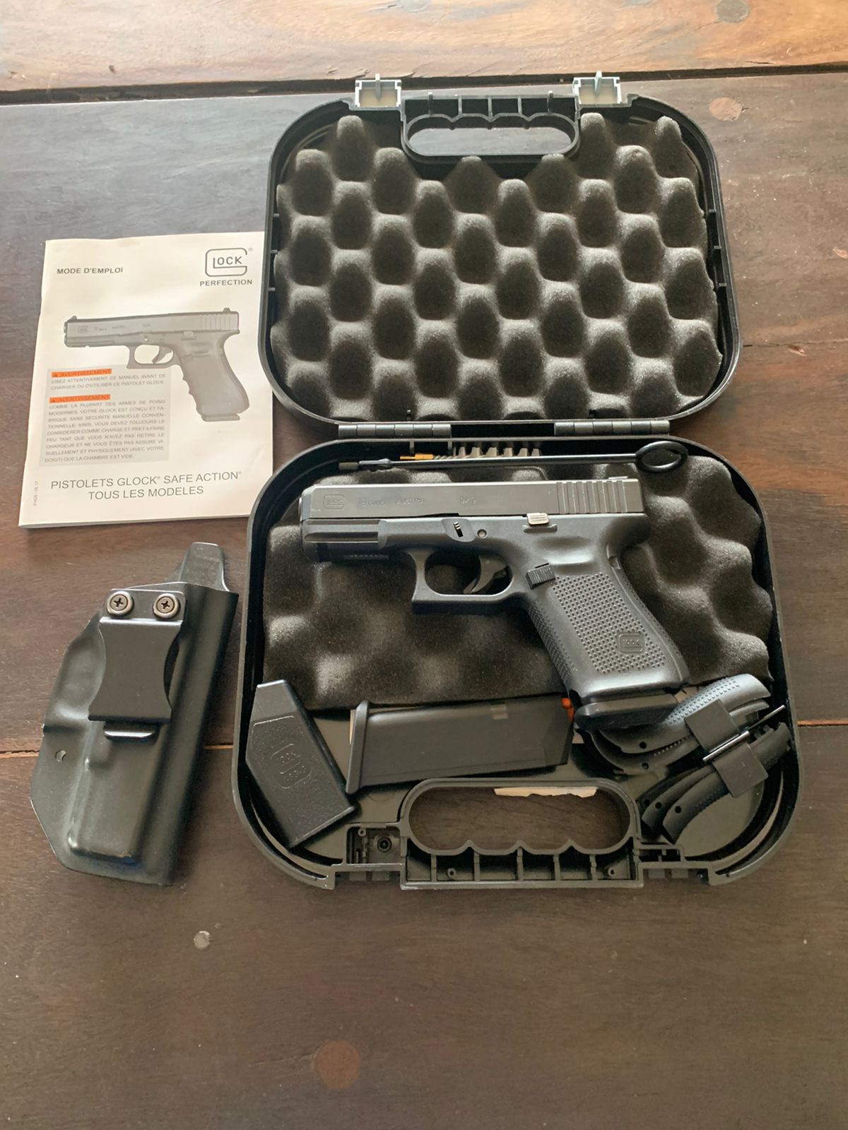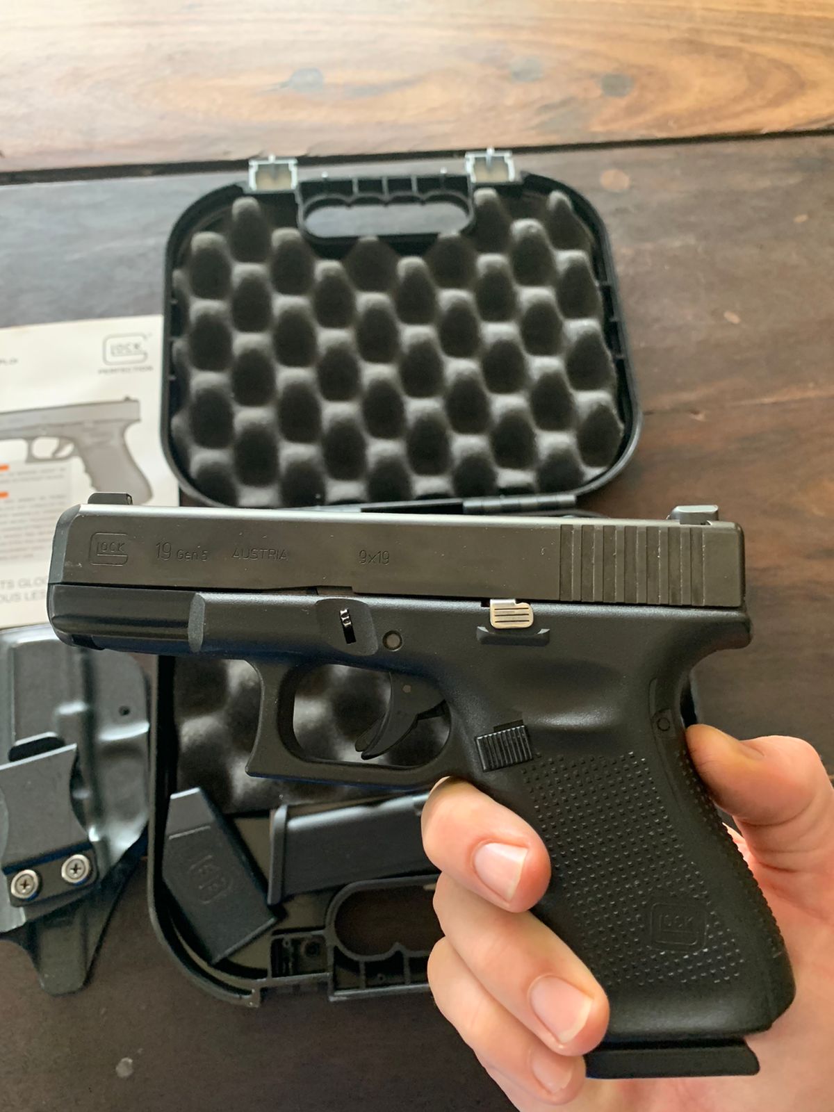 Glock 19 Gen 5 complete with all spares and extras as seen in the pictures. Extras include trijicon night sights, and concealed carry holster. Original sights included, 2 magazines, grip straps, cleaning kit, case, quick round loader. Around 240 rounds fired, in excellent condition.