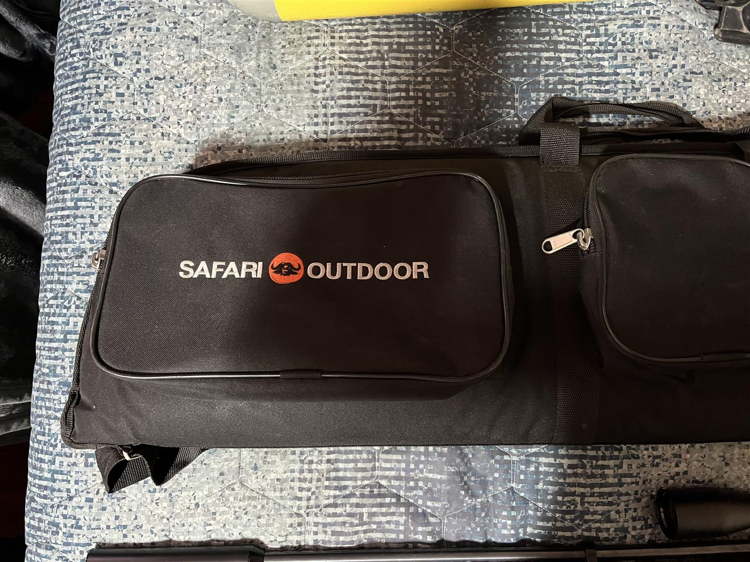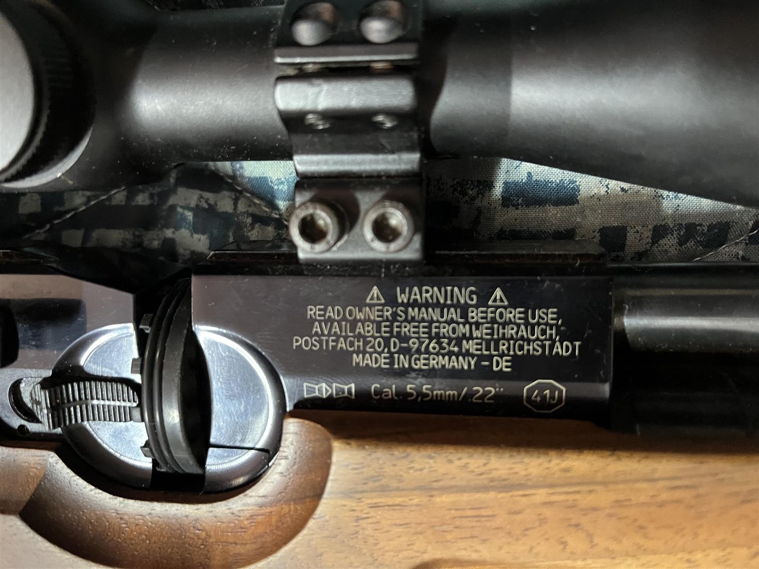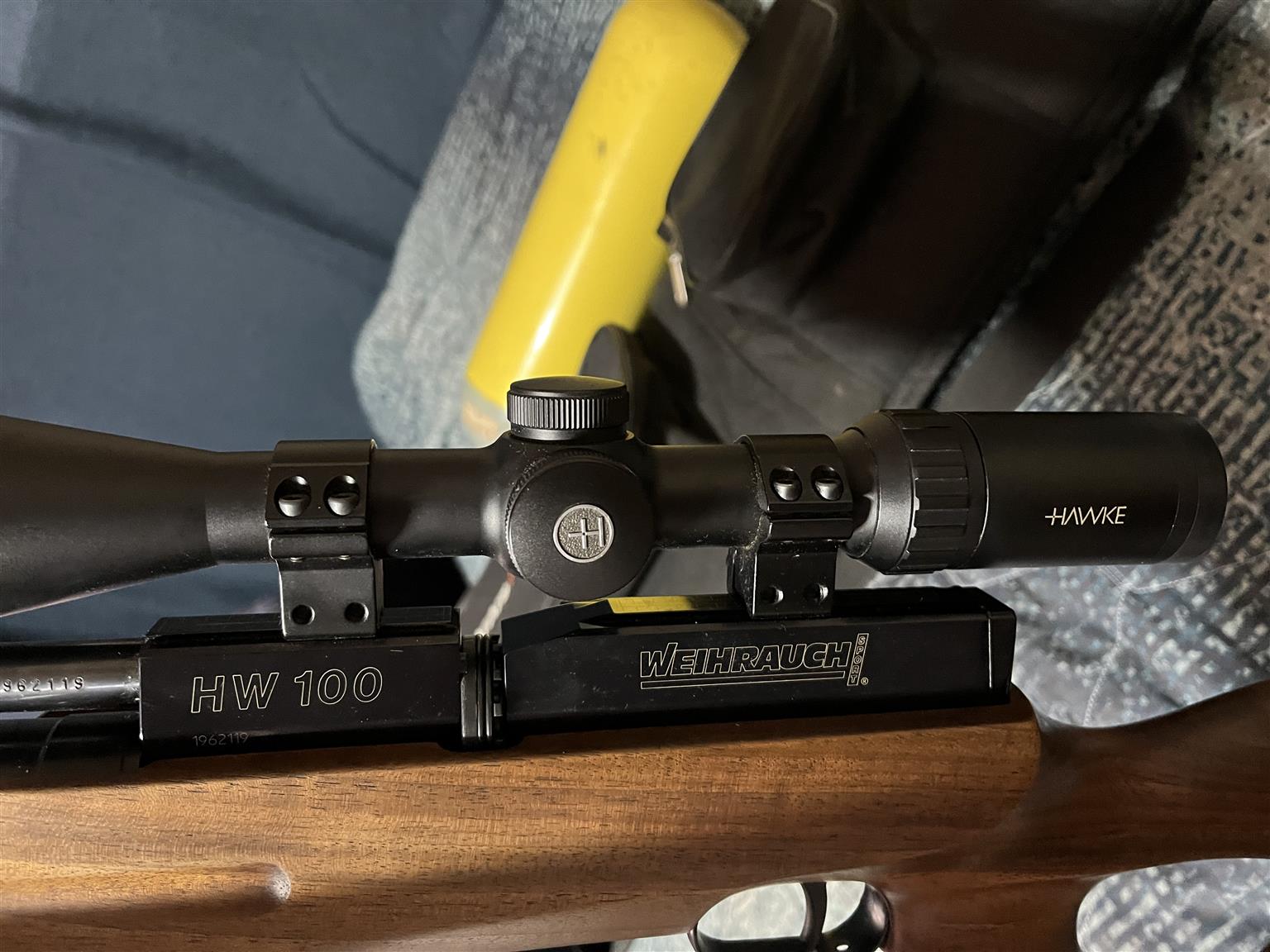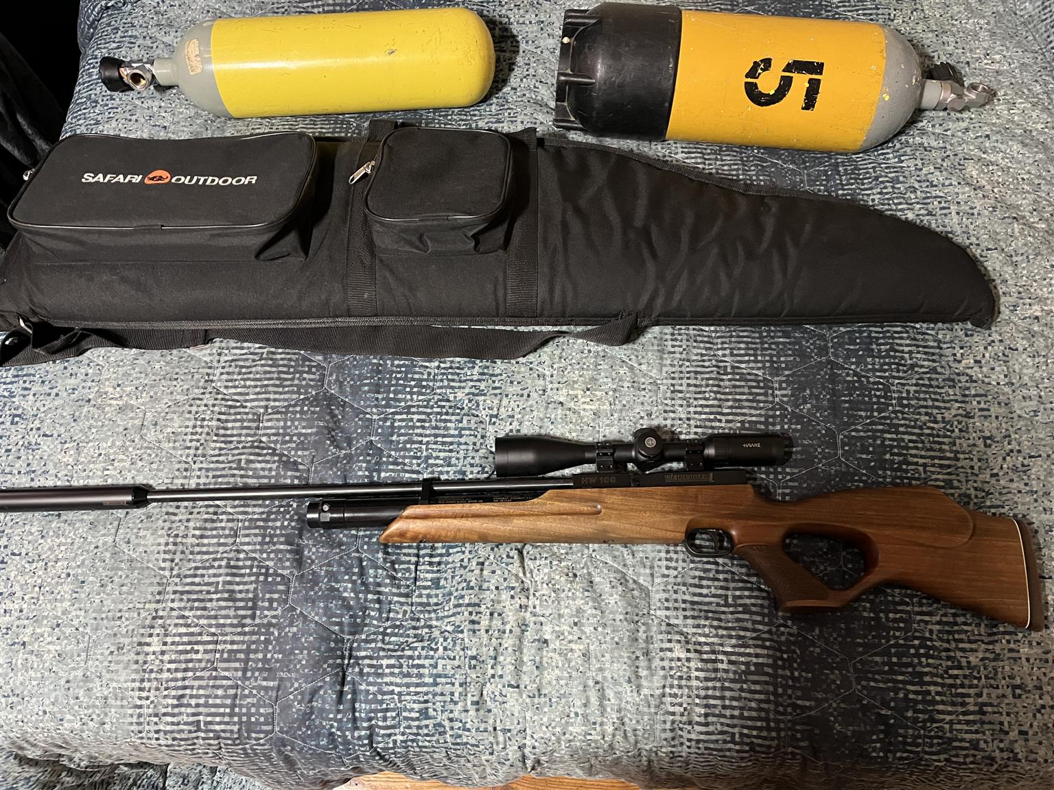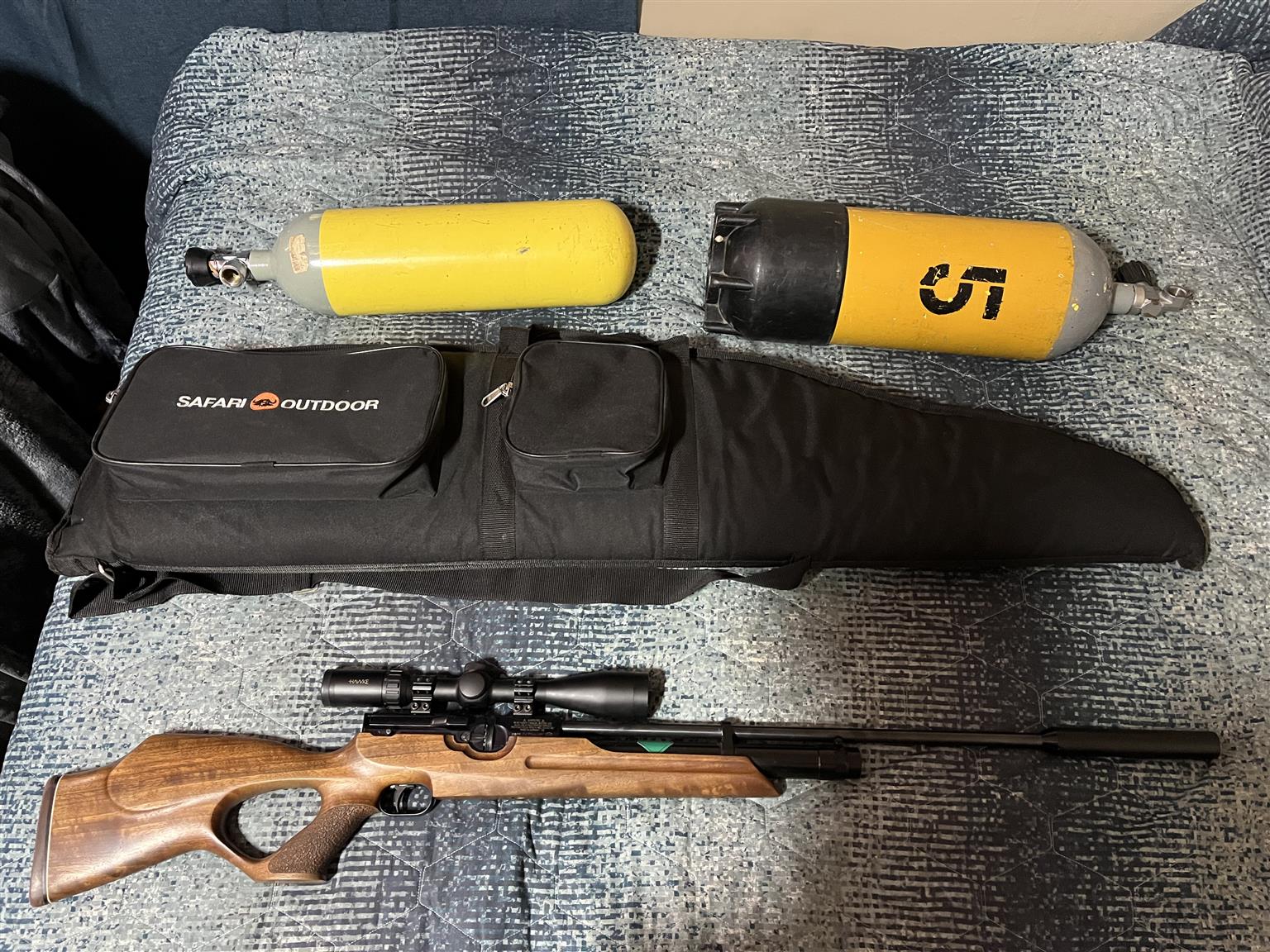 Weihrauch HW100 Sport Air Rifle with a Hawke Scope and added suppressor. Shoots 5.5 /.22. Comes with Safari Outdoor gun bag and 2 scuba tanks.