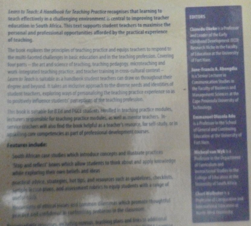 Learn to Teach . A Handbook for teaching Practice Published by Oxford Edited by C Okeke . Abongdia . Adu ... 2020 5th Ed. Condition : v good ; title page slightly marked R200 Postage : by the courier of your choice Postnet /Courier guy/Express etc...plus R10 for packaging if local = Durban Westville = collect / deliver Contact Toni or steve at Email Cell or