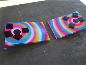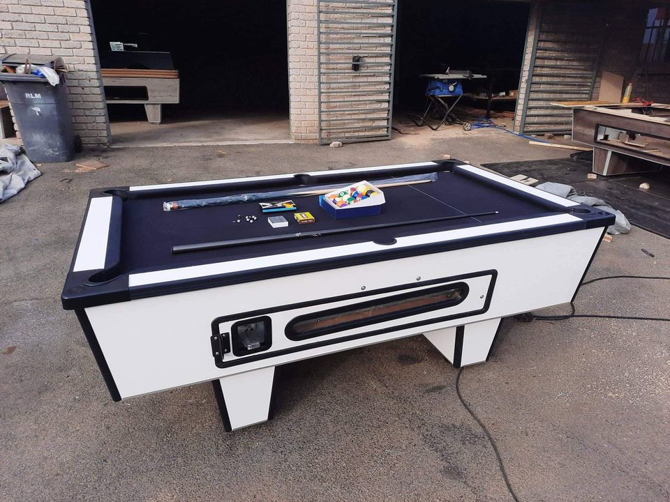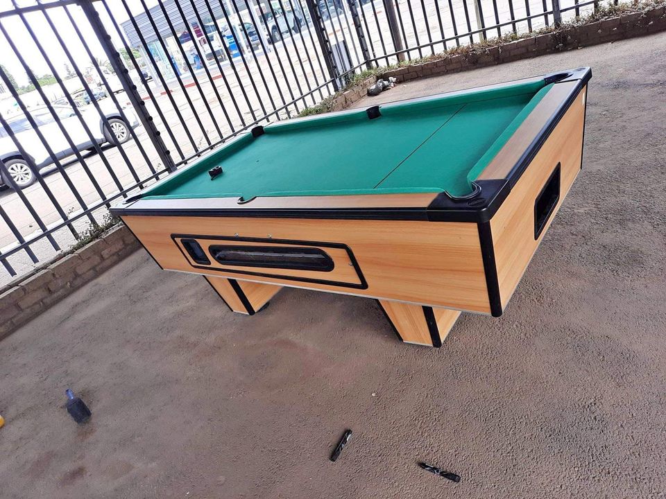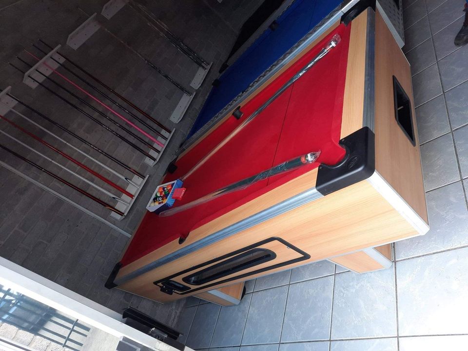 New table comes with 2 cue sticks,1 set of balls, triangle, box of chalks, and 8 tips