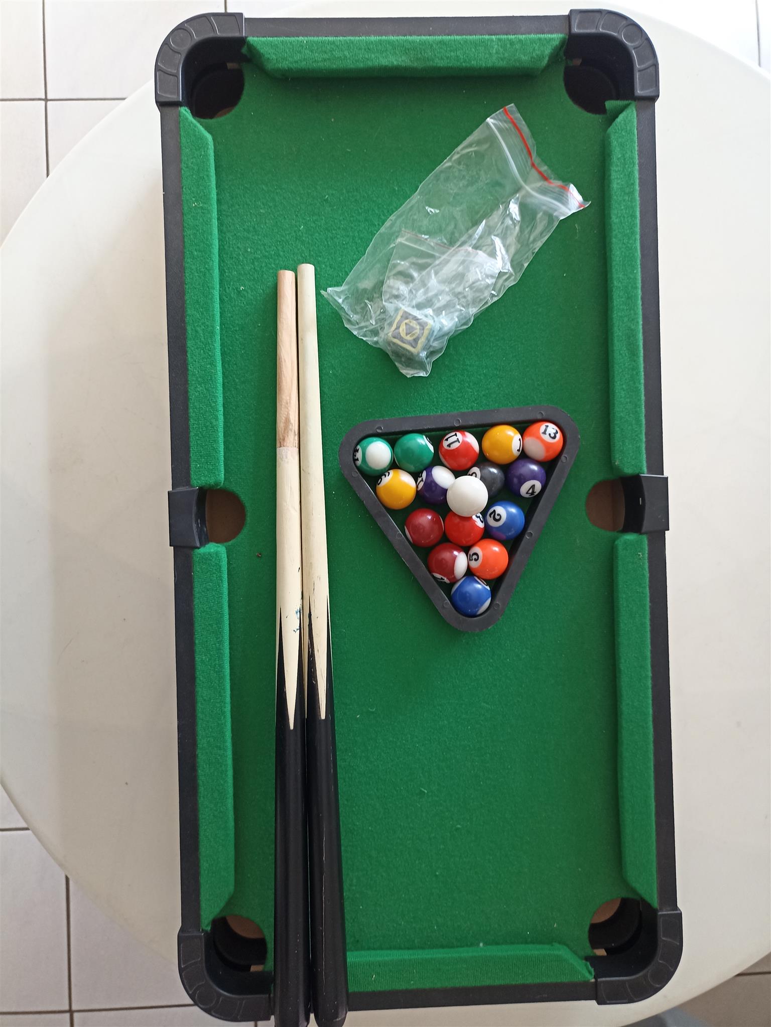 Table Top Pool Game15 balls plus 1 cue ballWith triangle setterSize 600x300mmGood condition