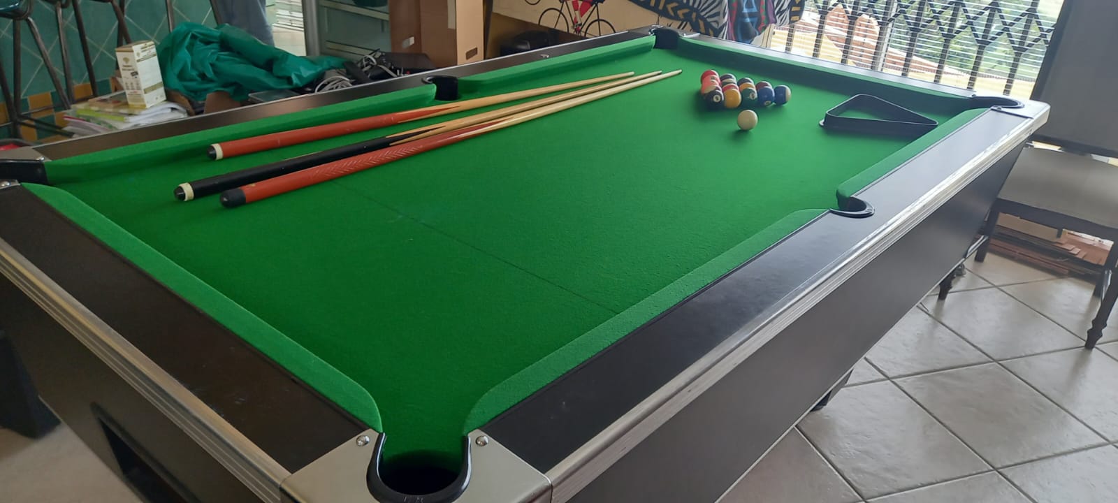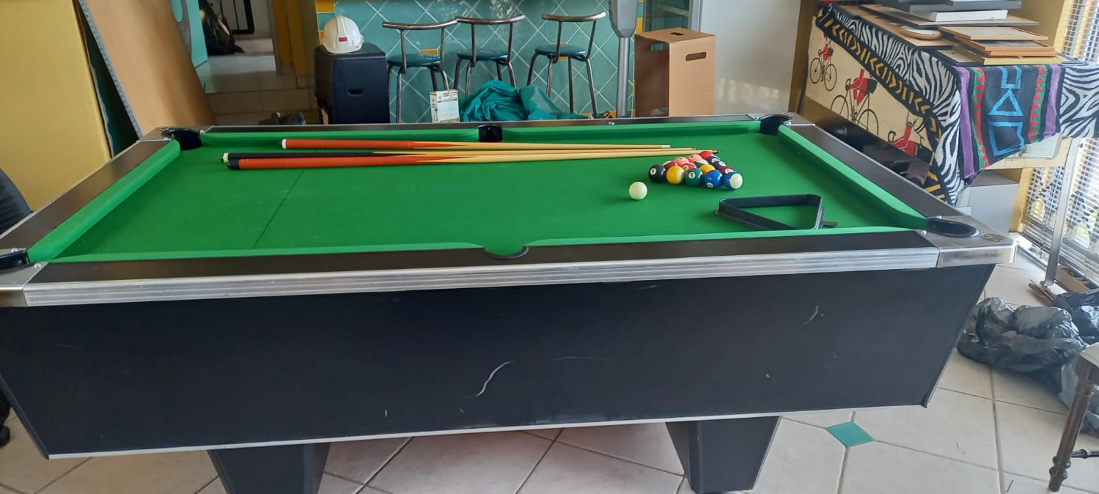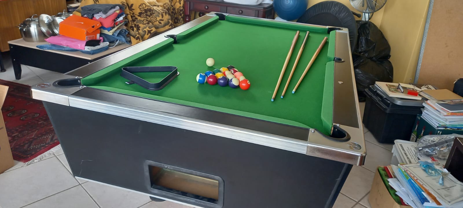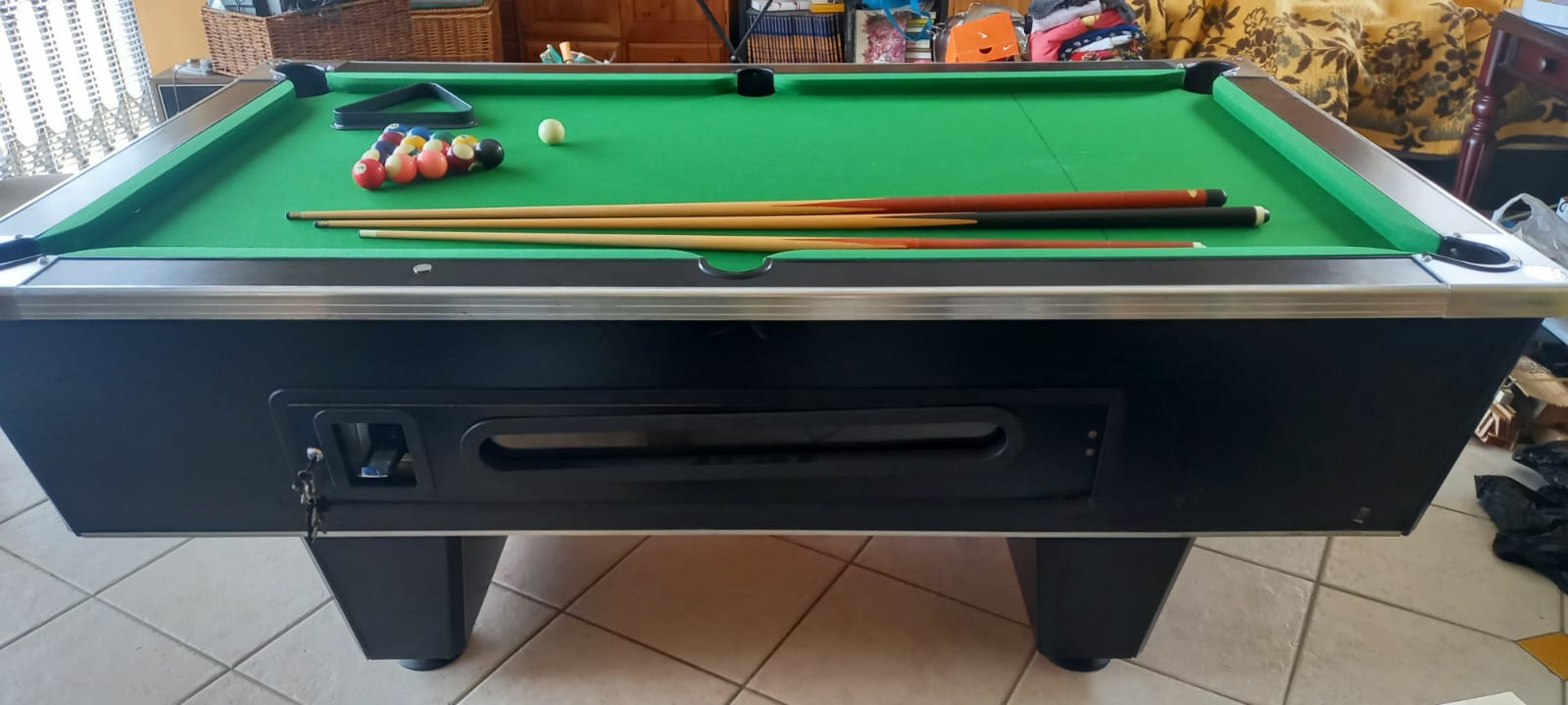 Good Condition snooker table with R2 coin mechanism plus set of balls plus three cues. This is a Slate top and not the cheap wooden top snooker table