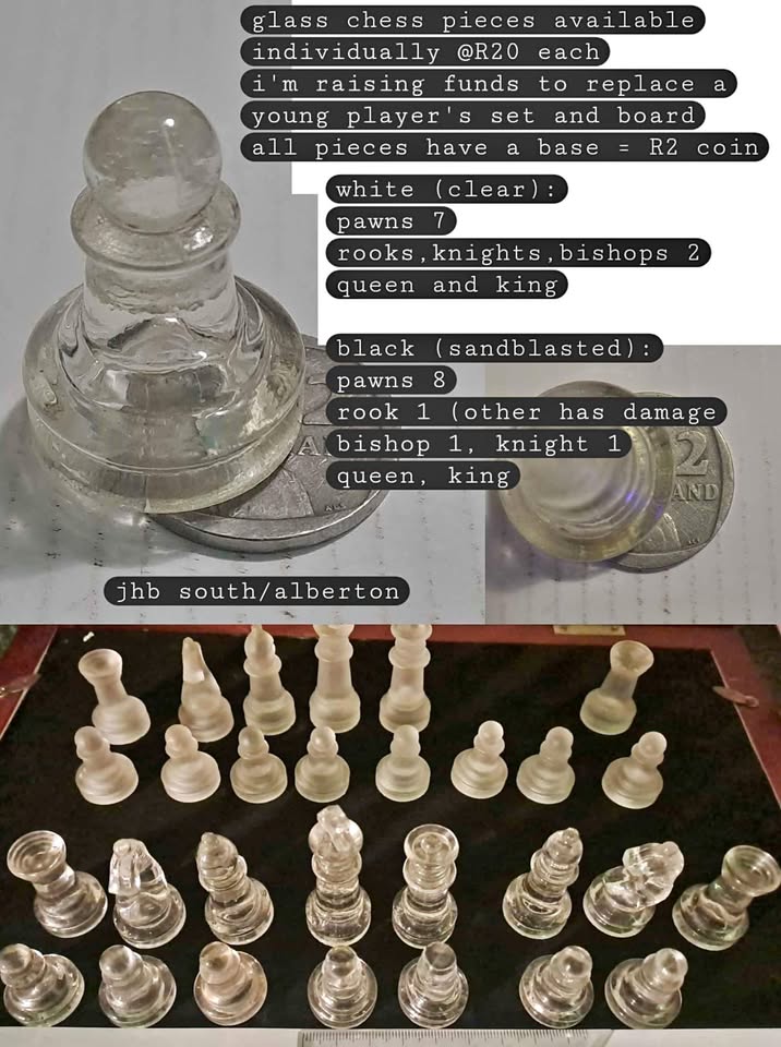 Glass Chess Set Pieces available individually at R20 each. Pieces are from the smaller set. Raising funds to replace an entire set. if you have an incomplete set or the missing pieces to mine dm me, i will offer to buy yours. pieces fit on a R2 coin, the larger set on marketplace will fit on a R5 coin. if you need the larger pieces dm me as well, i know of someone selling the larger set individual pieces as well.