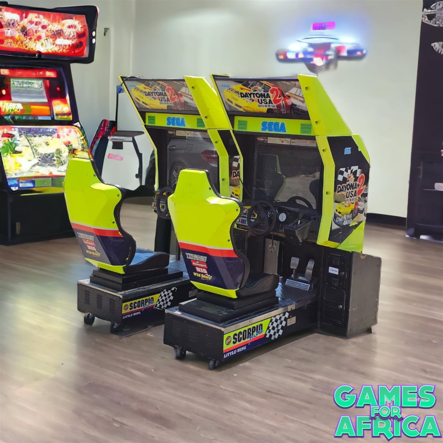 R49 995 Daytona USA 2 racing car Twin Battle on the edge video racing arcade games It is an arcade racing game released by Sega in 1998 as a follow-up to the extremely successful Daytona USA. The game featured vastly superior graphics, utilizing the Sega Model 3 hardware.
