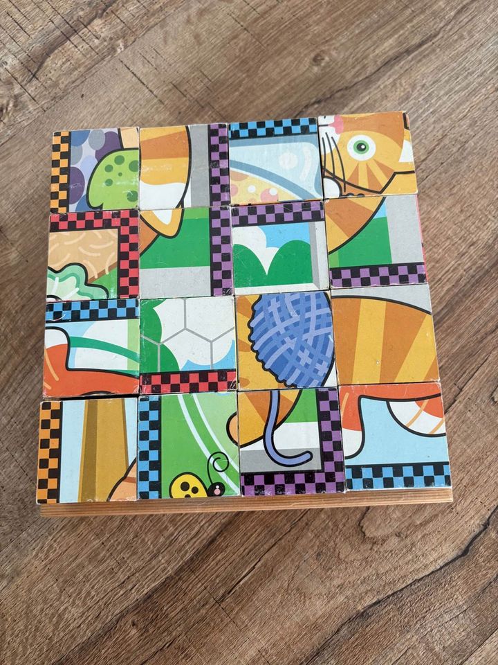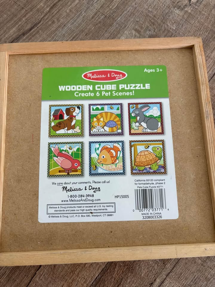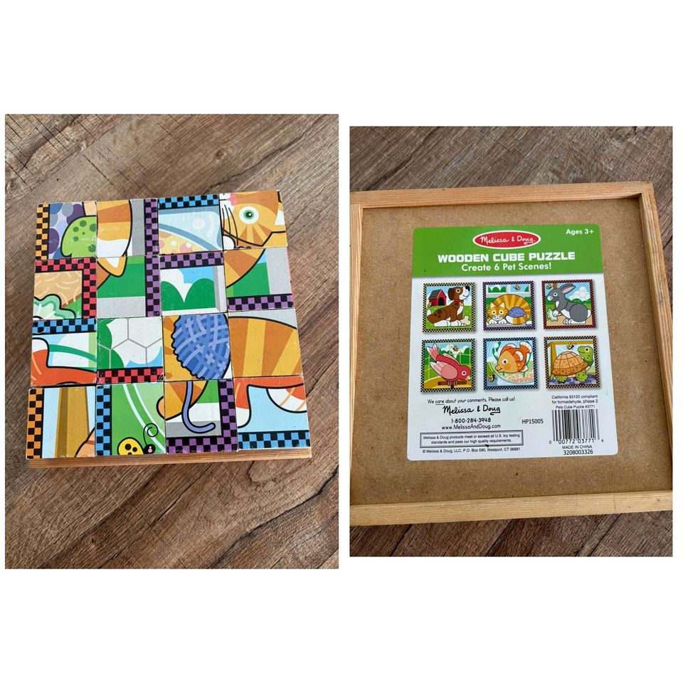 Melissa & Doug wooden Cube Puzzle. R180. Good condition. Collection in Seapoint. There are 16 solid wooden cubes in this unique puzzle. Rotate the cubes in the included wooden tray to complete colourful pictures of six different Pet scenes. (The border design provides a helpful hint).