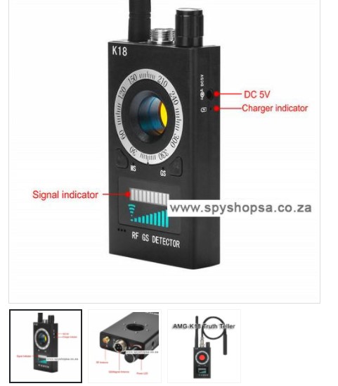 New Professional DIY Anti Spy Detector for Sale in South Africa with RF / RW Signal Tracker, Magnetic Field Detection, GSM / Quad Band / GPRS Bug Locator, Camera Lens Finder and 3000mAh Long Life Battery! Used to locate gsm bugs, trackers & spying tools in your car, home and office! This is NOT A SIGNAL JAMMER!